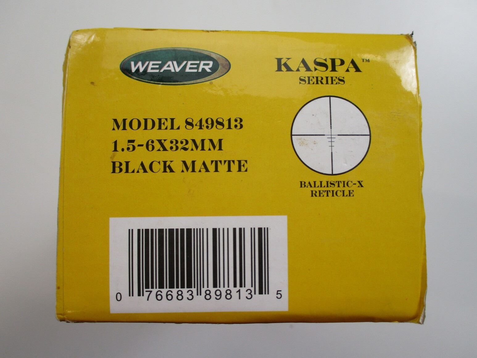 WEAVER 1.5-6X32MM RIFLE SCOPE , CLEAR OPTICS, BALLISTIC-X RETICLE, 30MM TUBE DIAMETER, MATTE FINISH, SERIAL # 849813, WITH FLIP UP LENS CAPS, COMES IN ORIGINAL PACKAGE.