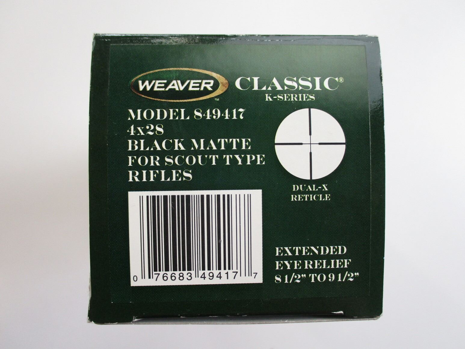 WEAVER CLASSIC K-SERIES 4X 28MM SCOPE , CLEAR OPTICS, DUPLEX RETICLE, 1" TUBE DIAMETER, MATTE FINISH, SERIAL # 849417, WITH BIKINI STYLE LENS CAPS, IN ORIGINAL PACKAGE. NOTE: EXTENDED EYE RELIEF 8.5" TO 9.5".
