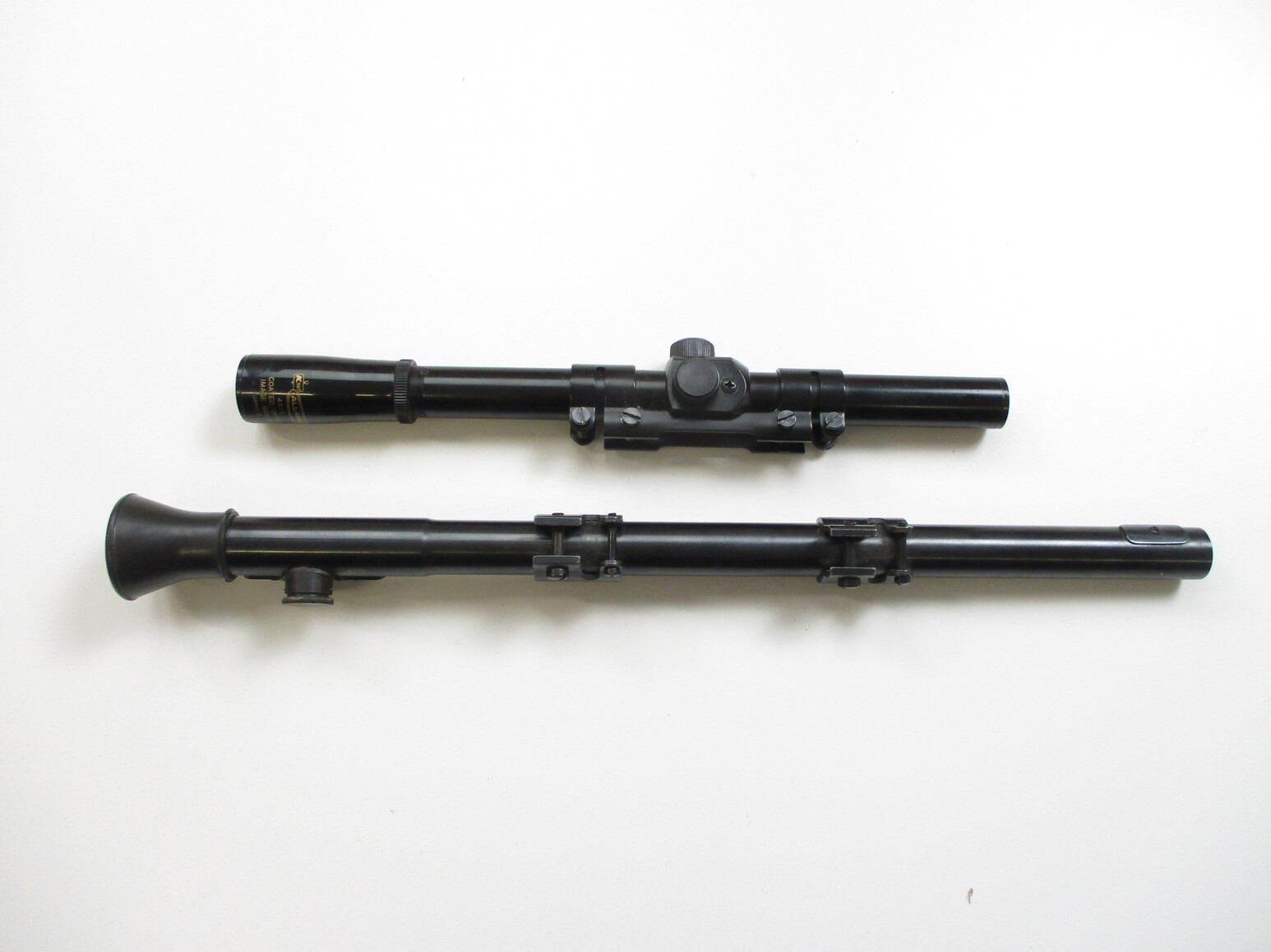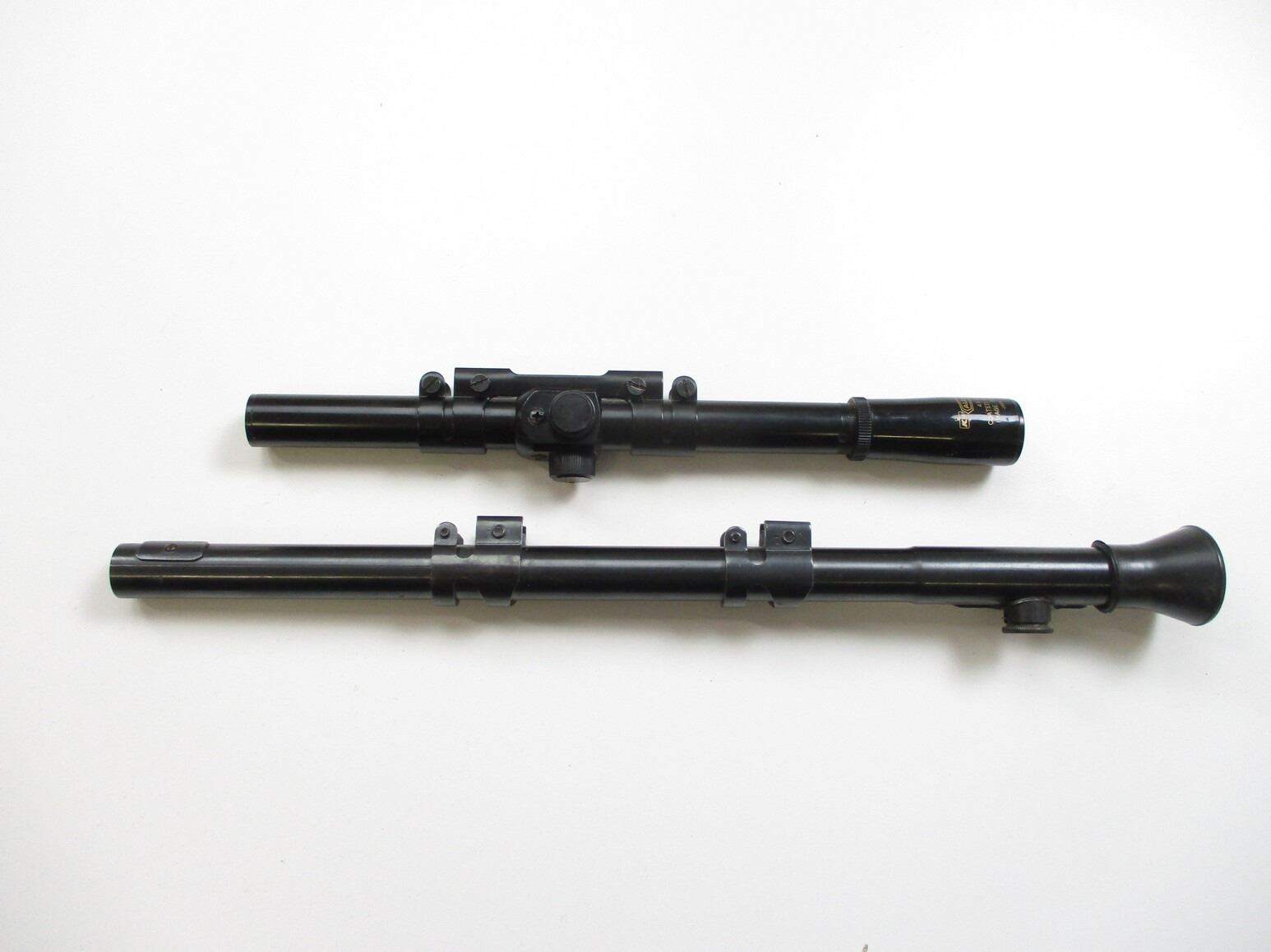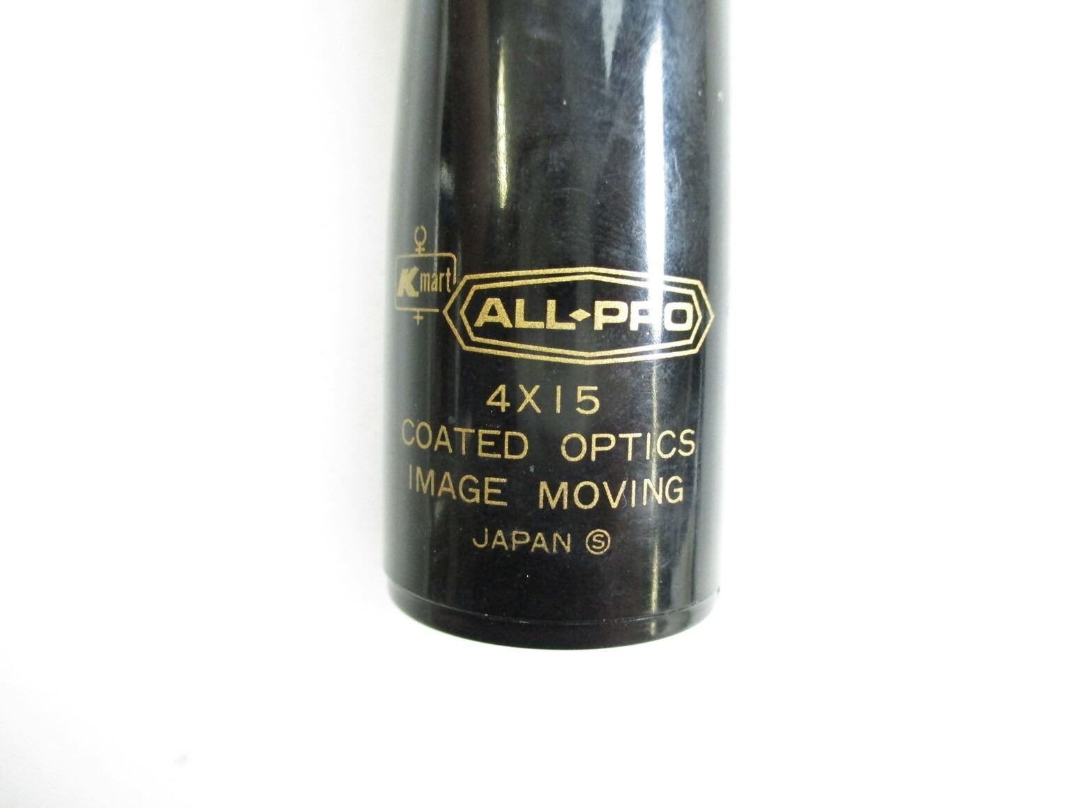 ASSORTED .22 STYLE RIFLE SCOPES , (1) UNKNOWN .22 SCOPE, POSSIBLY 4X POWER, CLEAR OPTICS, CROSSHAIR RETICLE, 0.75" TUBE DIAMETER, INCLUDES TIP-OFF STYLE SCOPE RINGS. REAR EYE CUP, (1) ALL.PRO 4X15 RIFLE SCOPE, CLEAR OPTICS, CROSSHAIR RETICLE, 0.75" TUBE DIAMETER, WITH TIP-OFF TYPE SCOPE RINGS.
