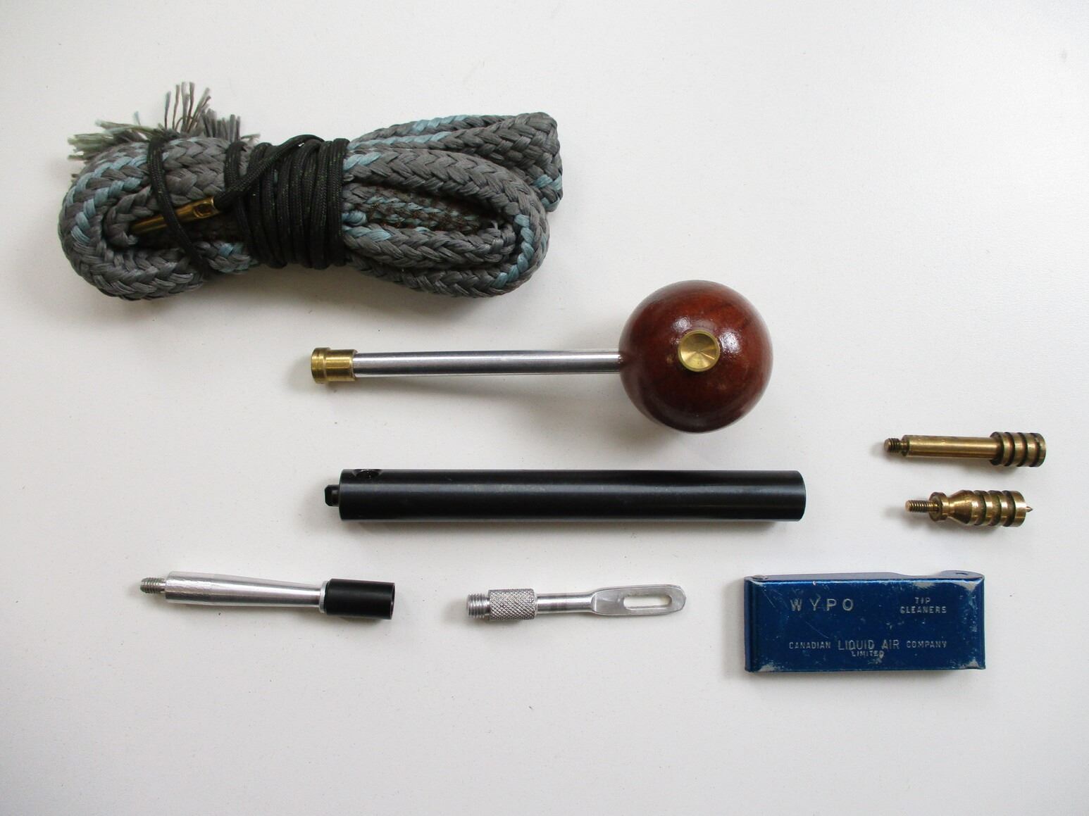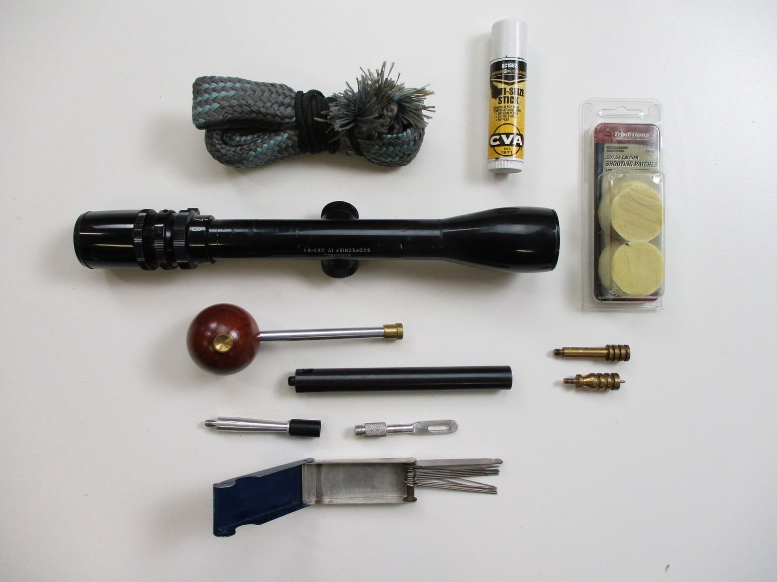 BUSHNELL SCOPECHIEF IV 2.5-8X RIFLE SCOPE ETC, CLEAR OPTICS, CROSSHAIR RETICLE, 1" TUBE DIAMETER, GLOSS FINISH, USED, ALSO INCLUDES ASSORTED MUZZLE LOADING ACCESSORIES, & .50CAL BORE SNAKE.