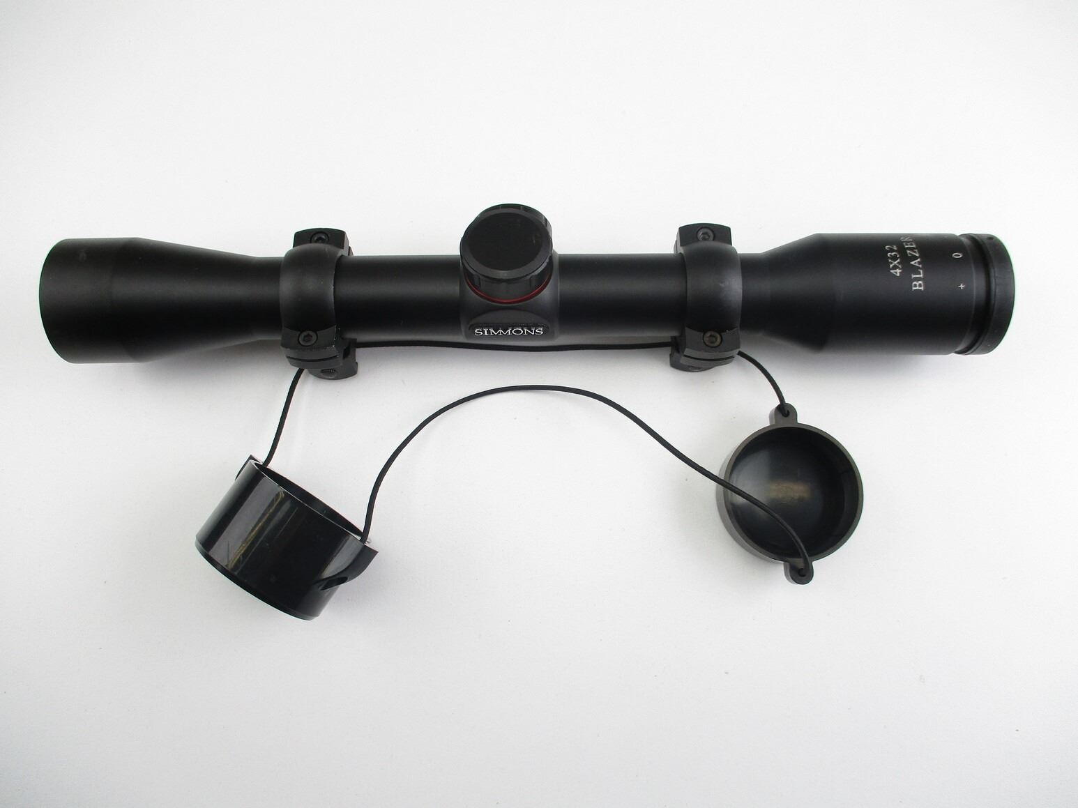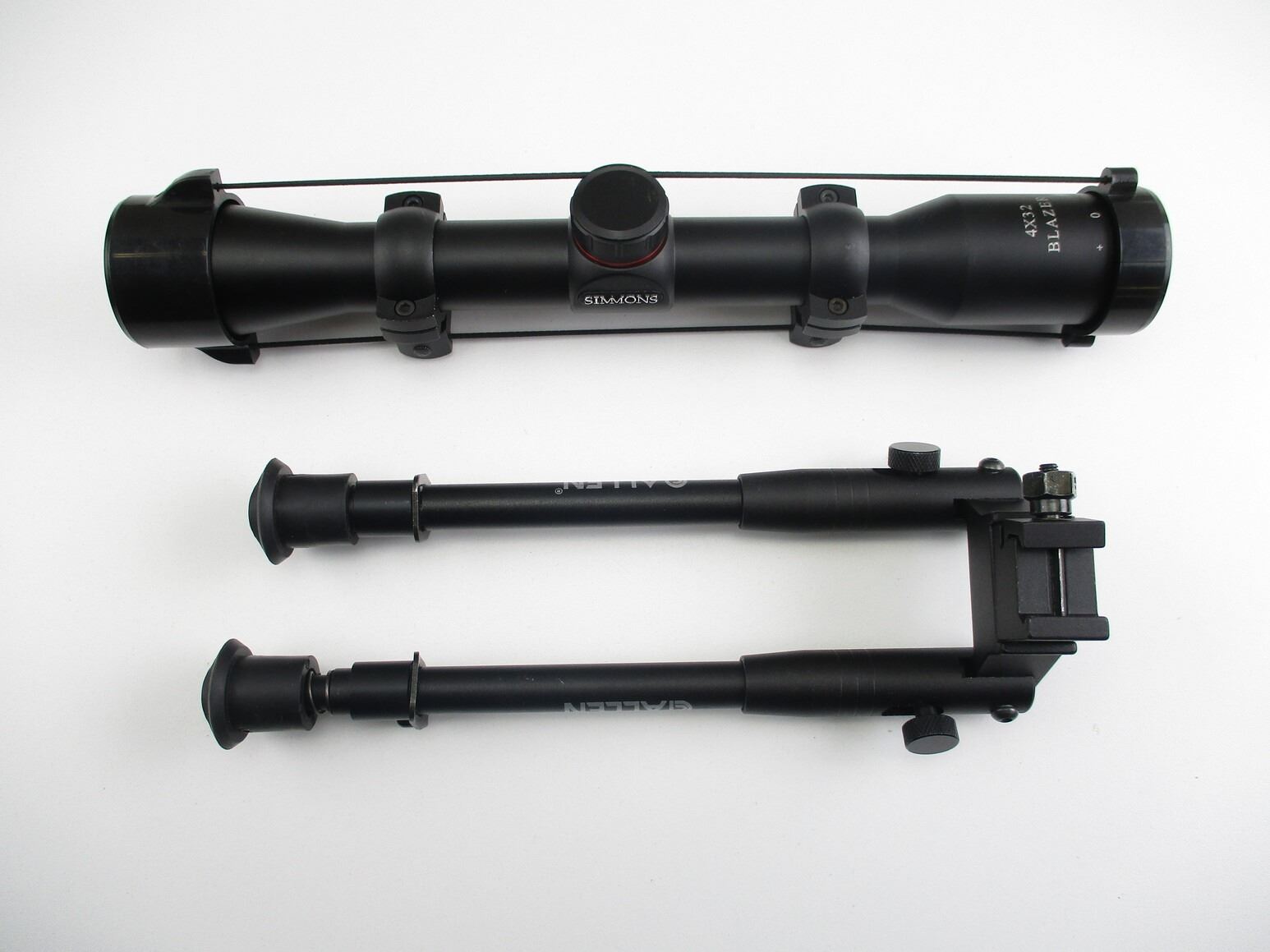SIMMONS BLAZER 4X32 RIFLE SCOPE & BI-POD , CLEAR OPTICS, DUPLEX RETICLE, 1" TUBE DIAMETER, WITH 1" INCOMPLETE SCOPE RINGS. FITS PICATINNY / WEAVER STYLE RAILS, BIKINI STYLE LENS CAPS, (1) ALLENs BI-POD, WITH PICATINNY STYLE ATTACHMENT BRACKET, RUBBER FEET, SPRING LOADED LEGS, APPROX. 9.25" TO 11.75" IN HEIGHT.