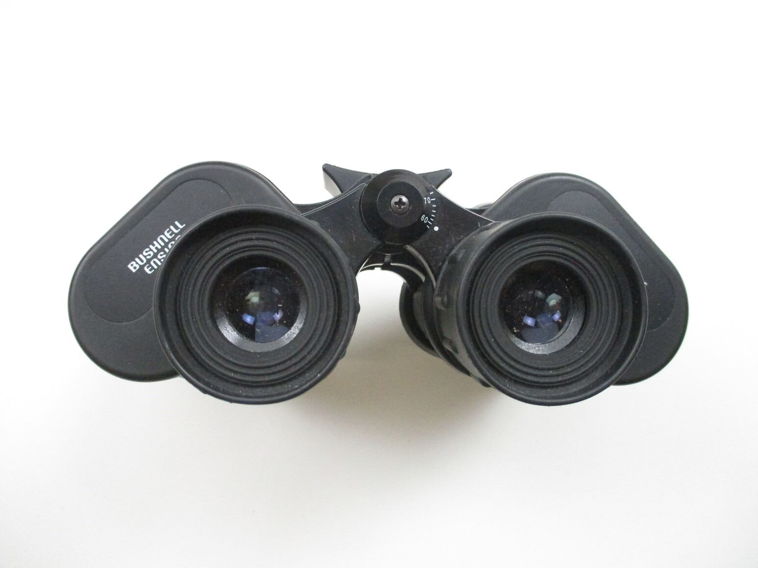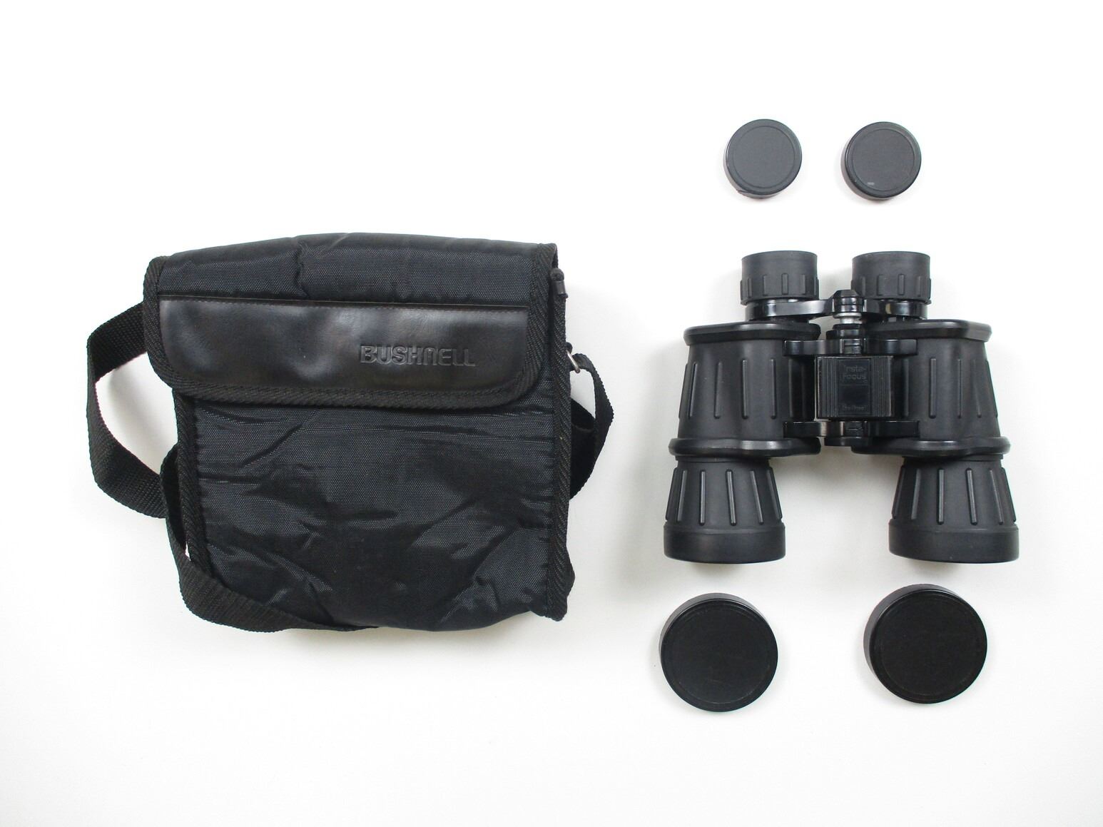 BUSHNELL ENSIGN 10X 50 BINOCULARS , CLEAR OPTICS, FOCUS WORKS, RUBBER TEXTURE, INCLUDES FRONT & REAR LENS CAPS, & NYLON CARRY BAG.