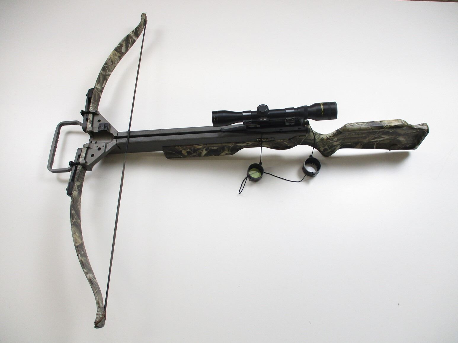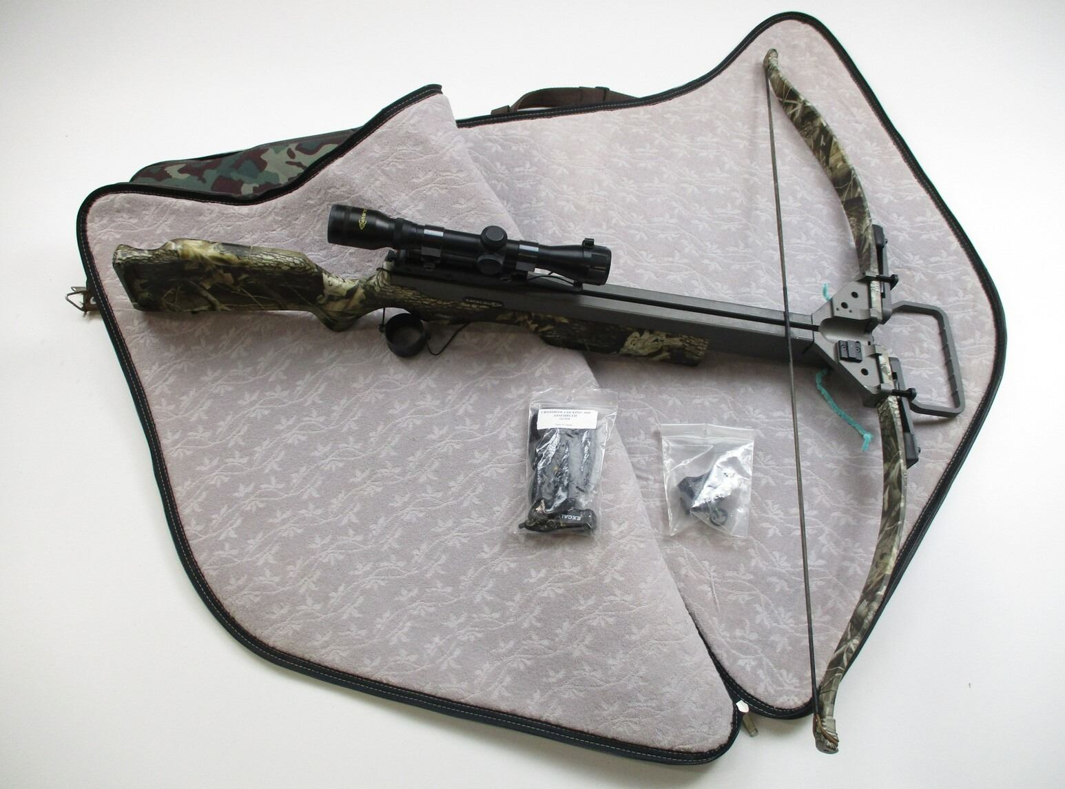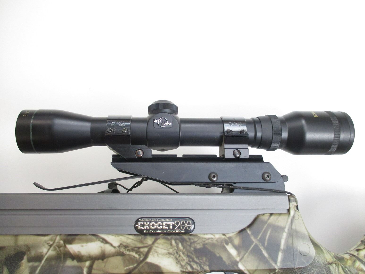 EXCALIBUR EXOCET 200 CROSSBOW , APPROX. 200 LB DRAW WEIGHT, 15.5" STROKE, APPROX. VELOCITY: 330FPS, APPROX. 38.5" OAL. INCLUDES EXCALIBUR 2.5X 32 CROSSBOW SCOPE, CLEAR OPTICS, CROSSBOW RETICLE, INCLUDES BIKINI STYLE LENS CAPS, WEAVER 1" QD SCOPE RINGS USED TO ATTACH SCOPE. ALSO INCLUDES SEMI-PADDED SOFT CROSSBOW CARRY CASE, COCKING AID TOOL, & FRONT & REAR SIGHTS.