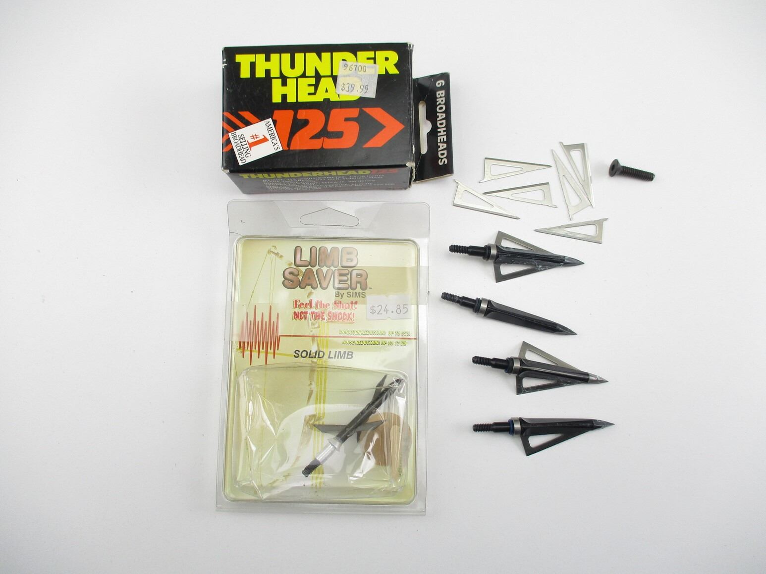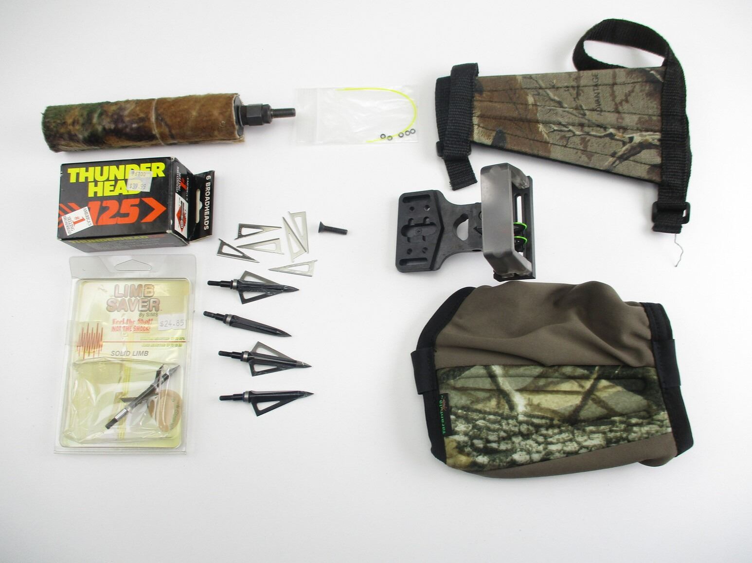 ASSORTED ARCHERY ACCESSORIES , INCLUDES: FIBER OPTICS COMPOUND BOW TYPE RETICLE, UNSURE OF MFG, MULTIPLE BROADHEADS, UNSURE OF GRAN, BOW COUNTER WEIGHT, ETC. SEE PHOTO.