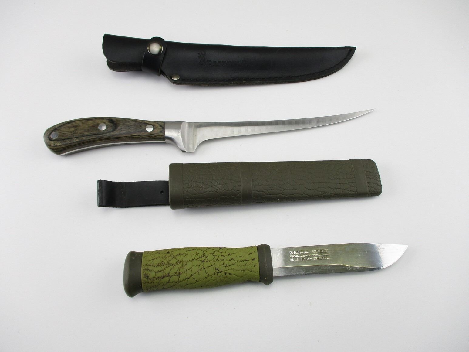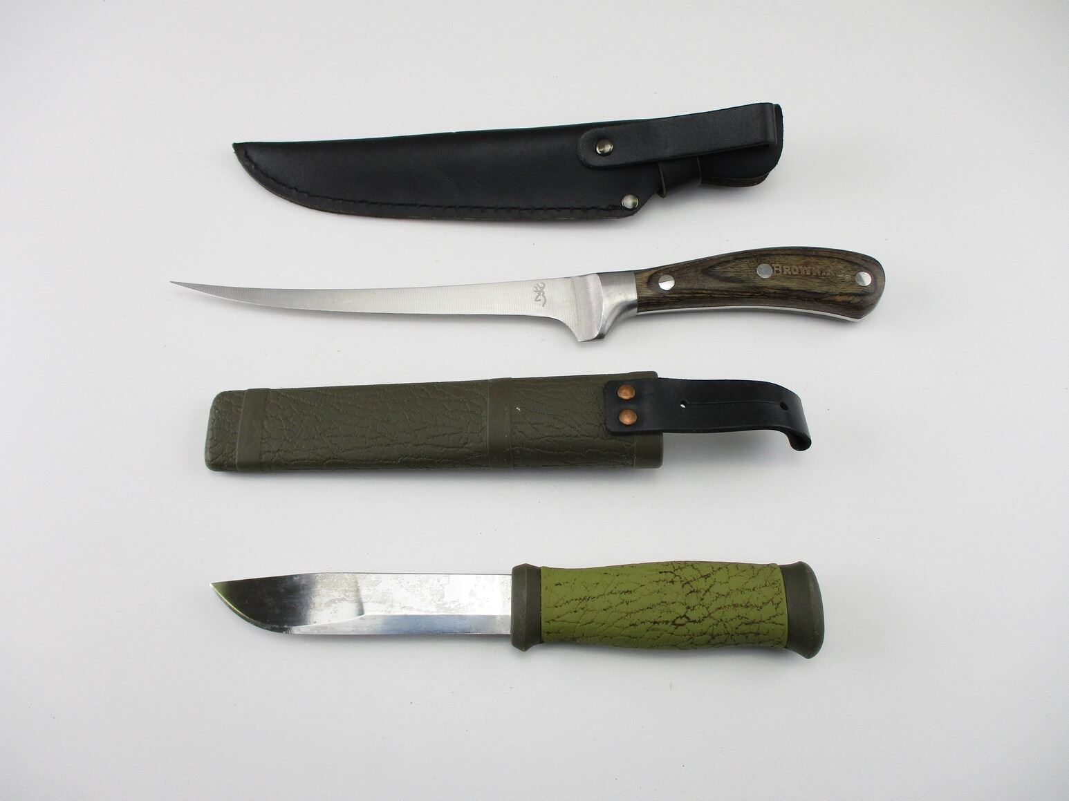ASSORTED FIXED BLADES , INCLUDES: (1) BROWNING FILLET STYLE KNIFE, APPROX. 7" STEEL BLADE, WITH WOODEN GRIPS & LEATHER SHEATH. (1) MORA 2000 FIXED BLADE, APPROX. 4.5" STAINLESS STEEL BLADE, WITH HARD RUBBER TYPE HANDLE & PLASTIC SHEATH.