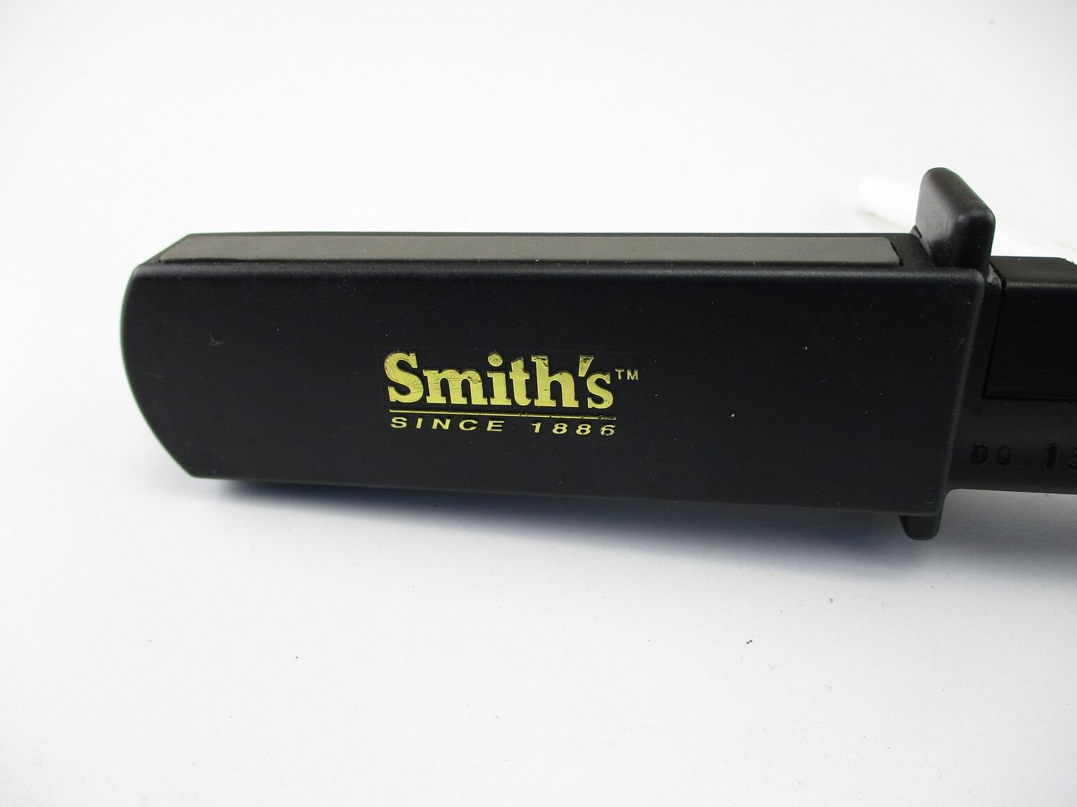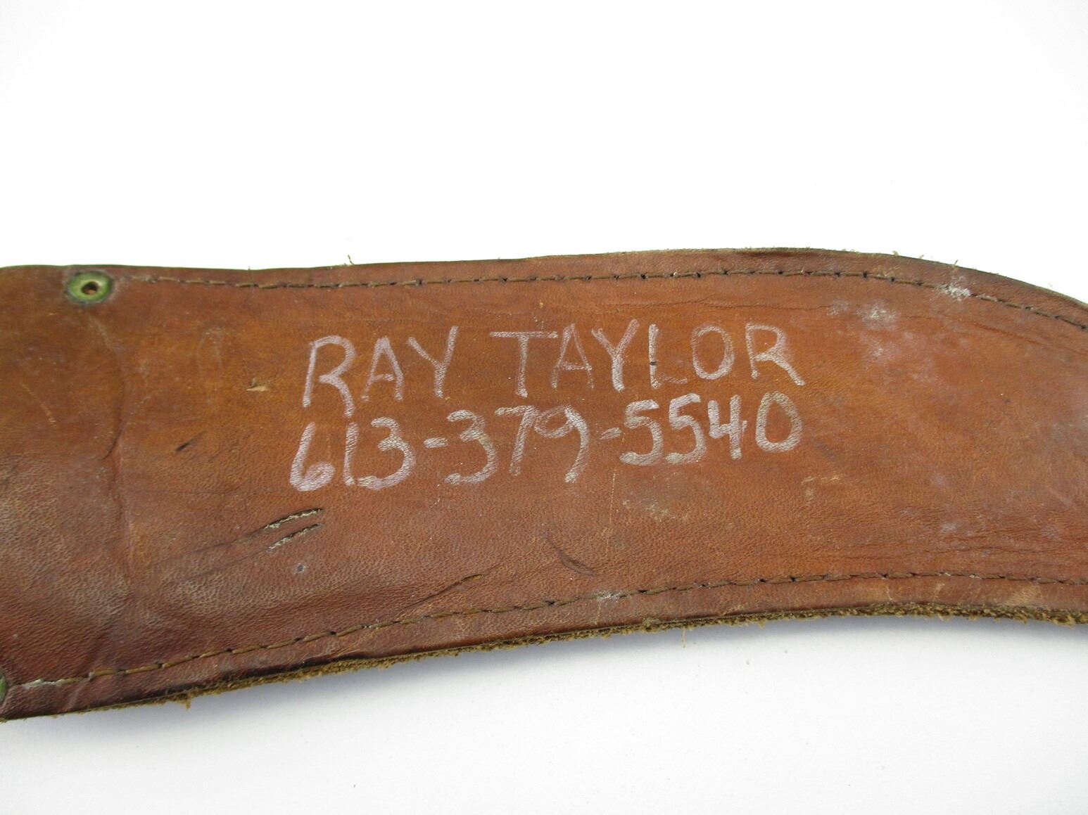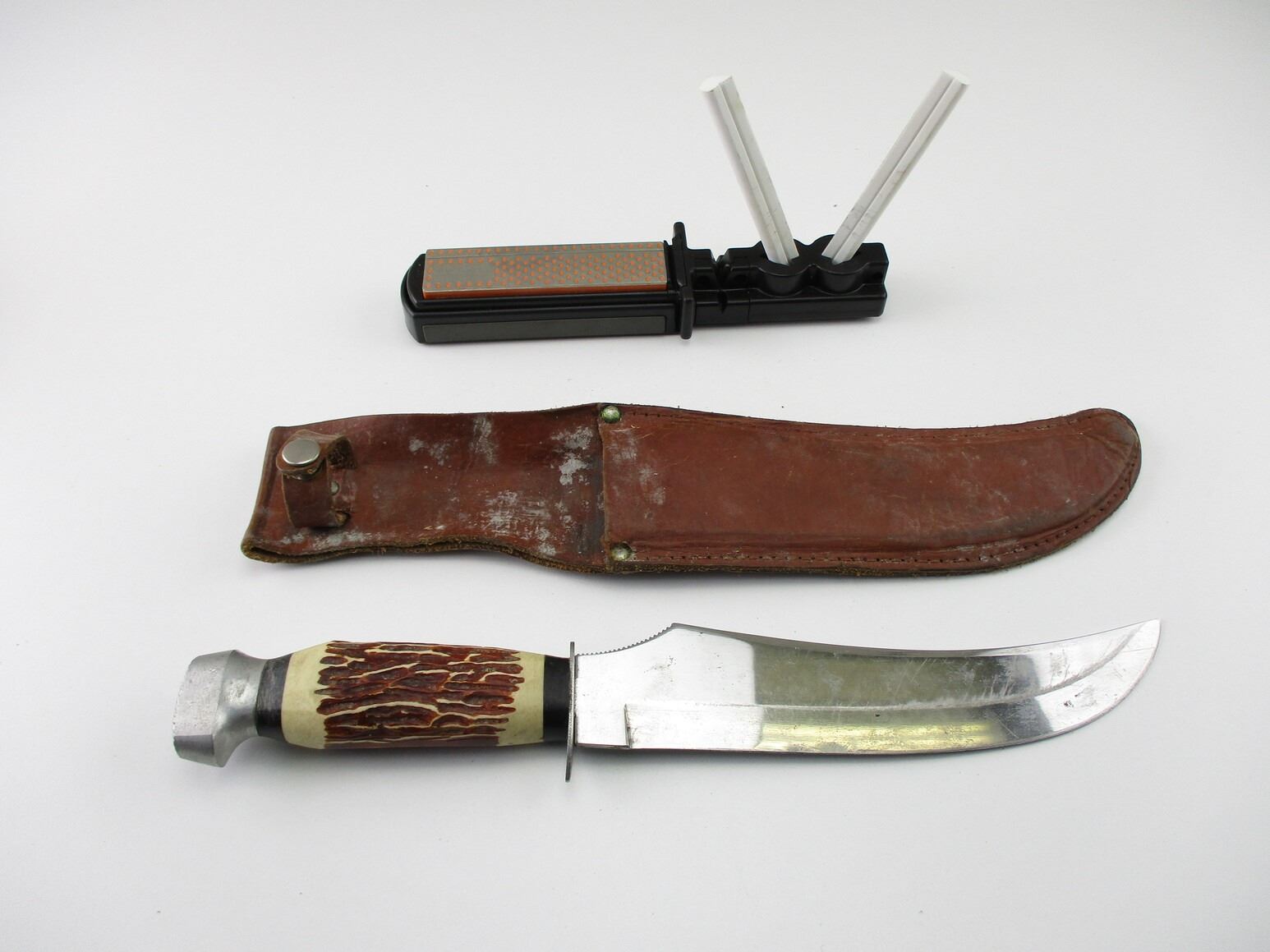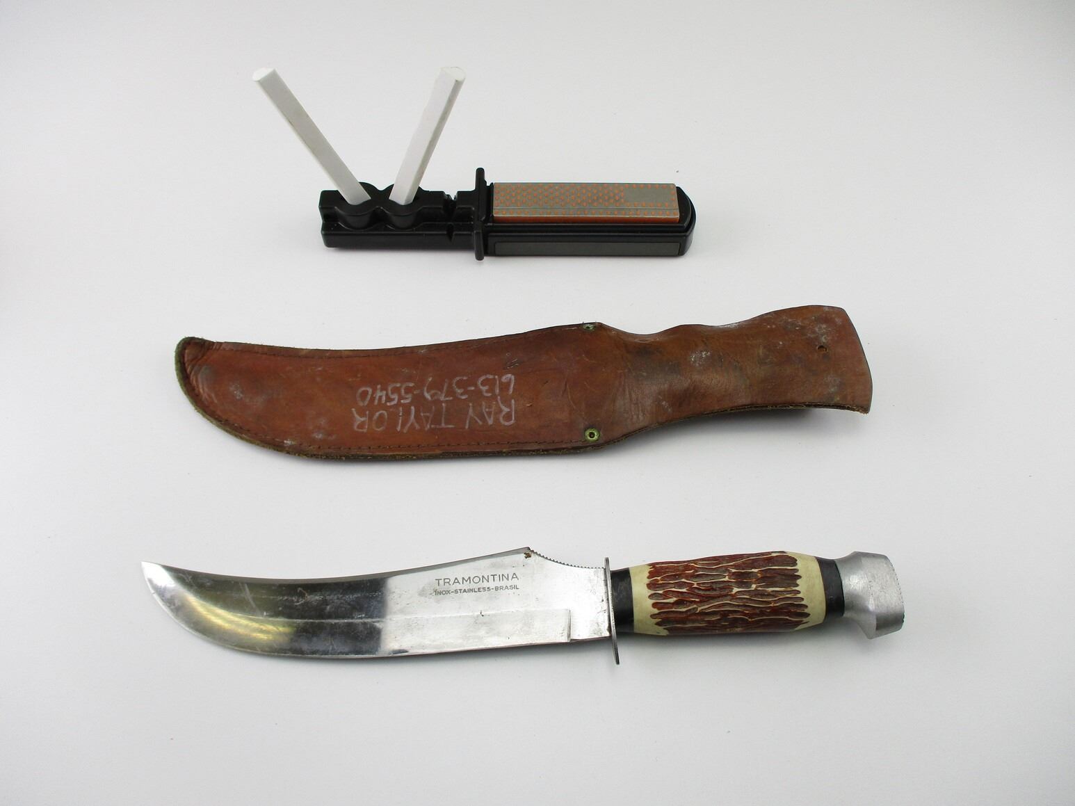 TRAMONTINA BOWIE TYPE KNIFE ETC, INOX-STAINLESS-BRASIL MARKED, APPROX. 8.25" OAL, WITH BONE TYPE HANDLE & LEATHER SHEATH, ALSO INCLUDES SMITHS KNIFE SHARPENING TOOL.