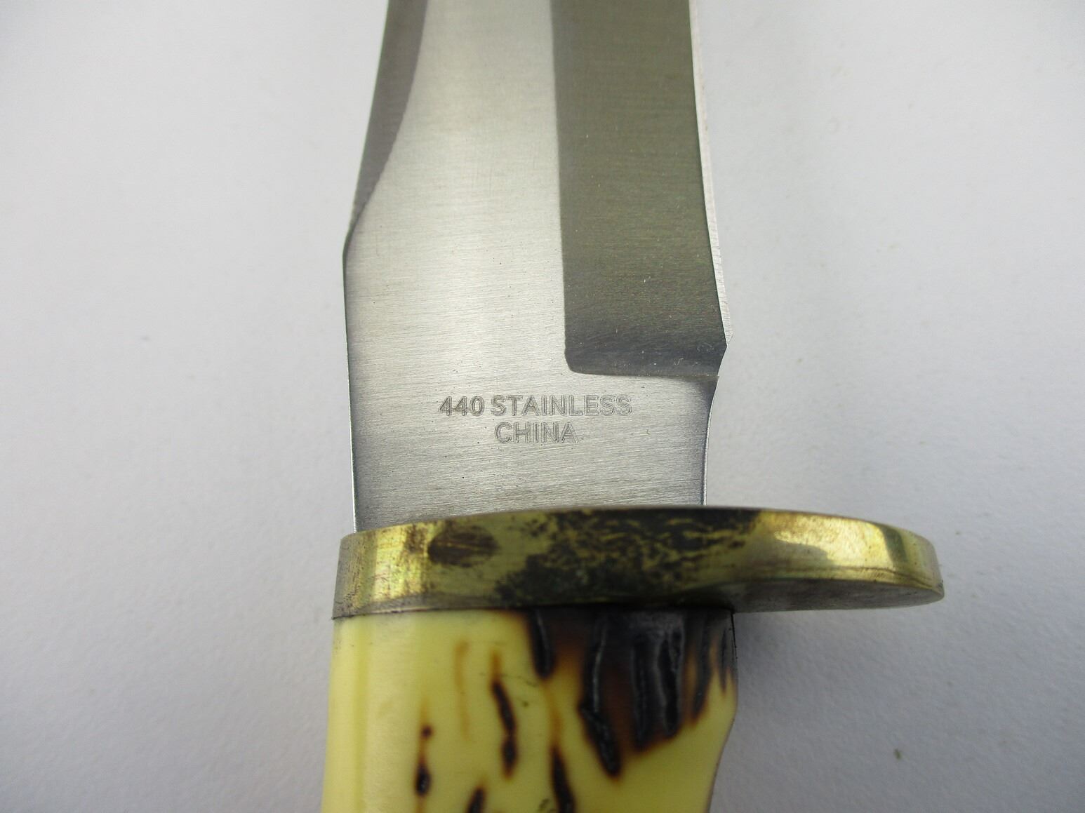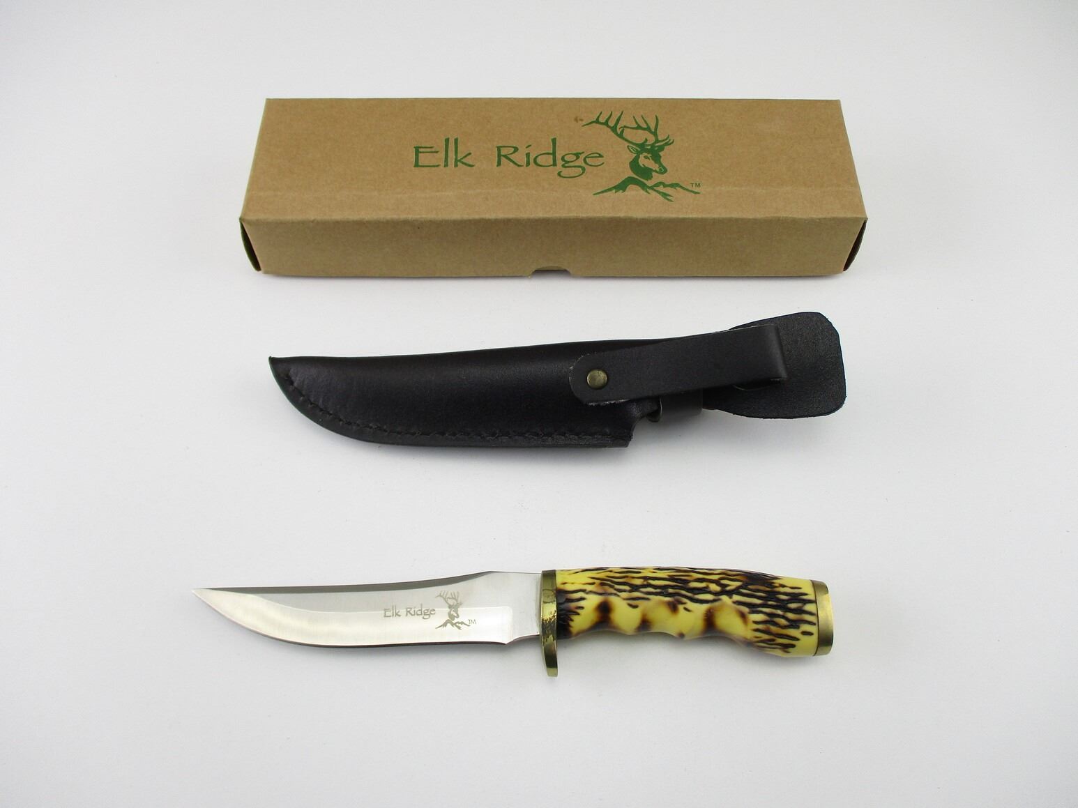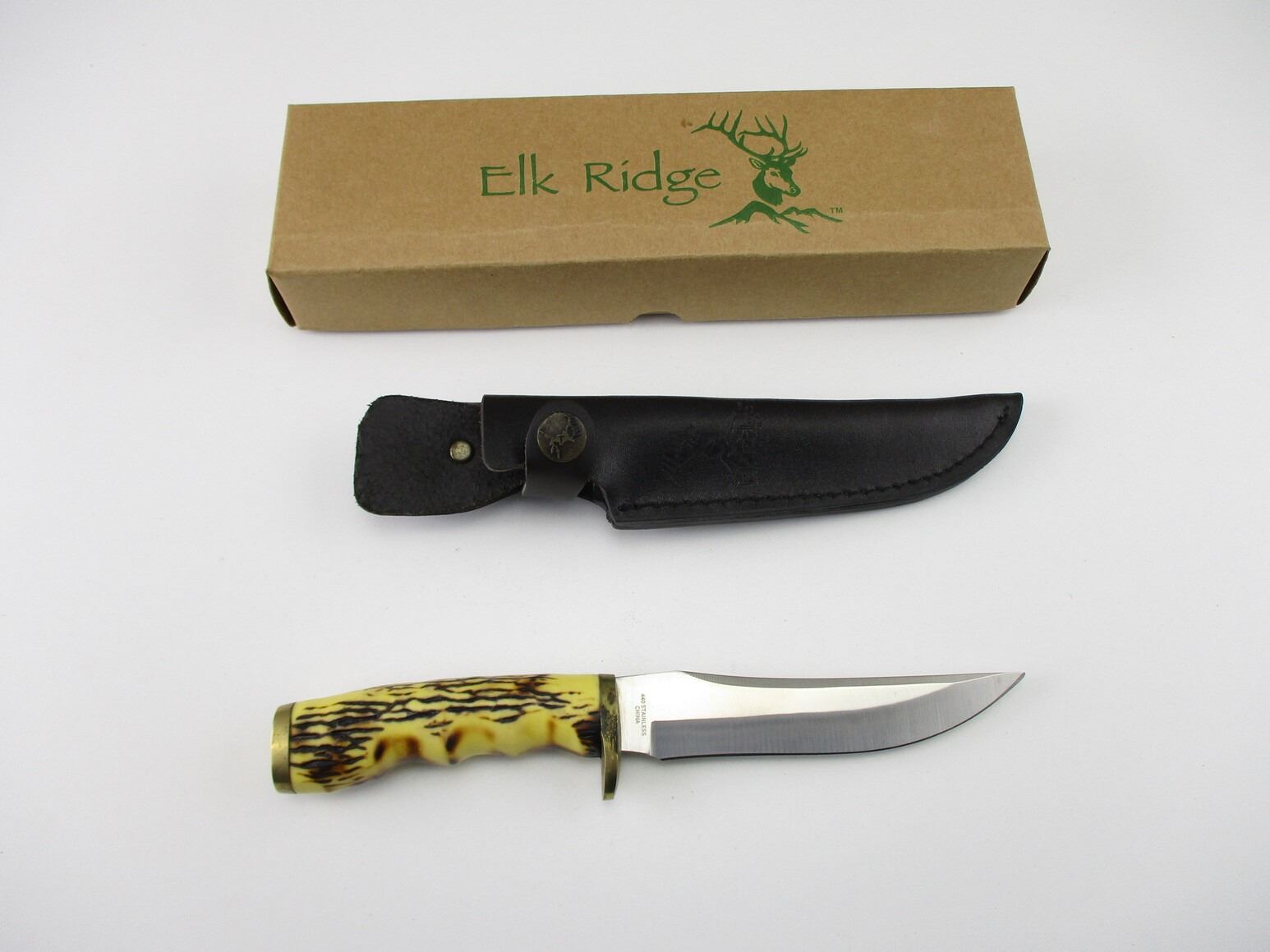 ELK RIDGE KNIFE , STAINLESS STEEL, APPROX. 5" BLADE, WITH BONE LIKE HANDLE & LEATHER SHEATH, INCLUDES ORIGINAL PACKAGE.
