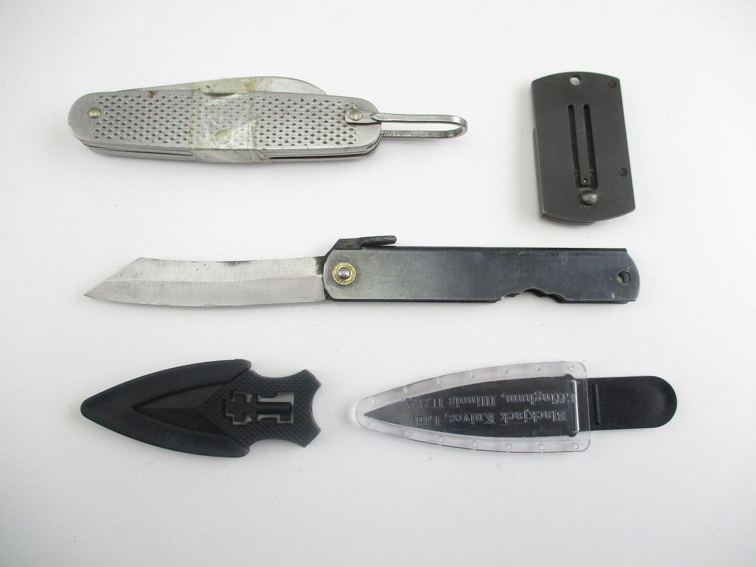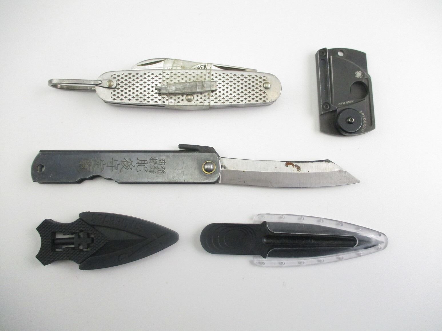 ASSORTED KNIVES , INCLUDES POCKET KNIFE WITH MULTIPLE BLADES, BLACK JAKE KNIFE, SPARROWS KNIFE, SPYDERCO KNIFE, ETC.
