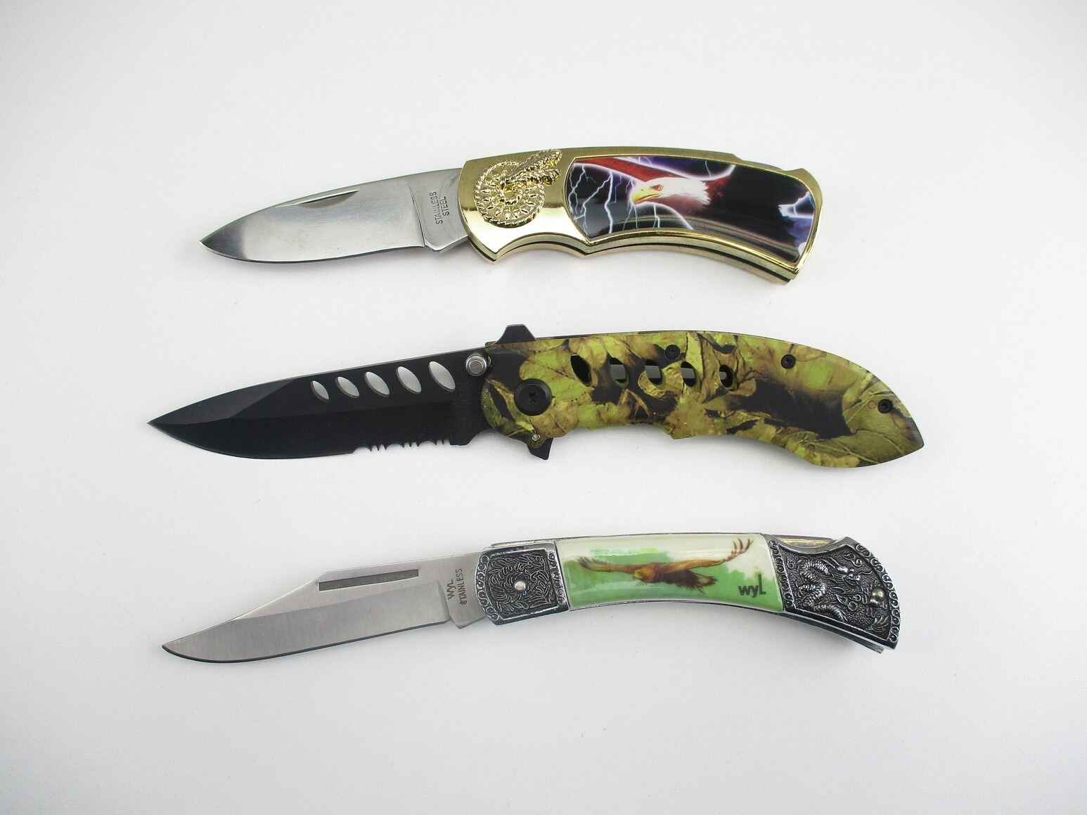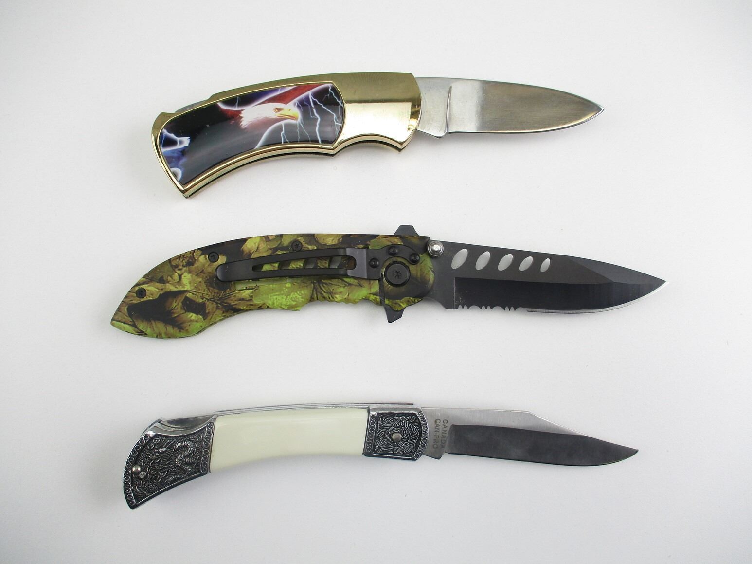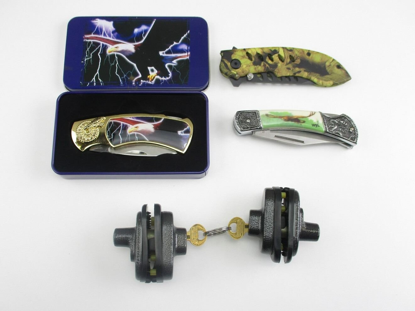 ASSORTED POCKET KNIVES & TRIGGER LOCKS , (1) STAINLESS STEEL FOLDING KNIFE, WITH LEAF STYLE CAMO HANDLE, APPROX. 3.5" BLADE, (1) DECORATIVE FOLDING KNIFE, WITH APPROX. 3.25" STAINLESS STEEL BLADE. (1) DISPLAY TYPE KNIFE, WITH EAGLE PRINT, APPROX. 3" STAINLESS STEEL KNIFE, COMES WITH DISPLAY TIN, (2) TRIGGER LOCKS WITH 2 KEYS.