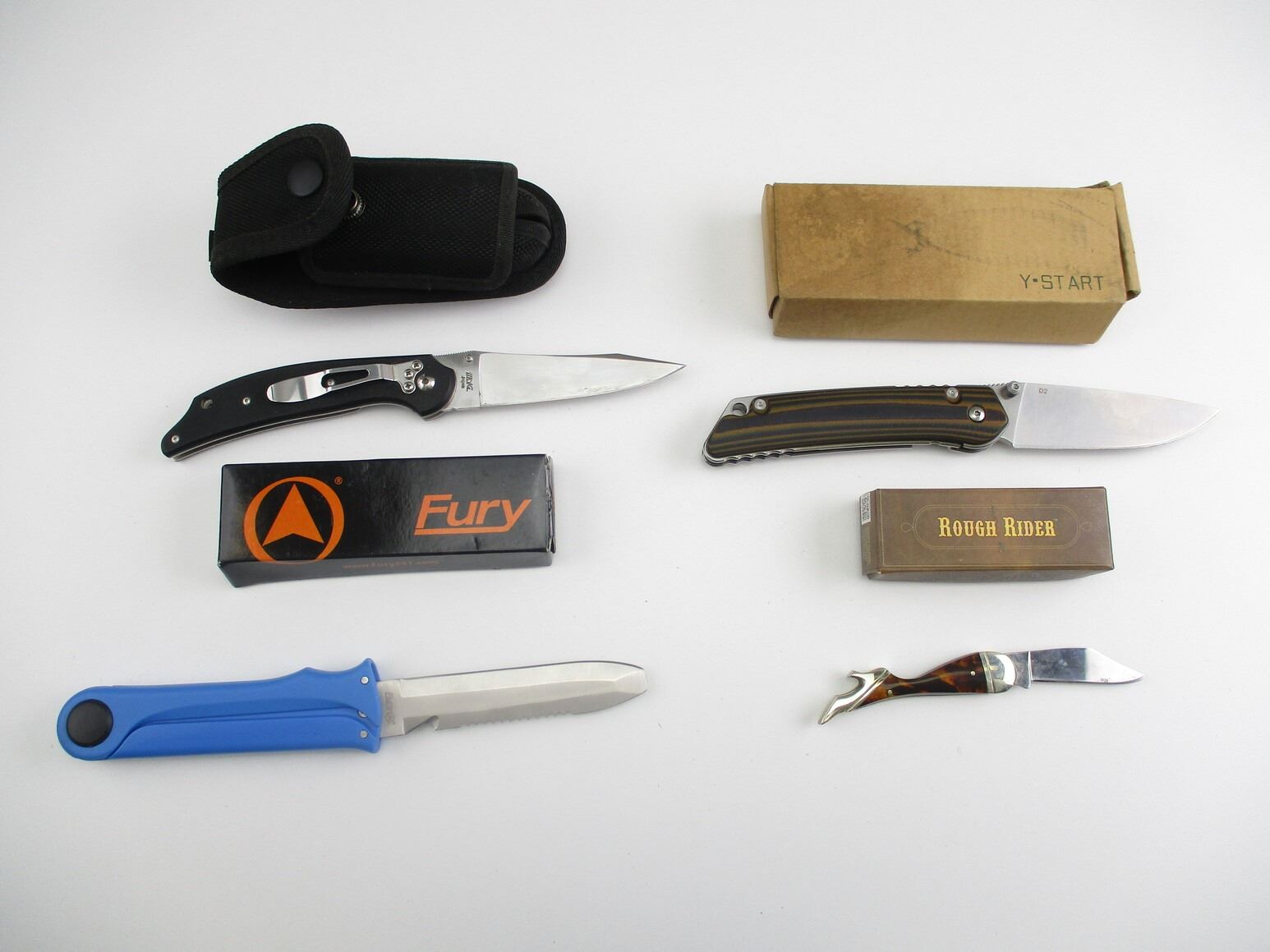 ASSORTED KNIVES , INCLUDES: (1) LAKOTA LEGEND FOLDING KNIFE, APPROX. 3.75" STEEL BLADE, MOKI JAPAN MARKED, (1)Y-START DS FOLDING KNIFE, APPROX. 3.75" STEEL BLADE, (1) FURY FOLDING KNIFE, APPROX. 4" STEEL BLADE, WITH PLASTIC HANDLE, (1) ROUGH RIDERS, POCKET KNIFE, APPROX. 2.25" STEEL BLADE,