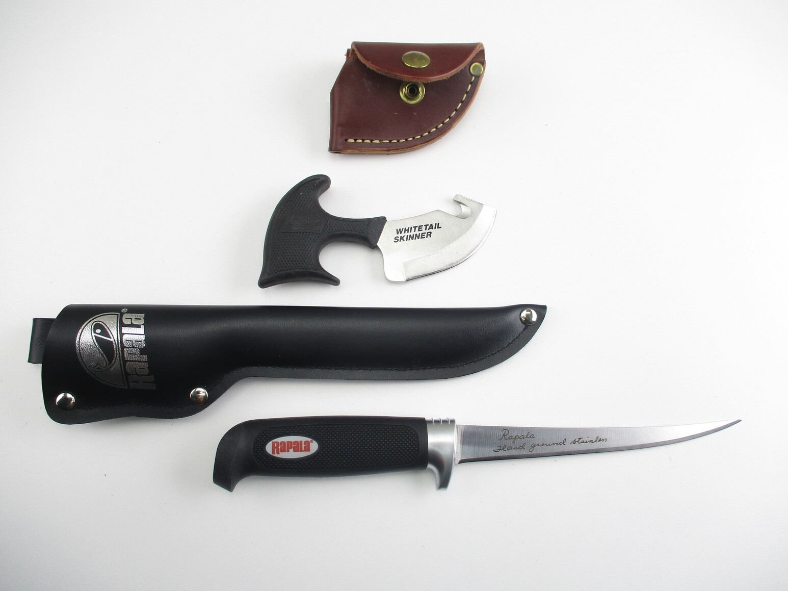 FILLET KNIFE & SKINNING KNIFE, (1) RAPALA FILLET KNIFE, APPROX. 6" BLADE, WITH VINYL TYPE SHEATH. (1) WHITETAIL SKINNER KNIFE, APPROX. 2.75" BLADE, WITH RUBBER TEXTURED HANDLE & LEATHER SHEATH.