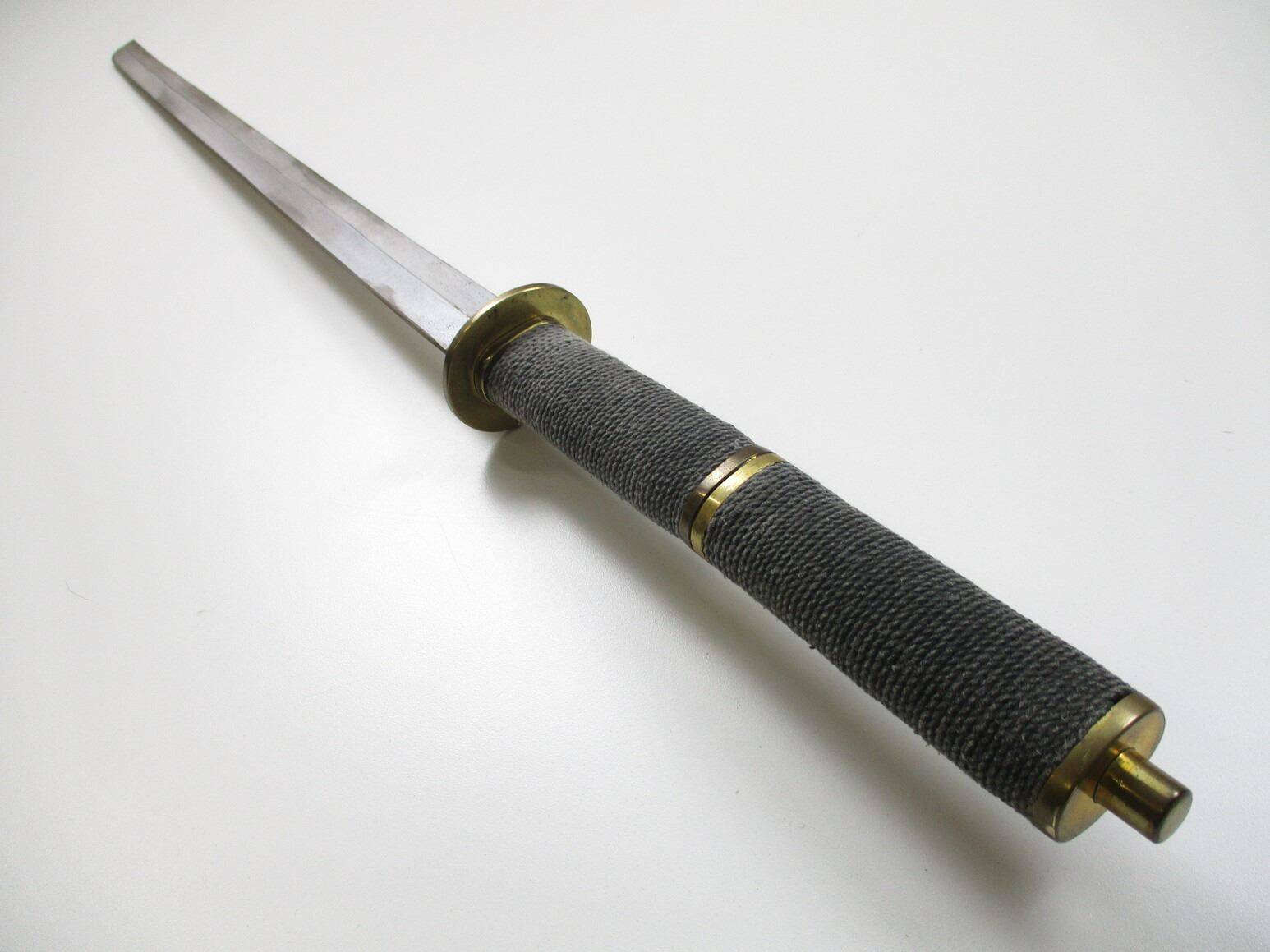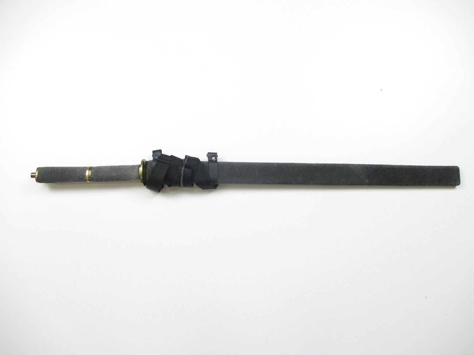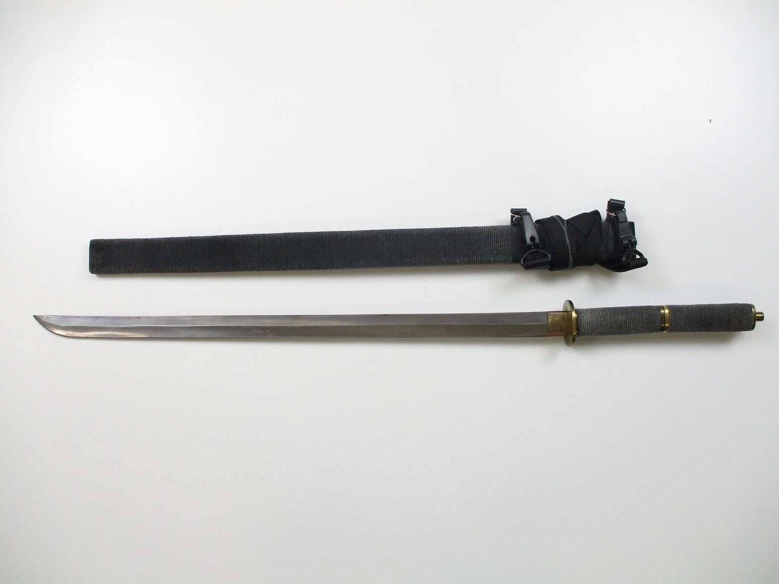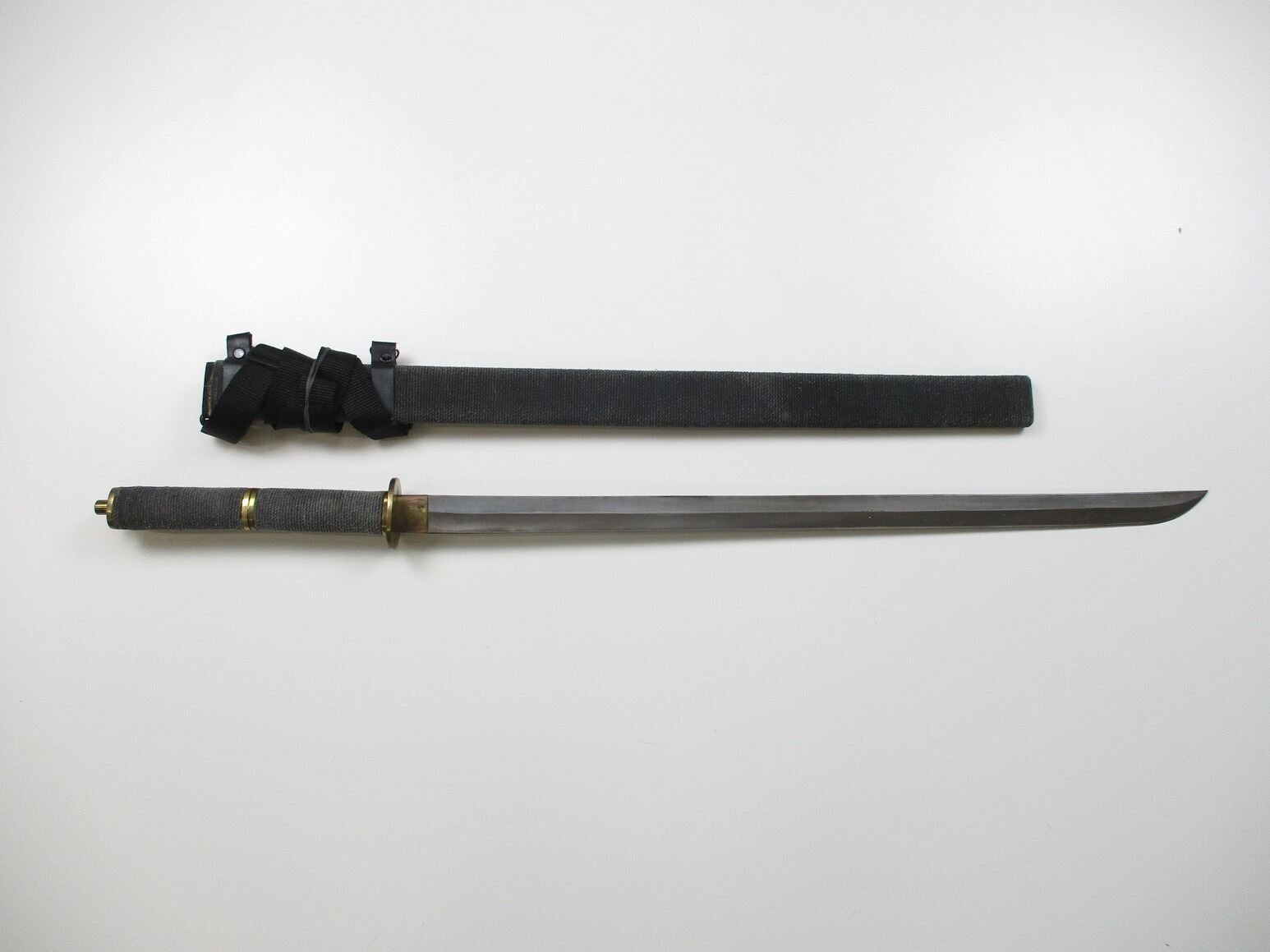 HOME MADE STYLE KATANA , STEEL BLADE, APPROX. 26" BLADE, WITH WRAPPED HANDLE, BRASS HAND GUARD # 368, INCLUDES WRAPPED WOODEN SCABBARD.