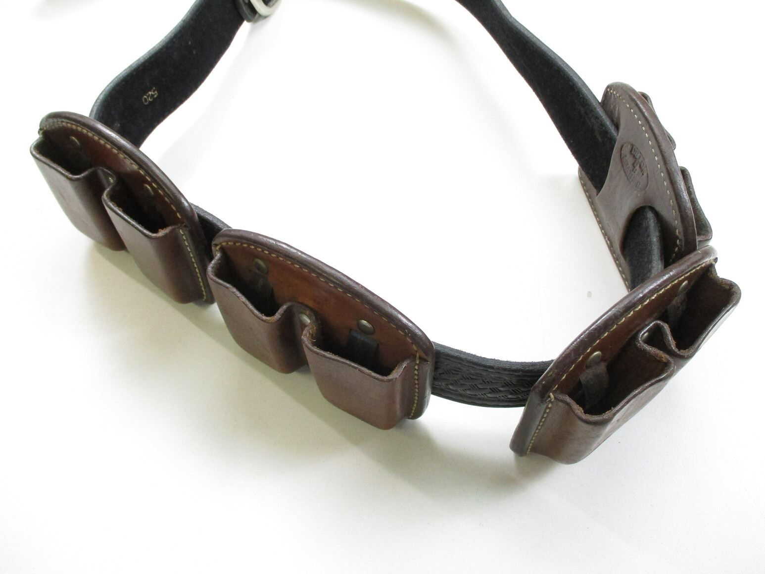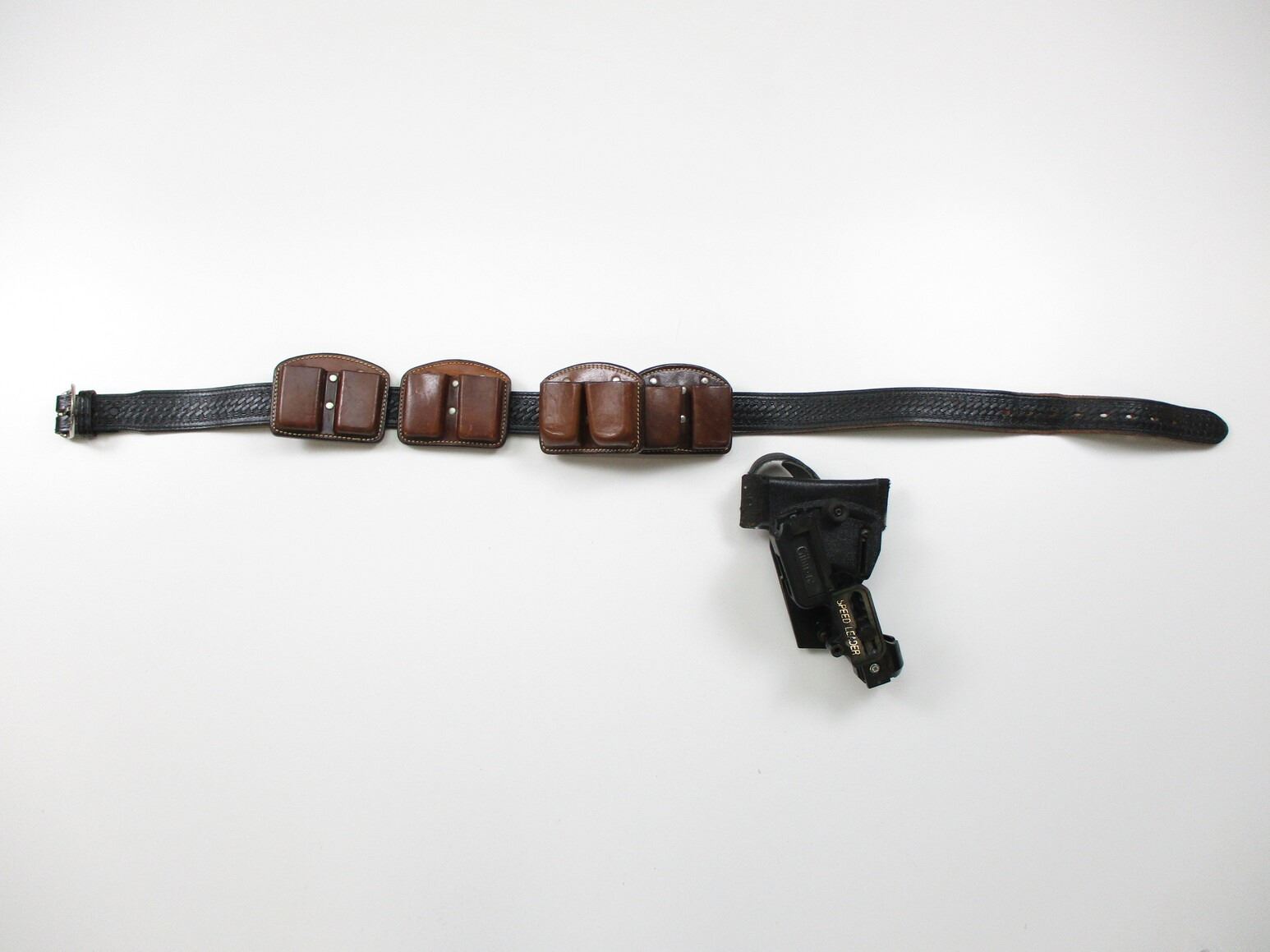 SPEED LEADER HOLSTER & COMPETITION TYPE BELT ETC, SPEED LEADER SPEED DRAW TYPE HOLSTER, POSSIBLY FITS 1911 STYLE PISTOL, RIGHT HANDED, (1) COMPETITION LEATHER BELT, APPROX. 42" FROM MIDDLE HOLE IN BELT, WITH (4) DILLON DP LEATHER MAG HOLSTERS, HOLDS SINGLE STACK STYLE MAGAZINES, EACH HOLSTER HOLDS 2 MAGS.