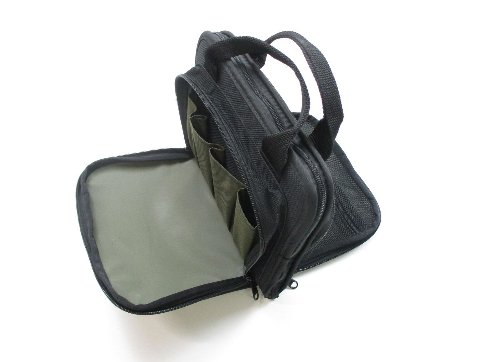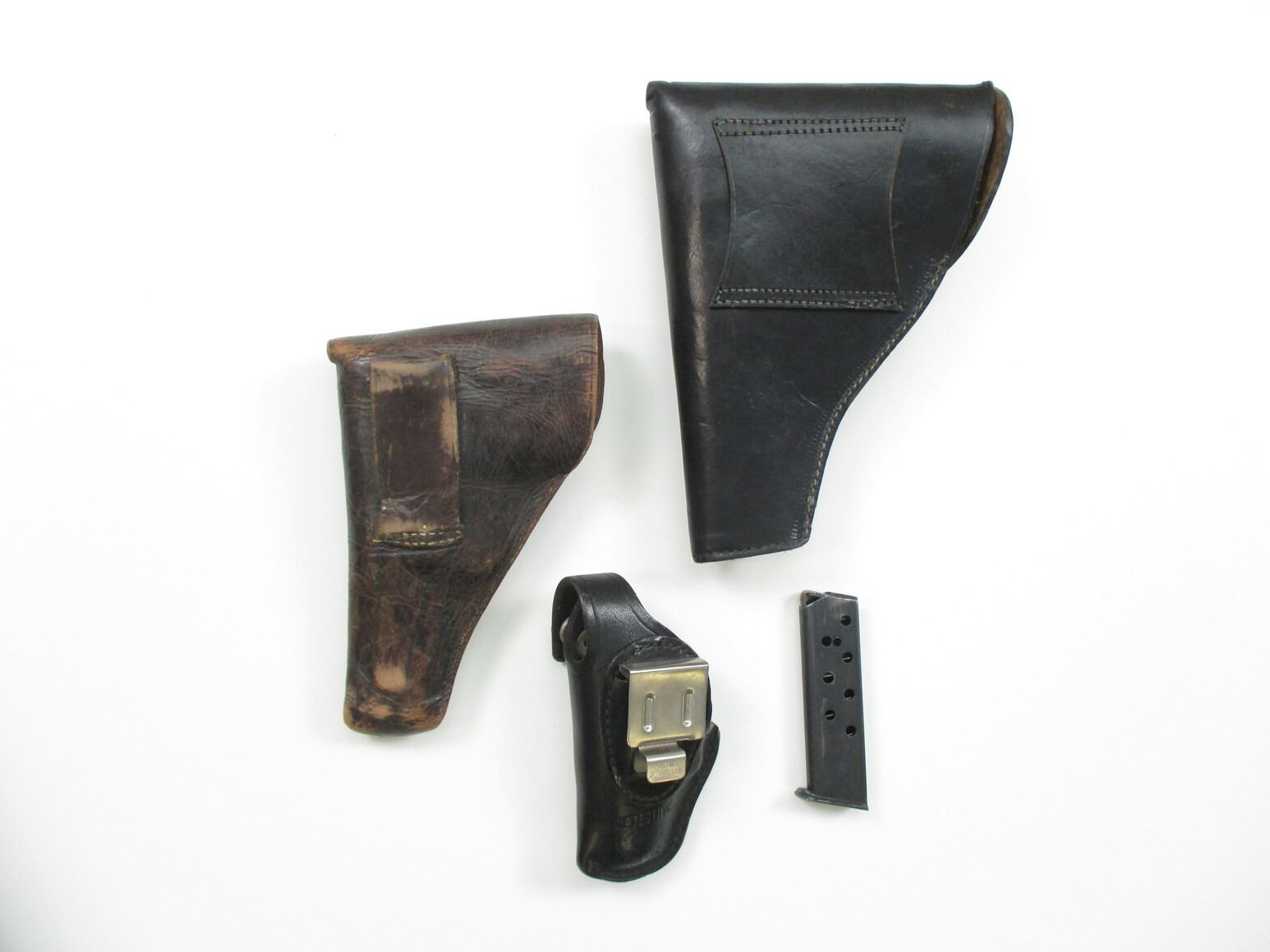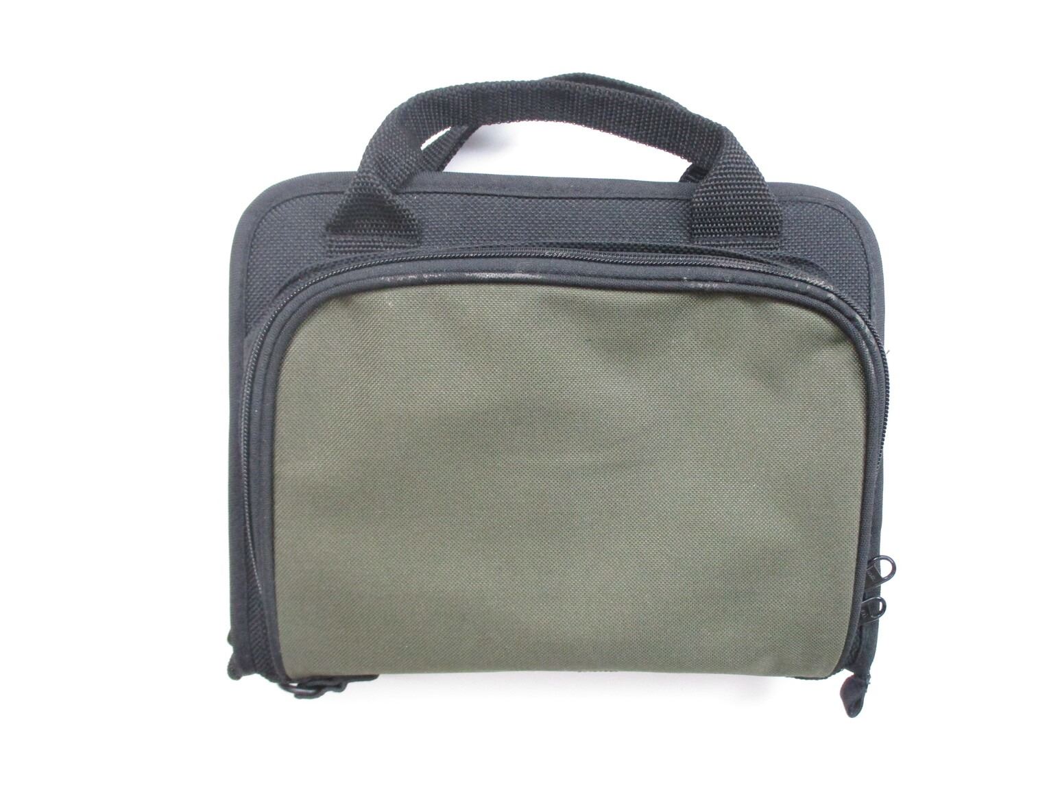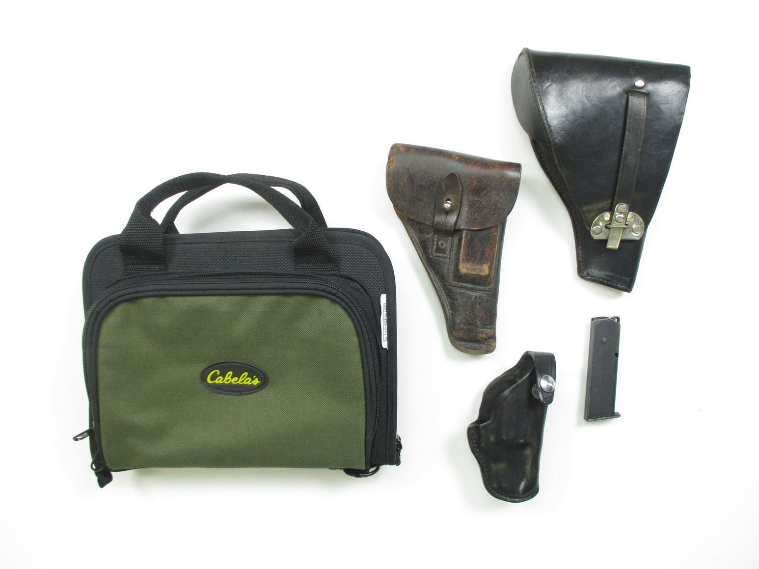 ASSORTED HOLSTERS ETC, INCLUDES SEMI-AUTO HOLSTERS FOR SMALL & MEDIUM FRAME PISTOLS, 1 HOLSTER INCLUDES 1 MAG FOR SAUER 38H MAGAZINE, IN 32 ACP, 8 ROUND MAG, MARKED ON BOTTOM. (1) REVOLVER HOLSTER, FOR SMALL FRAME REVOLVER, RIGHT HANDED, (1) CABELAS SEMI-AUTO RANGE CARRY CASE, PADDED, WITH SEMI-AUTO PISTOL CUT OUT WITH MAG CUT OUT.