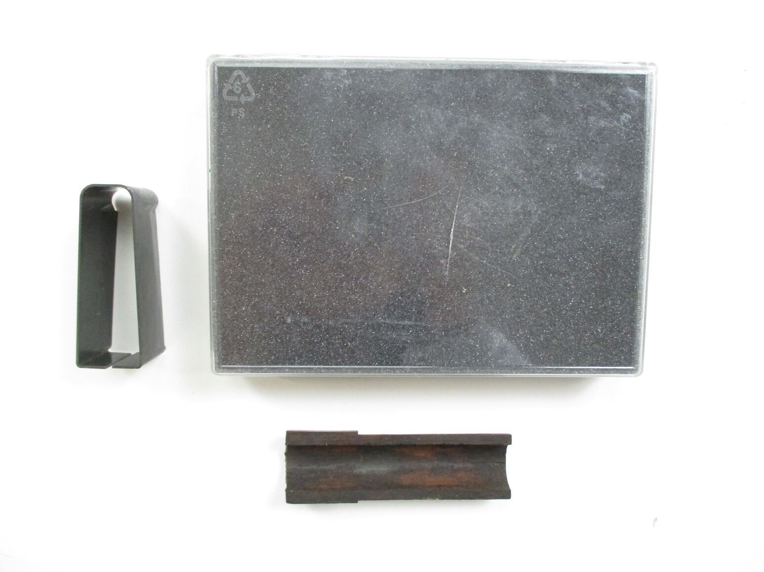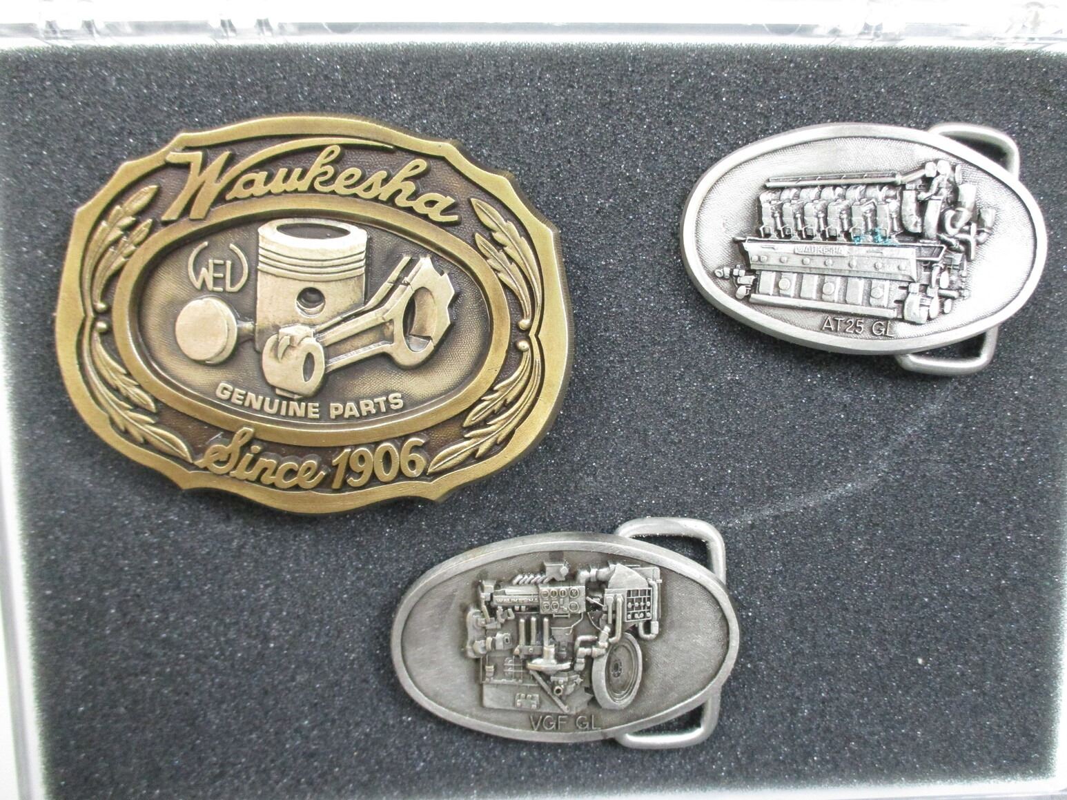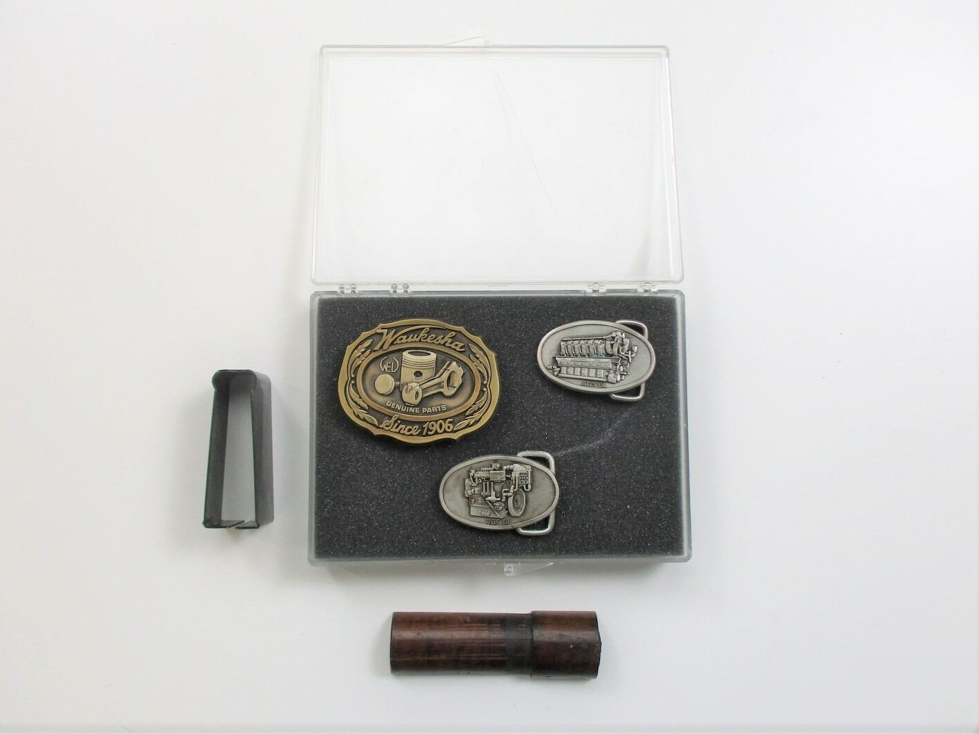 BELT BUCKLES ETC, INCLUDES 3 VINTAGE STYLE BELT BUCKLES IN PLASTIC DISPLAY CASE, WITH 105 ROSS FOREND PIECE, CRACKED, (1) UNKNOWN MAG BOX FOR BOLT ACTION RIFLE, POSSIBLY SA 700.
