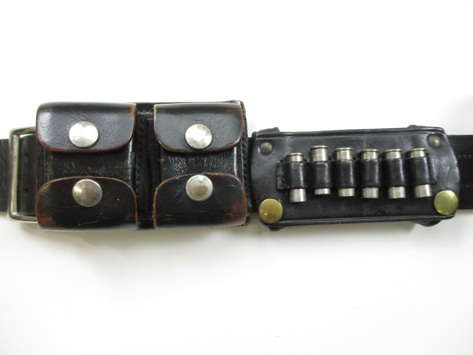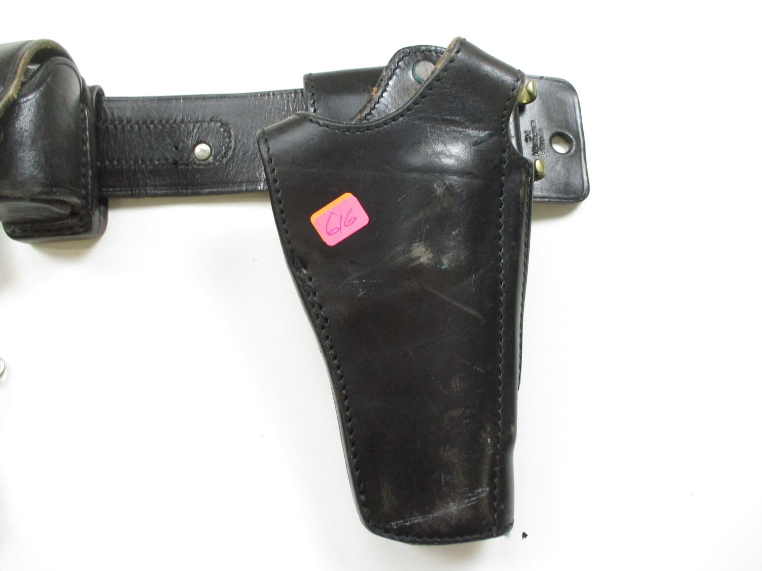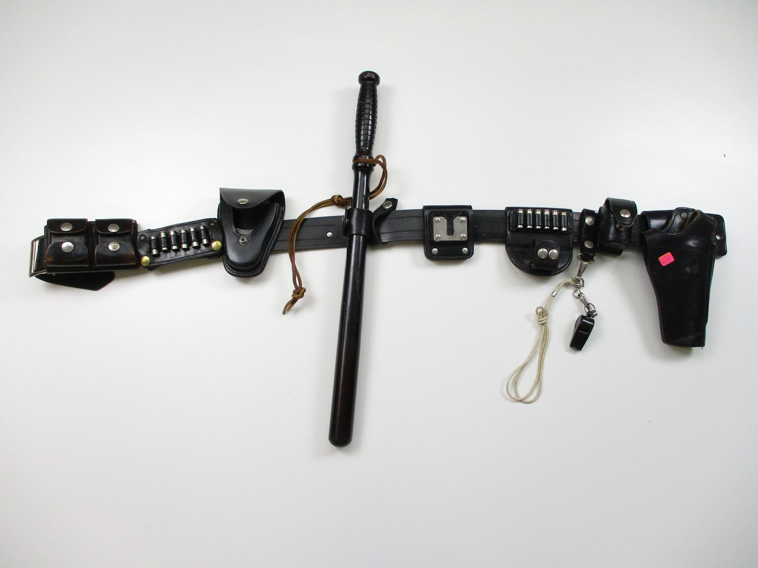 BLACK LEATHER POLICE OFFICER TYPE BELT & ACCESSORIES , BLACK LEATHER BELT, APPROX. 38" IN LENGTH FROM MIDDLE HOLE OF BELT, ADJUSTABLE LENGTH, INCLUDES RIGHT HANDED REVOLVER HOLSTER, FOR .38 SPECIAL REVOLVER, POSSIBLY MEDIUM FRAME SIZE, ALSO INCLUDES BULLET LOOPS THAT HOLD .38 SPECIAL, HANDCUFFS WITH KEYS & HOLSTER, (NOTE: 1 CUFF IS BROKEN, MAY REQUIRE REPAIR), ALSO INCLUDES (1) NIGHT STICK & WHISTLE ETC.
