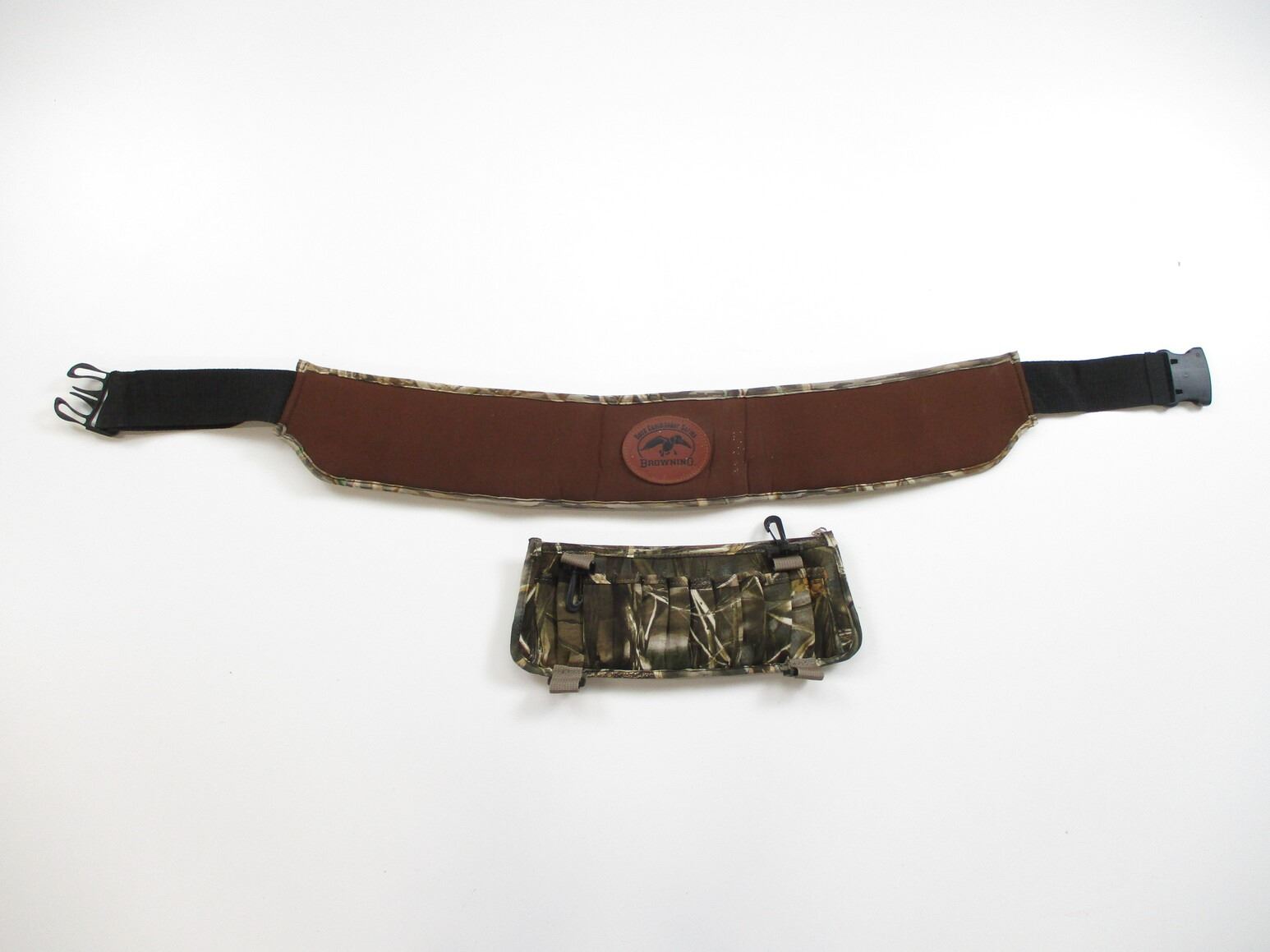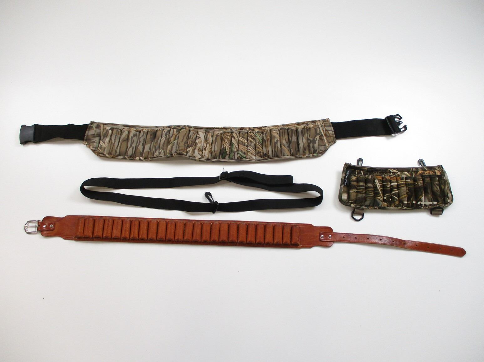 ASSORTED 12 GA SHOTGUN AMMO BELTS ETC, (1) BROWNING SHOTSHELL BELT, ADJUSTABLE WAIST BELT, APPROX. 40" OAL. (1) LEATHER SHOTSHELL BELT, APPROX. 40" FROM MIDDLE HOLE OF BELT, UNKNOWN MFG, (1) TRAIL-MARKER SHOTSHELL CARRIER, WITH ZIP UP POUCH, ATTACHES VIA PLASTIC CLIPS.