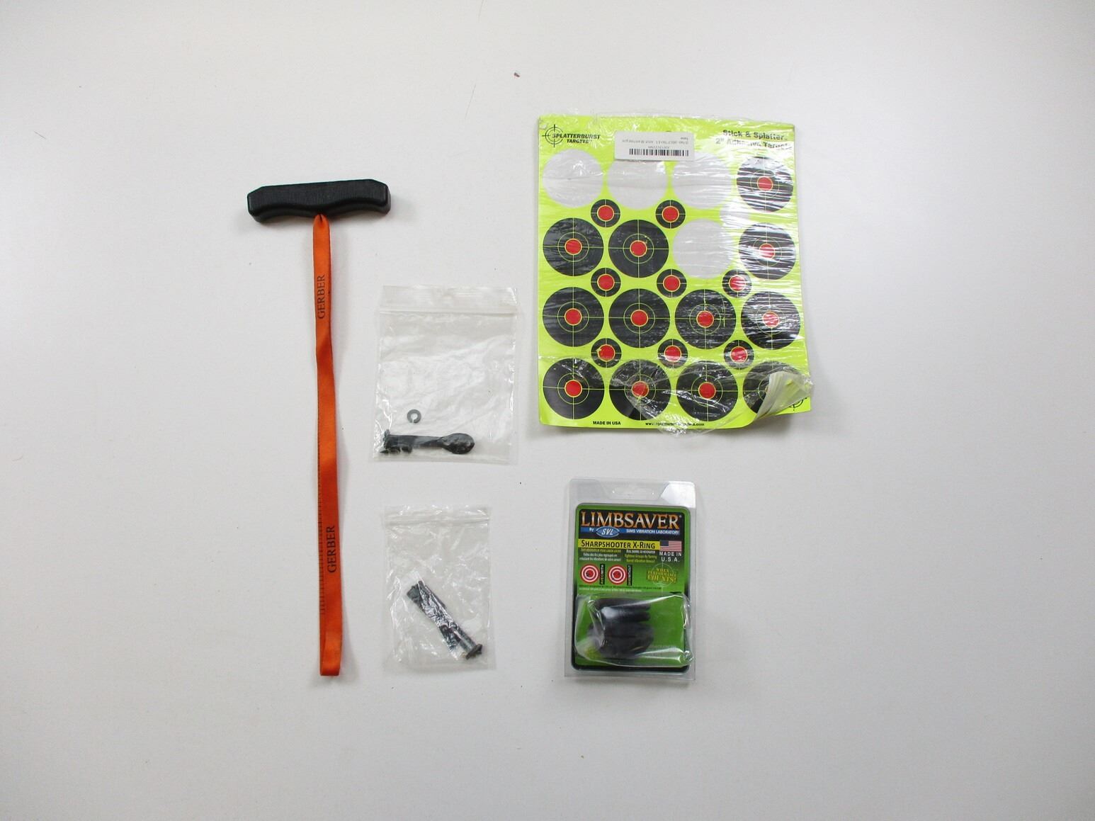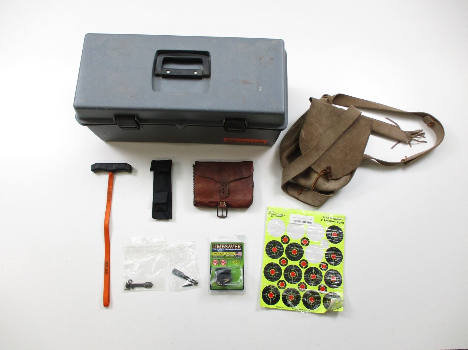 ASSORTED ACCESSORIES , INCLUDES: BORE LASER SIGHTER, NEEDS BATTERIES, UNSURE IF WORKS, INCLUDES VARIOUS MUZZLE ADAPTERS FOR SIGHTER, (1) LEATHER POUCH, (1) POSSIBLES BAG WITH KNIFE, LIMB SAVER SHARPSHOOTER X-RING , ETC. COMES WITH BENCH MASTER TOOL BIN, APPROX. 20 X 9 X 9".
