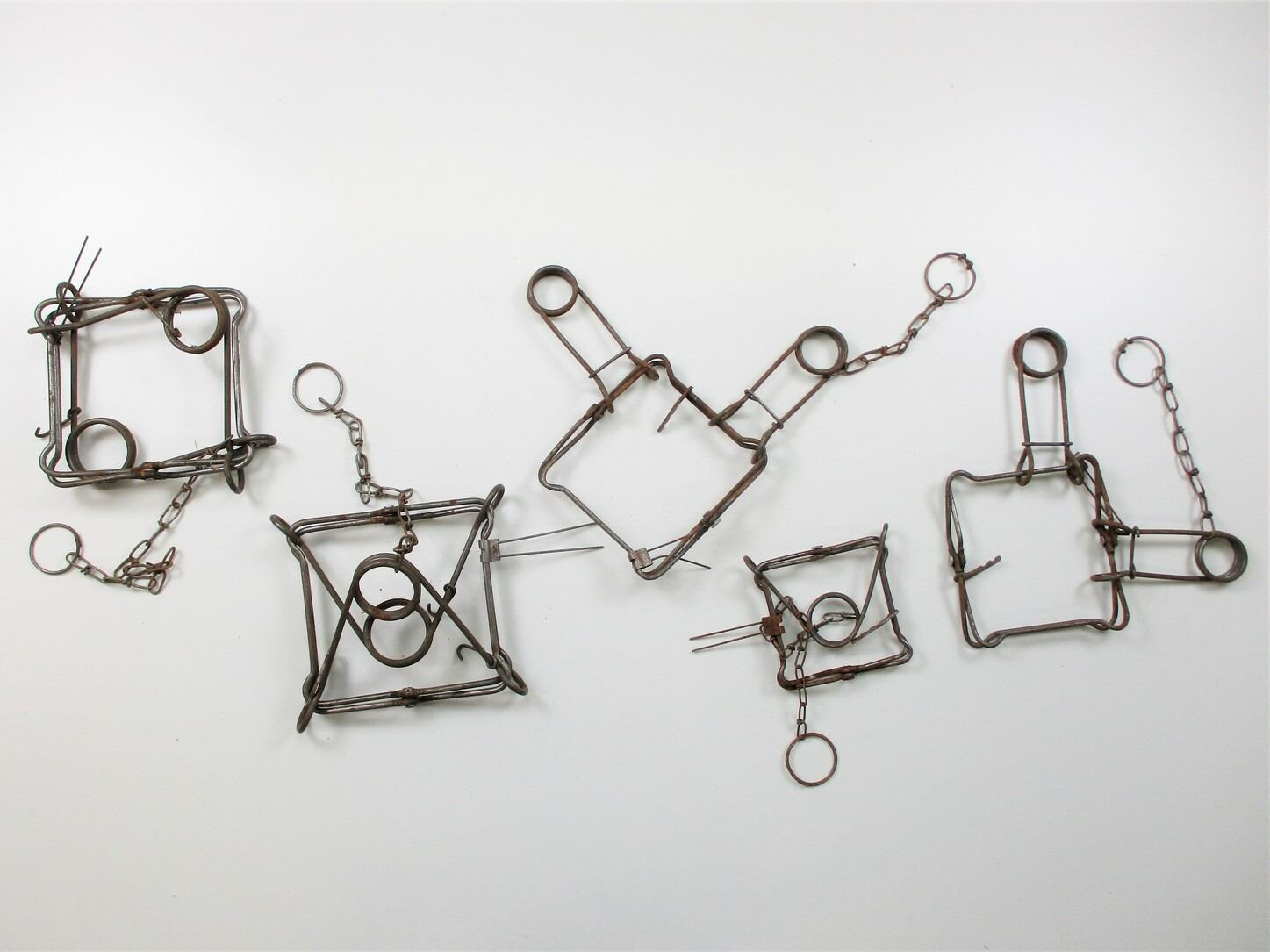 ASSORTED CONIBEARS TRAPS , LOT OF 5. THREE DIFFERENT SIZES, STEEL, WITH RUST, TRAPS APPEAR COMPLETE.