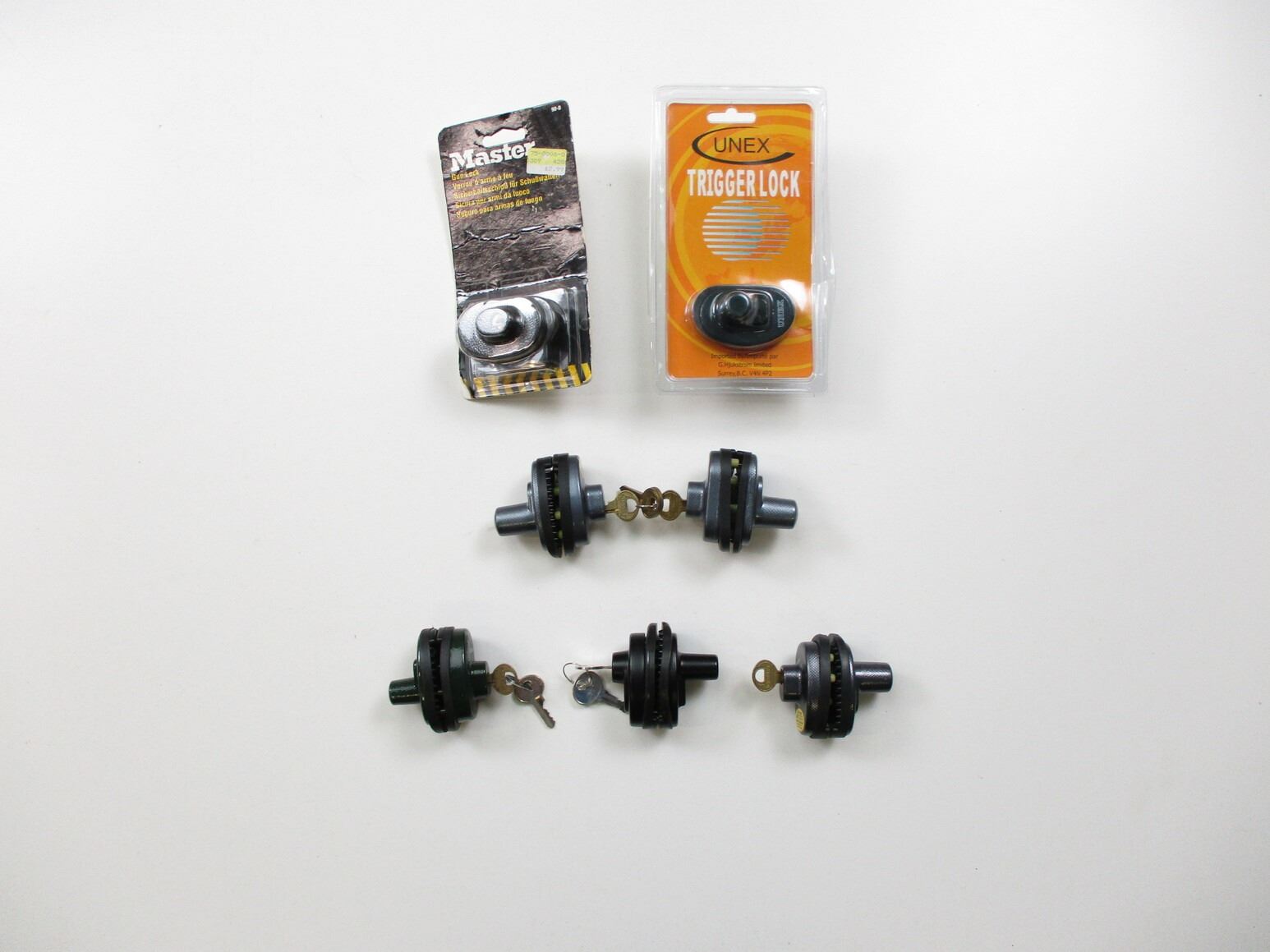 ASSORTED TRIGGER LOCKS , LOT OF 7. INCLUDES KEYS. SOME NOS. IN ORIGINAL PACKAGE.