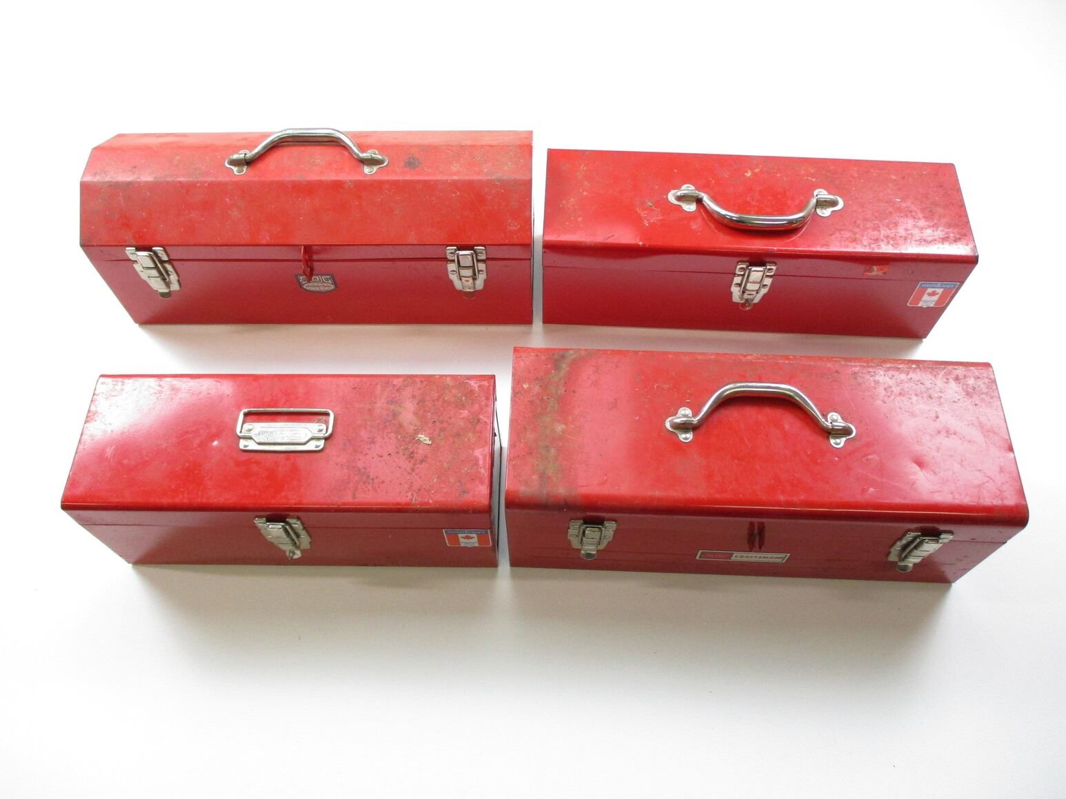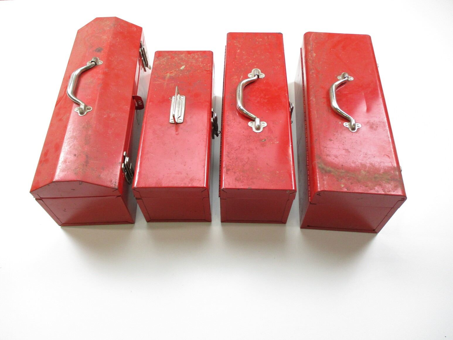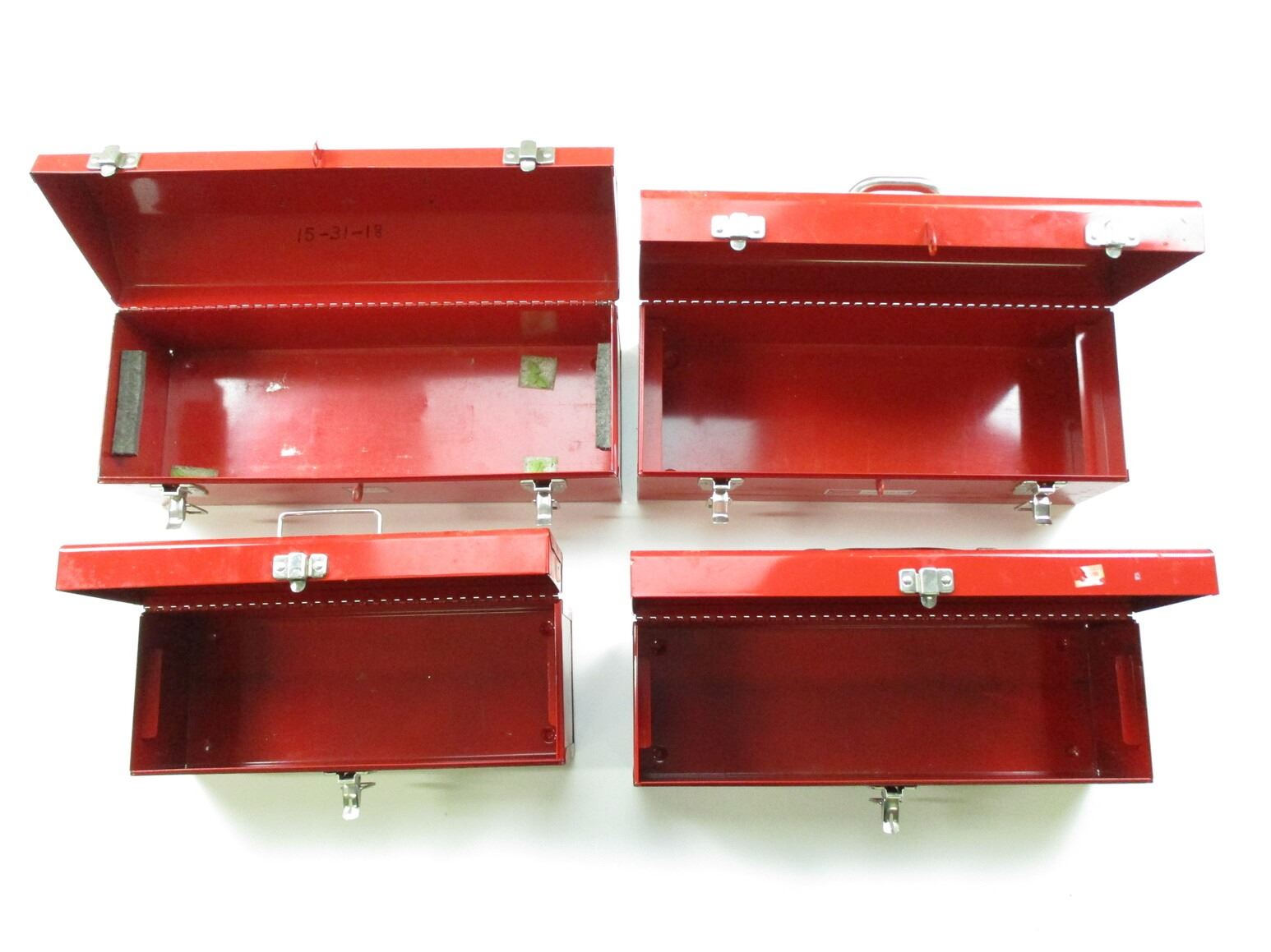 METAL TOOL CASES , LOT OF 4. EMPTY TOOL CASES, WITH WORKING LATCHES, & CARRY HANDLES, SOME SURFACE RUST, (1) 20.25 X 7 X 8", (1) 19 X 6 X 6.5", (1) 19 X 7 X 7", (1) 16 X 6 X 6.25"