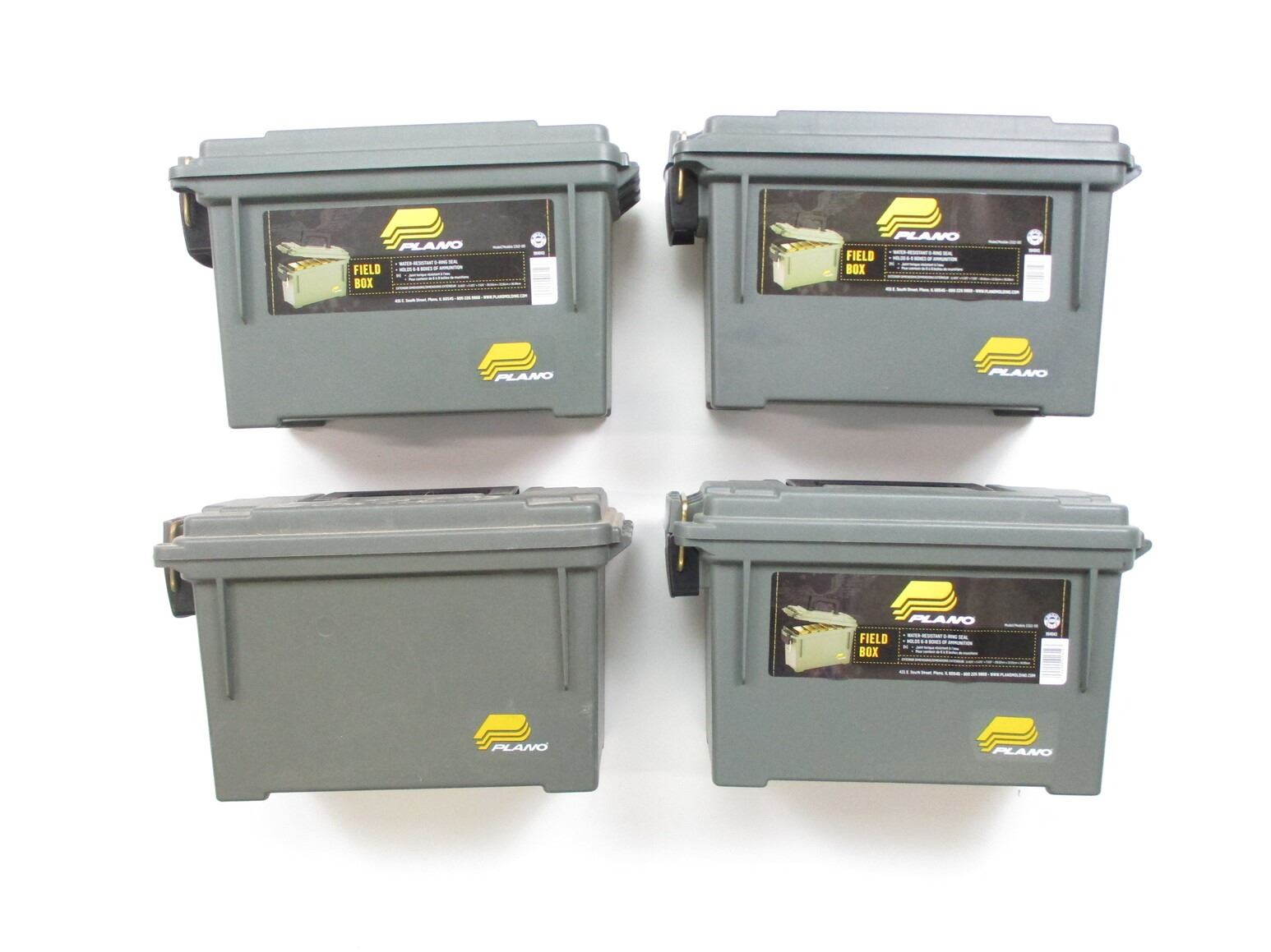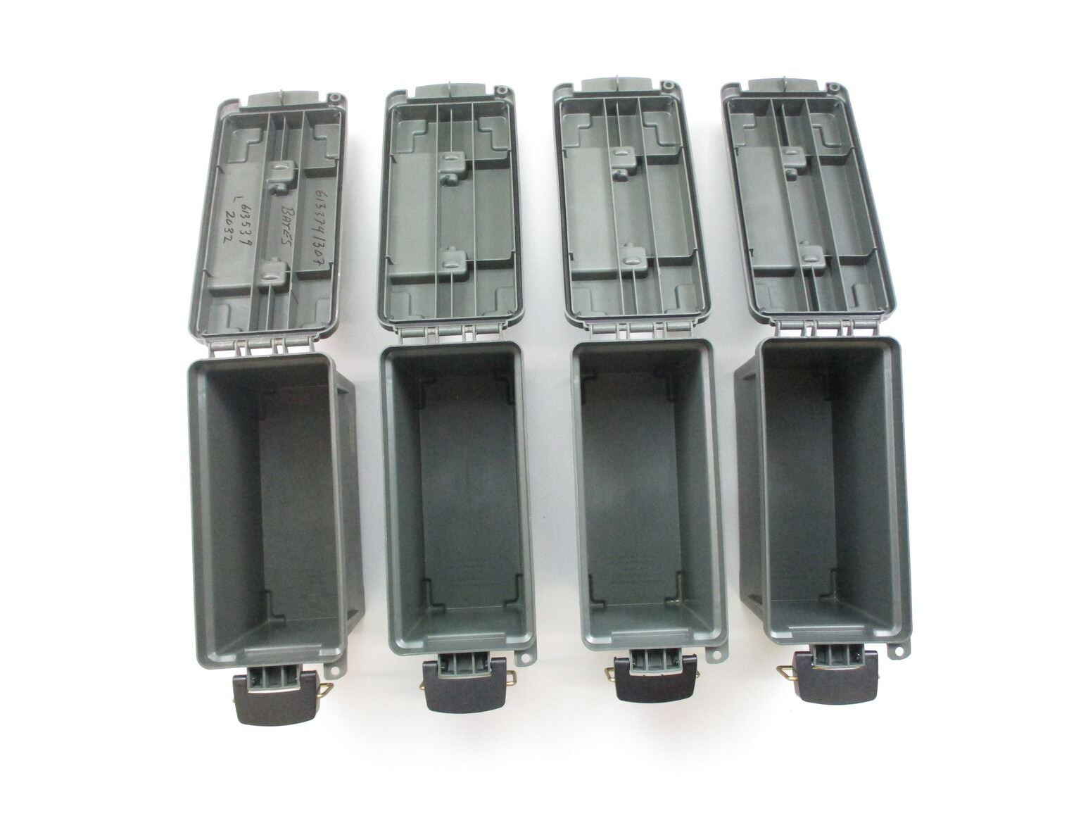 DRY AMMO BINS ETC, (4) PLANO FIELD DRY AMMO BINS, POLYMER CONSTRUCTION, APPROX. 11.6 X 5.1 X 7.1", ALSO INCLUDES VFG RIFLE CLEANERS.