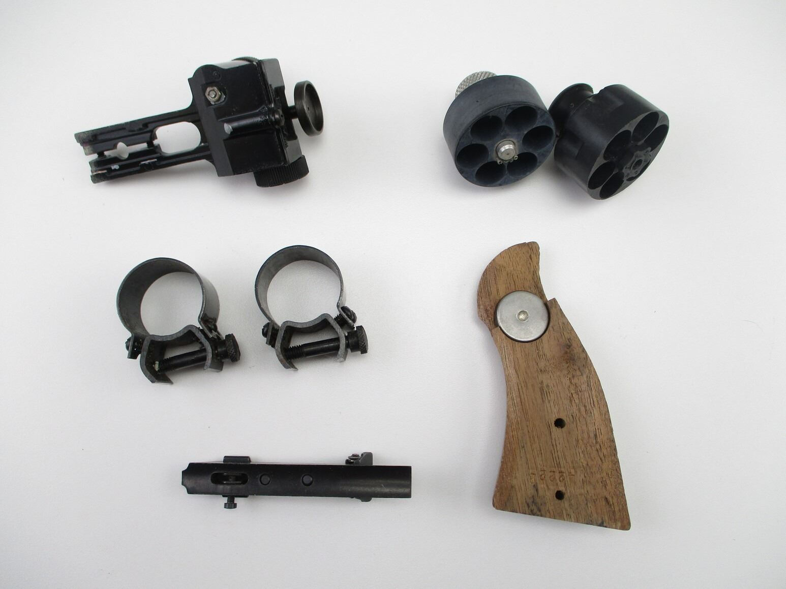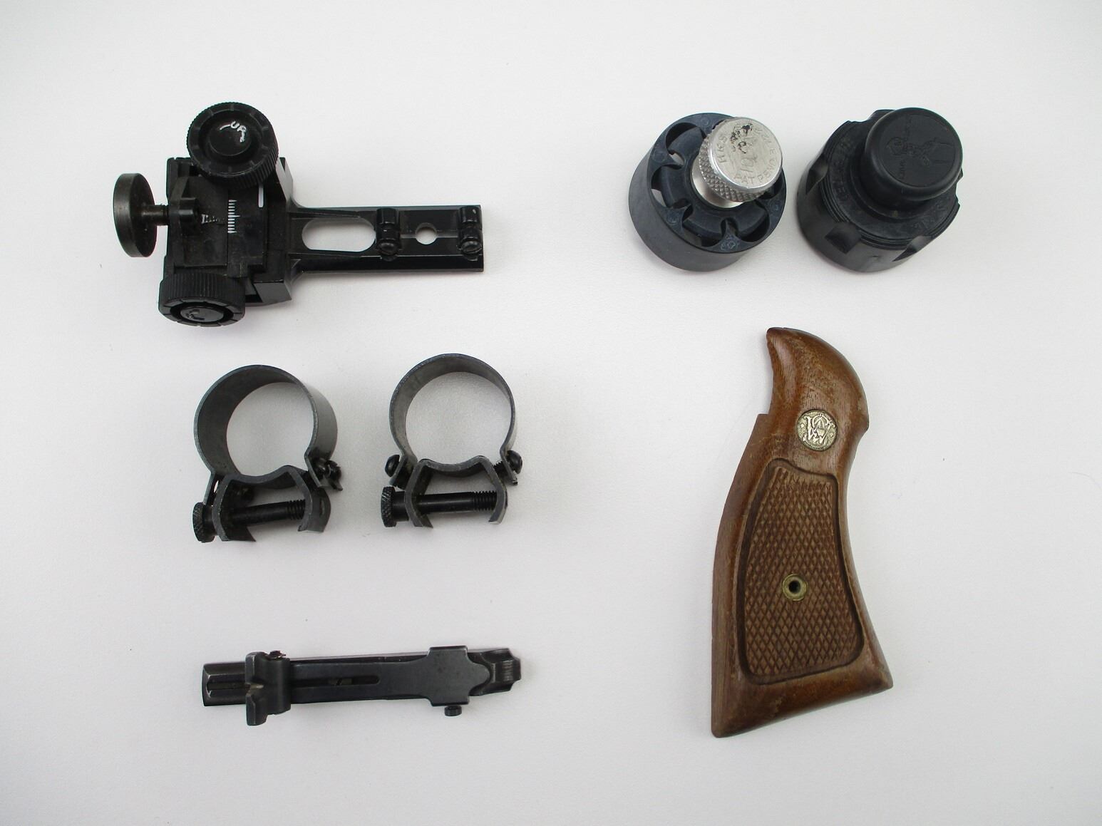 ASSORTED ACCESSORIES, INCLUDES: (2) REVOLVER SPEED LOADERS, HOLDS .38 SPECIAL, 1 S&W REVOLVER GRIP, (1) PAIR OF 1" SCOPE RINGS, WITH THUMB SCREWS. POSSIBLY MOUNTS TO WEAVER & PICATINNY STYLE RAILS. ETC.
