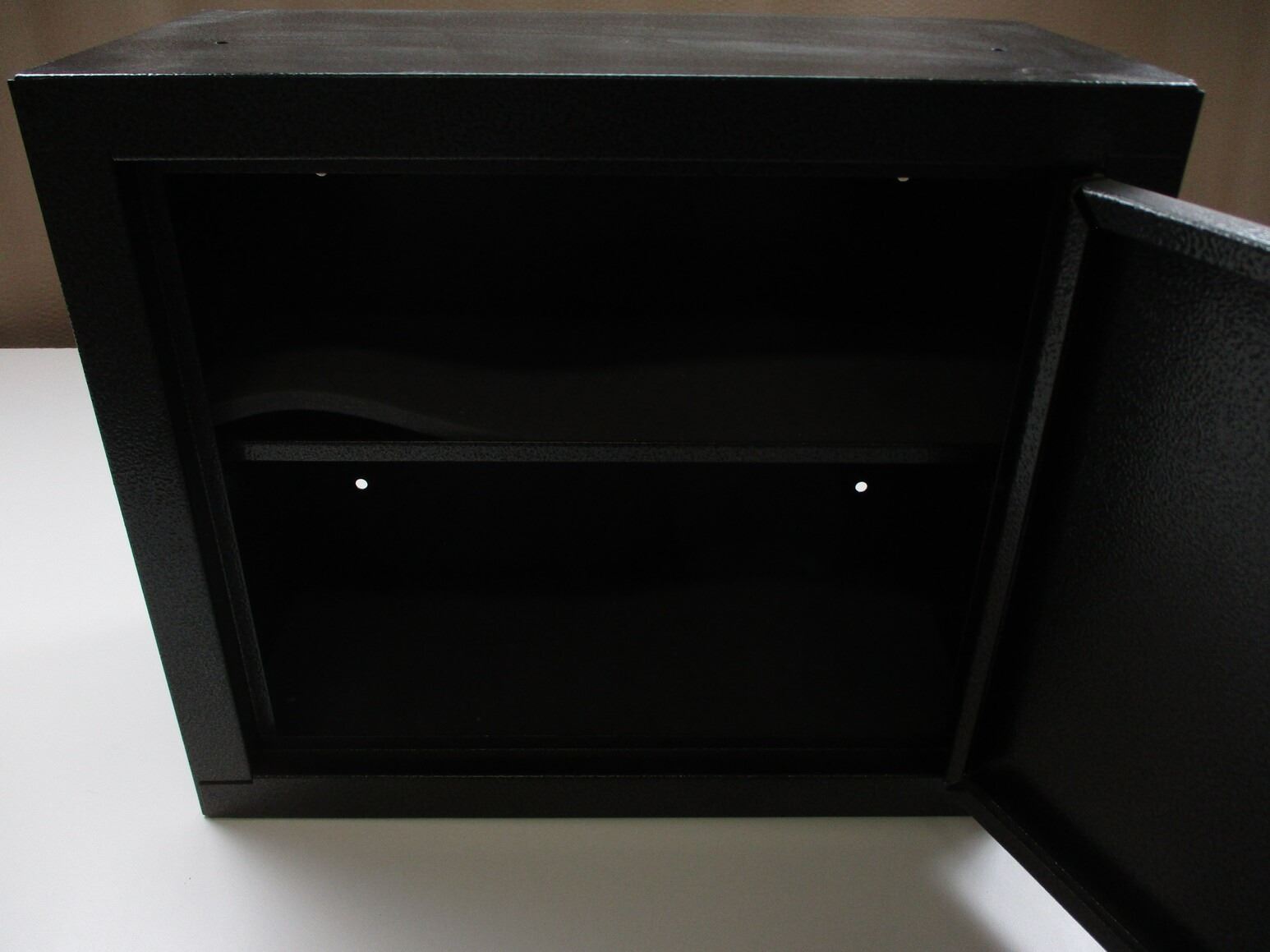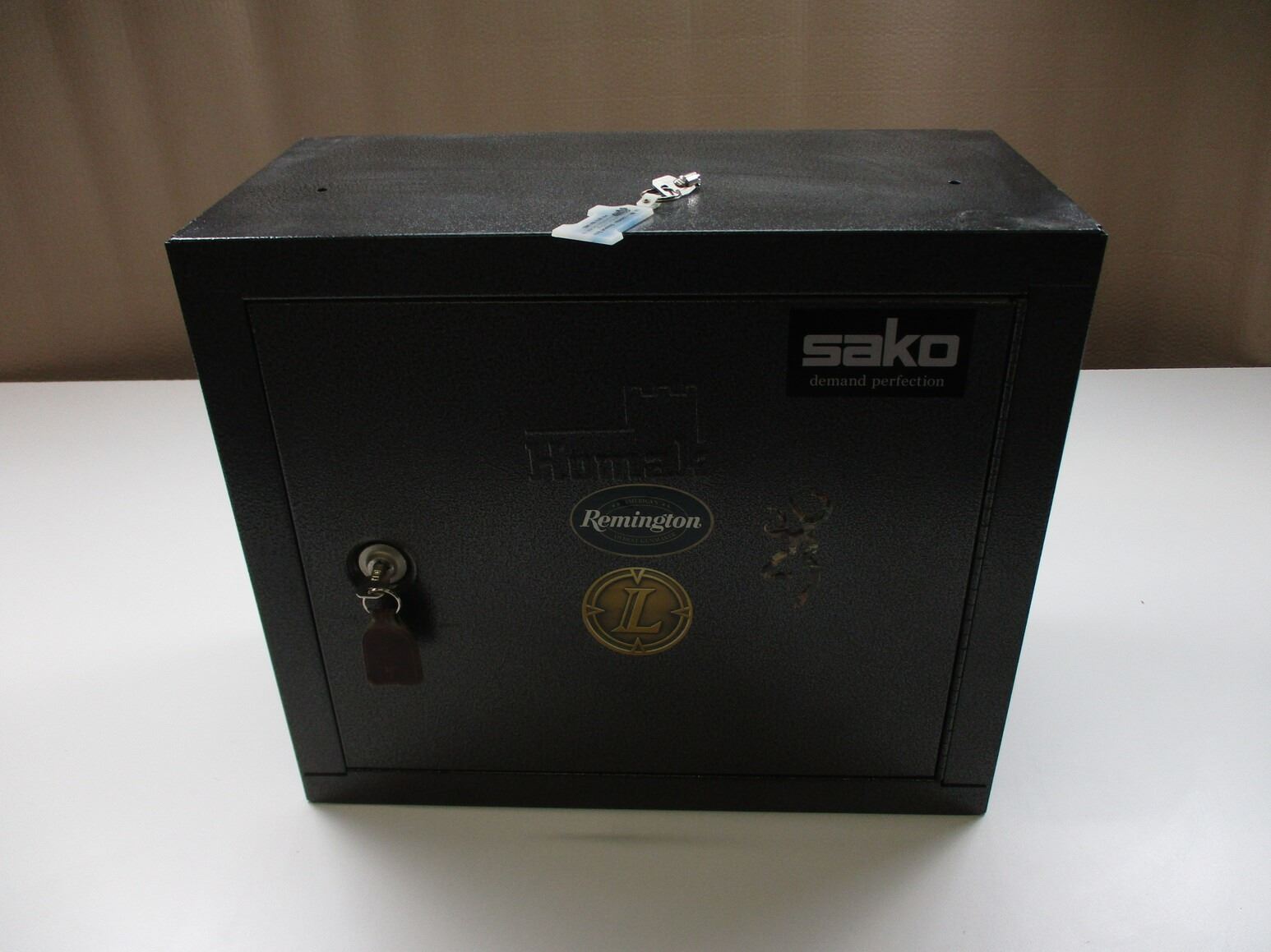 HOMAK HANDGUN SAFE , INCLUDES: 2 KEYS, LOCK WORKS, WITH PADDING, APPROX. 12 X 10 X 18.1", WITH VARIOUS STICKERS ON SAFE.