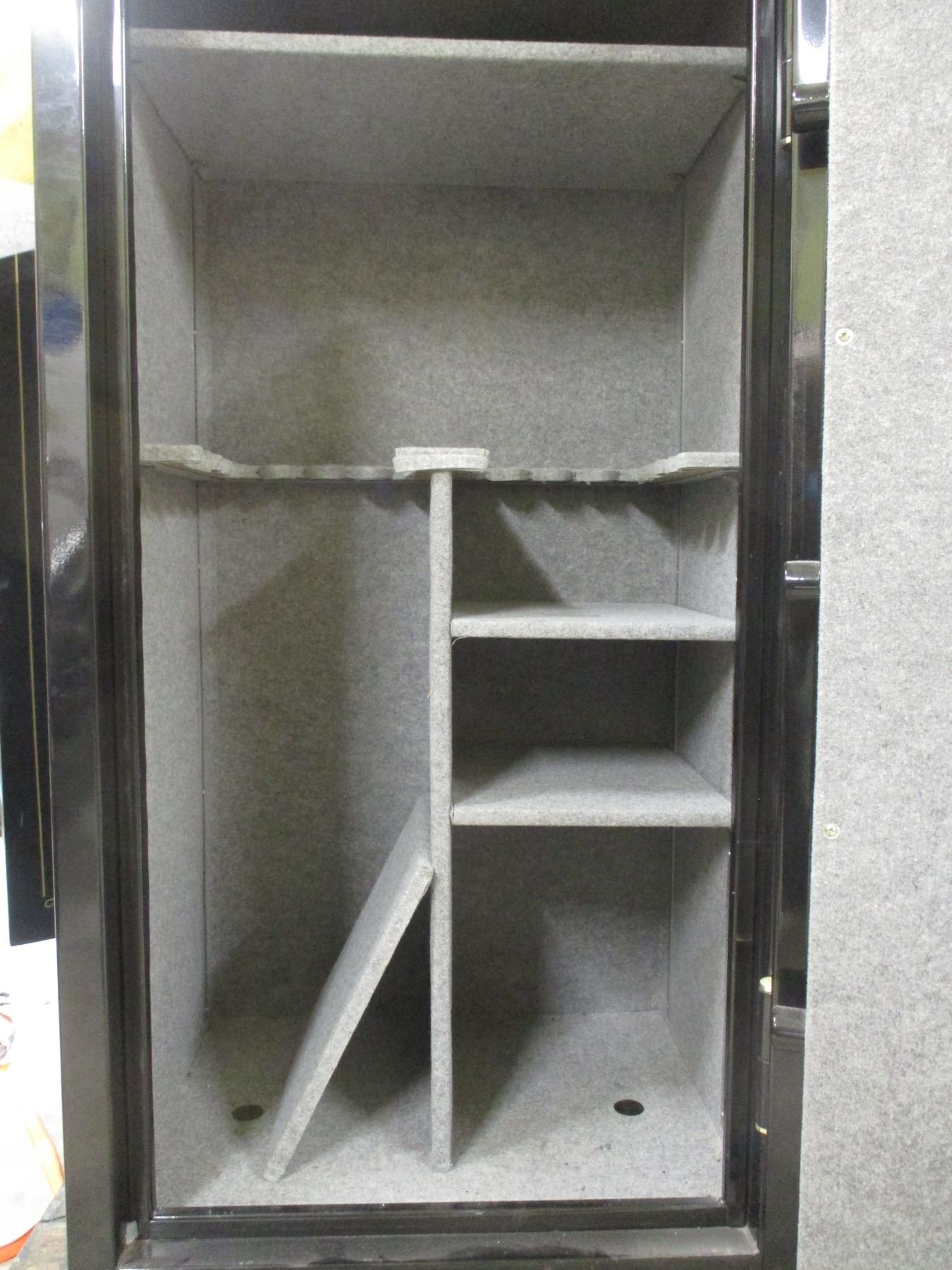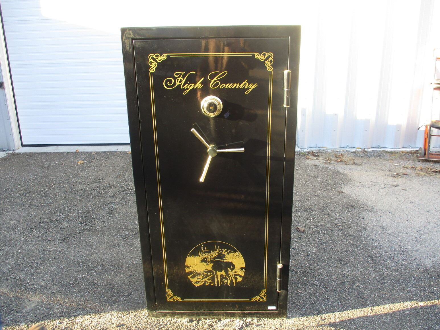 HIGH COUNTRY GUN SAFE , BLACK STEEL, DIAL, TURN SHAFT, PADDED, WITH SHELFING, MISSING SOME SHELF HANGING CLIPS, COMBO WRITTEN ON PAPER, INCLUDES OPERATION & CHANGING INSTRUCTIONS, APPROX. 30" X 24" X 59", APPROX. 620 LB, NOTE: LOT IS PICK UP ONLY.