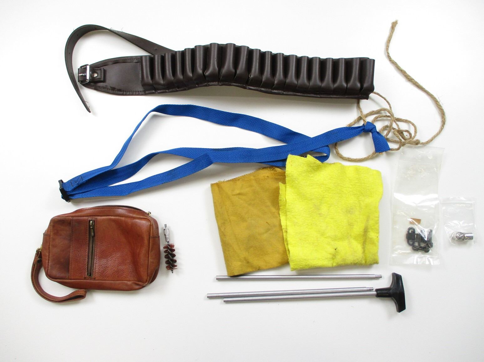 ASSORTED SHOTGUN CLEANING ACCESSORIES ETC, INCLUDES: 3 PIECE ALUMINUM CLEANING ROD, SHOTGUN CLEANING RUSH, 12GA AMMO BELT, LEATHER ZIP UP POUCH, ETC.