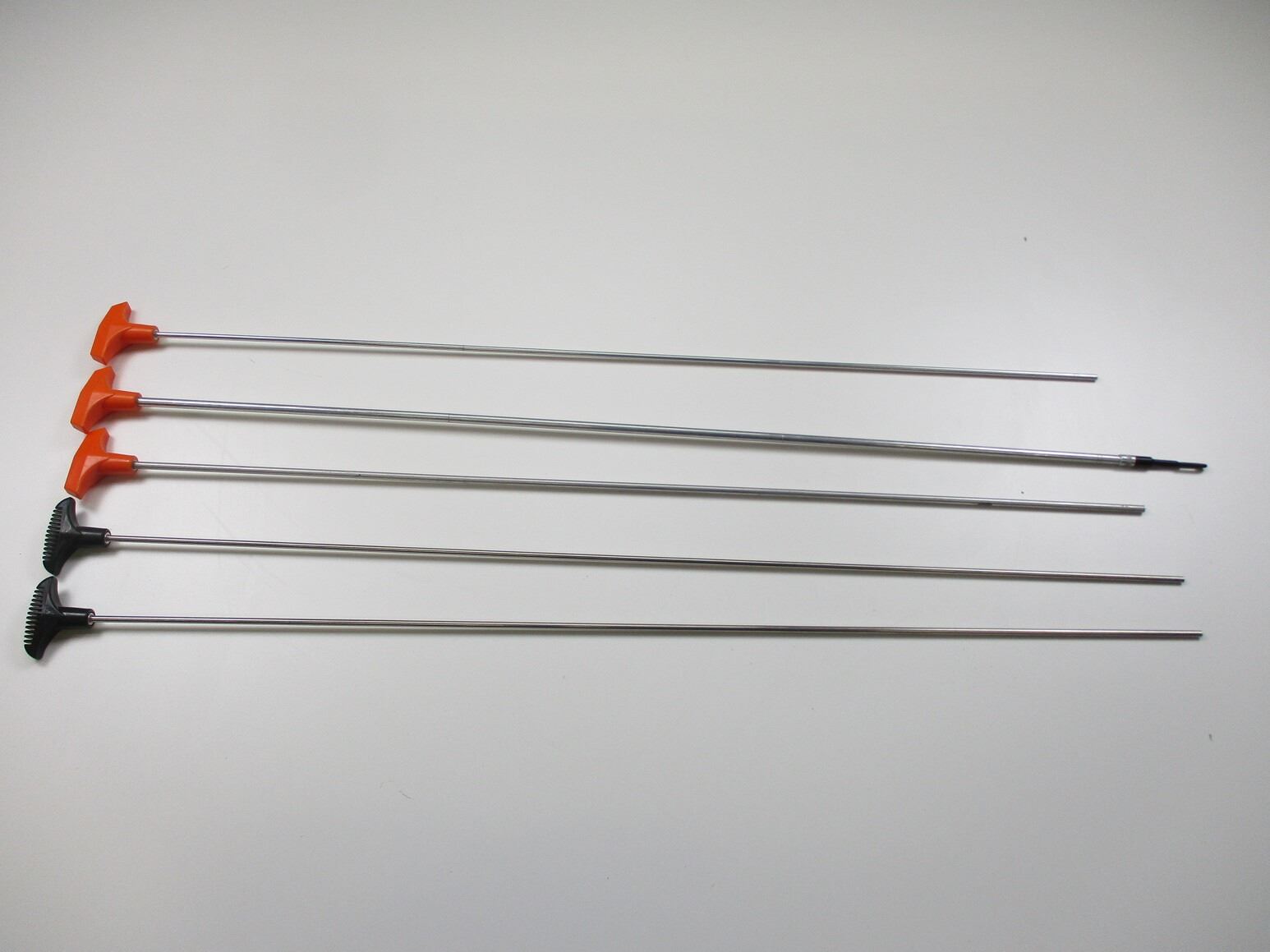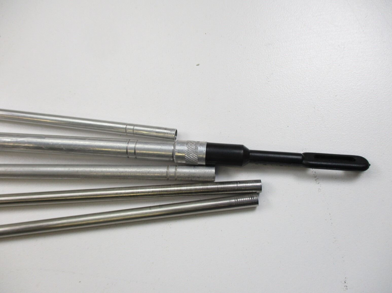 ASSORTED RIFLE & SHOTGUN CLEANING RODS , INCLUDES: (4) RIFLES STYLE 3 PIECE ALUMINUM CLEANING RODS, (1) SHOTGUN STYLE 3 PIECE ALUMINUM CLEANING ROD, WITH CLEANING PATCH TIP. MFG'D BY HOPPE'S