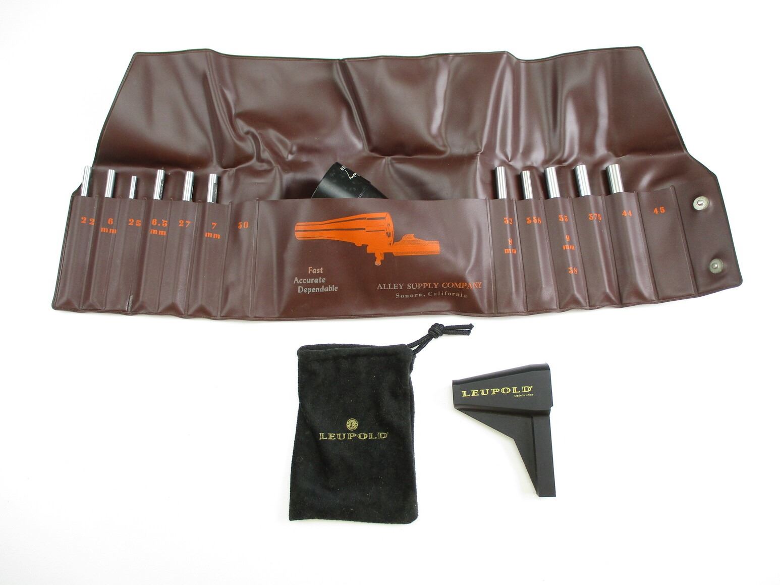 ASSORTED BORE SIGHTER , INCLUDES: LEUPOLD MINI BORE SIGHTER, CLEAR OPTICS, (1) SITE-A-ALINE, SPORTSMAN'S MODEL, CLEAR OPTICS, INCLUDES MULTIPLE MUZZLE ADAPTERS, FOR .22 UU TP .44, SEE PHOTO.