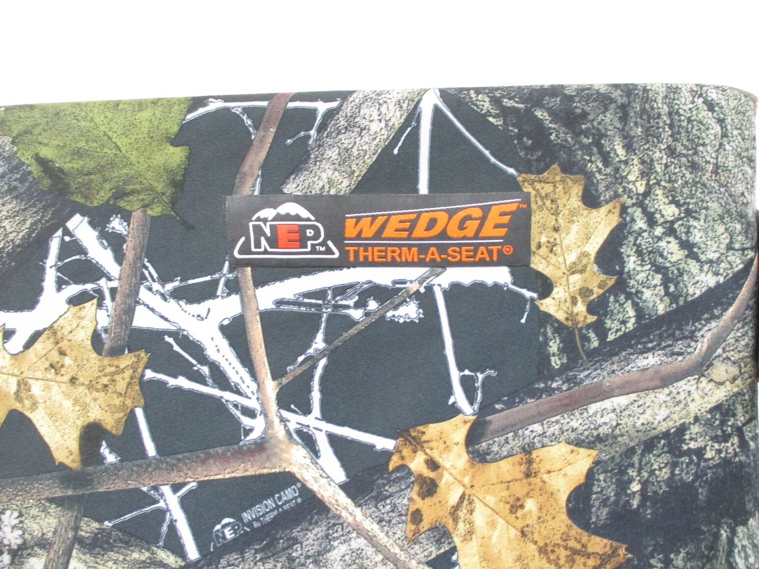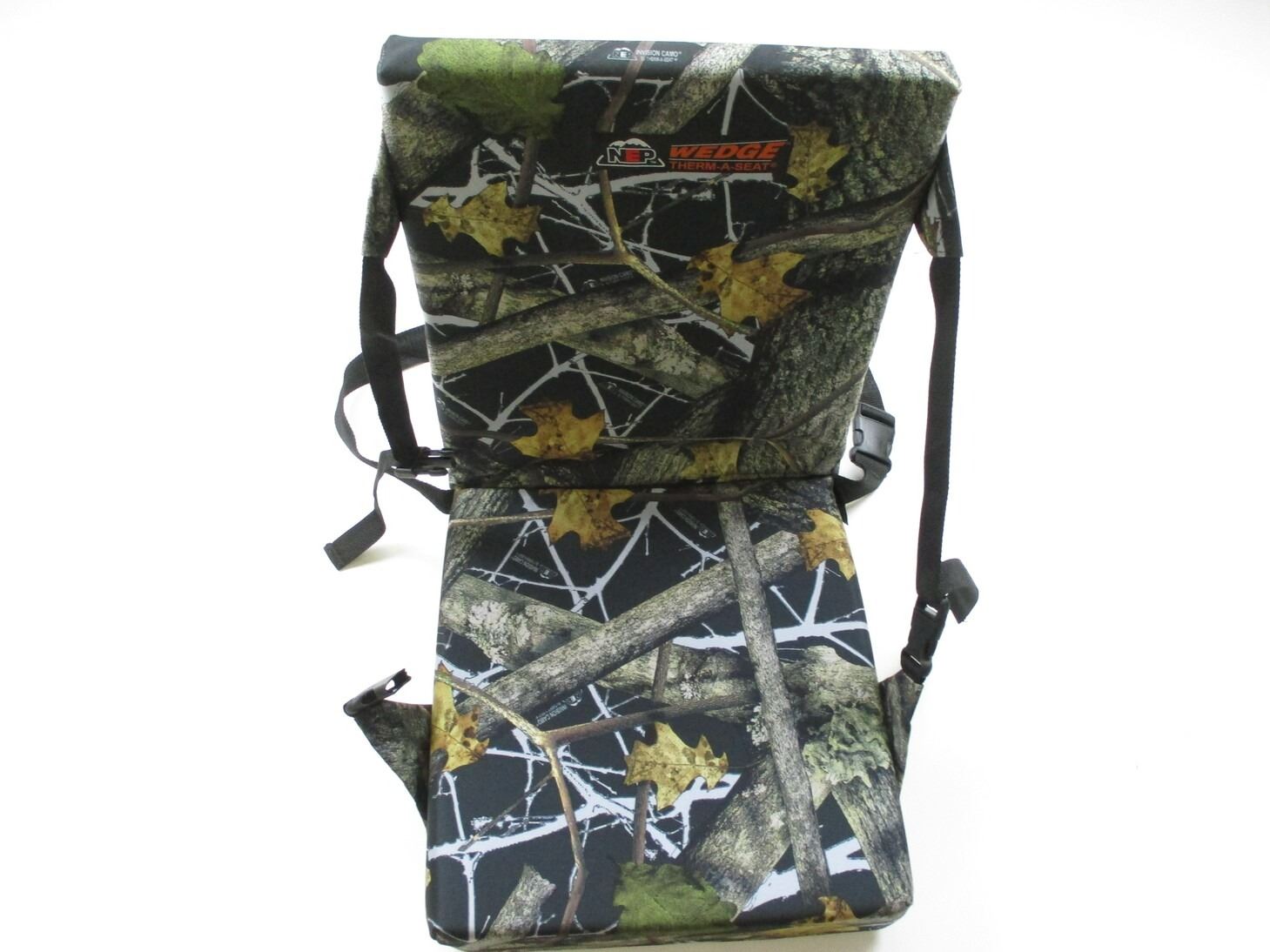 NEP WEDGE THERM-A-SEAT ETC, WITH SELF-SUPPORTING STRAPS, (STRAPS ARE ADJUSTABLE), & CARRY / ANCHOR STRAP, APPROX. 14 X 15" SEATING AREA, APPROX. 17.5" BACK REST, "INVISION CAMO".