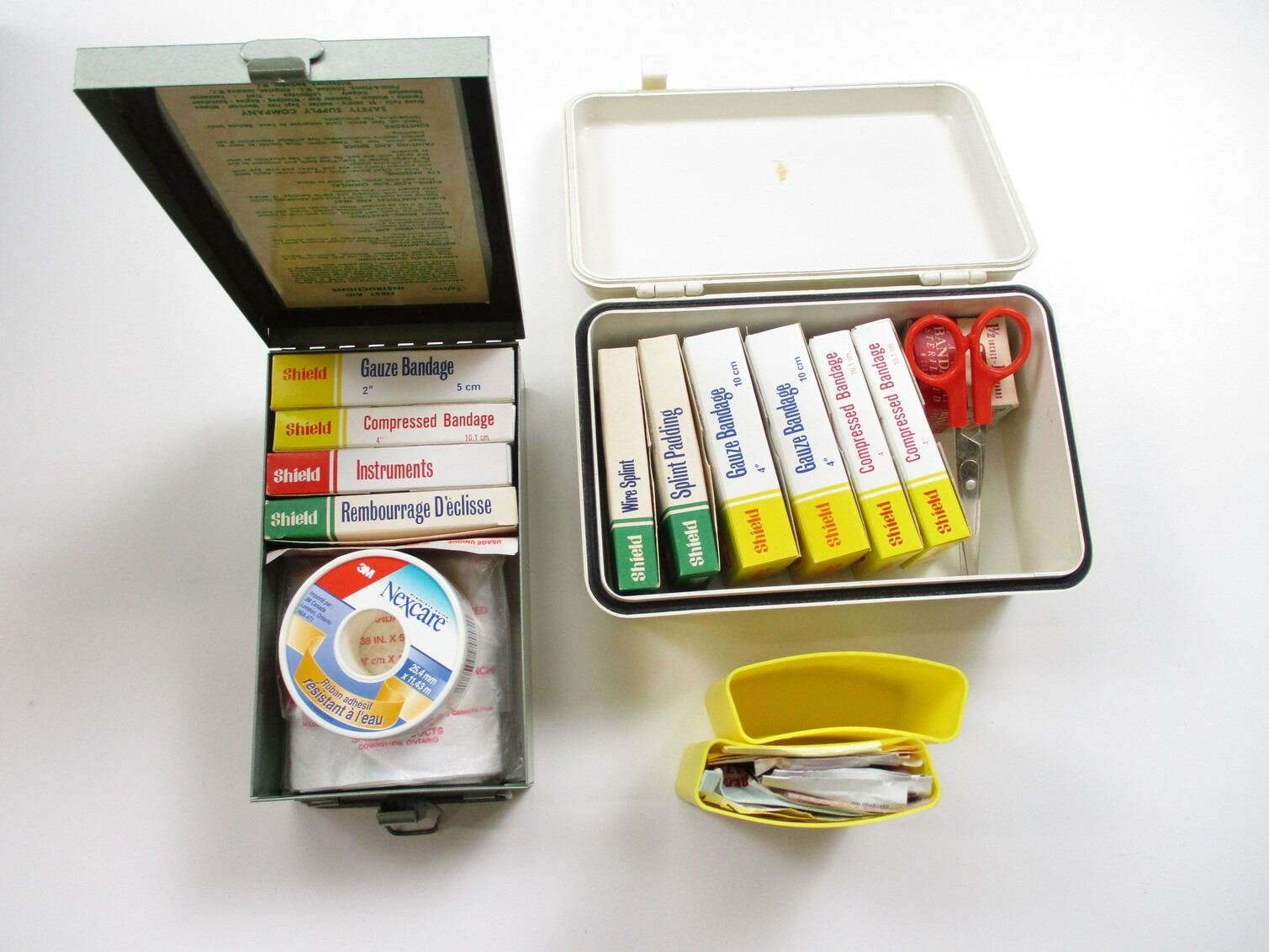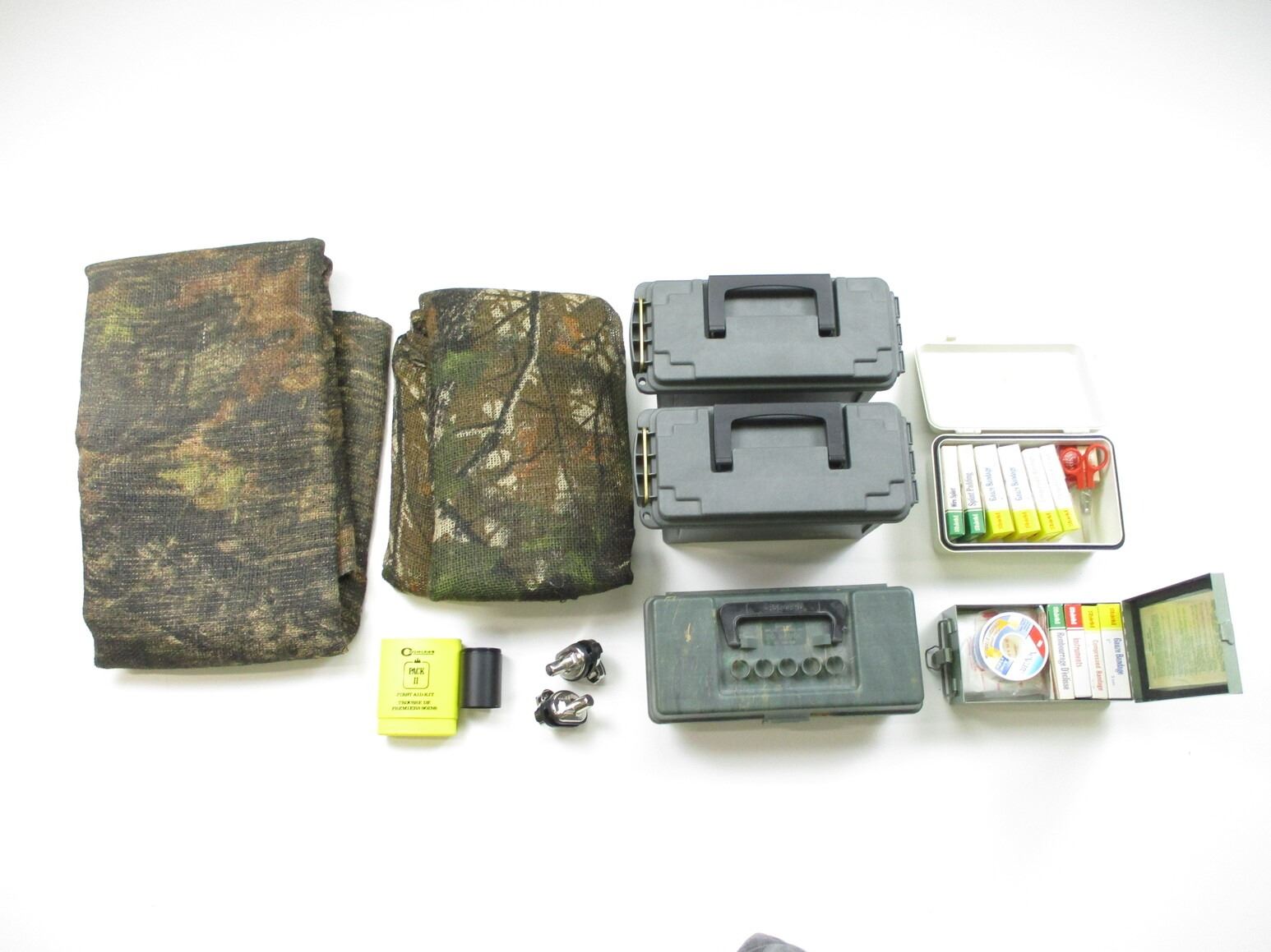 ASSORTED AMMO BINS / FIRST AID KITS, ETC. , INCLUDES: (2) AMMO BINS, APPROX. 11 X 5 X 7", BY CABELA'S, (3) ASSORTED FIRST AID KITS, WITH GAUZE, SPLINT PADDING & WIRE SPLINTS, COMPRESSED BANDAGES, ETC. (UNSURE OF EXPIRY DATE), (2) COMBO TRIGGER LOCKS, (WITH CODE), (1) RIFLE SCOPE SUN SHADE, (1) 20 GAUGE AMMO BIN, APPROX. 11 X 5 X 4", (2) BIG PIECES OF CAMO BURLAP, APPROX. 112" X 52".
