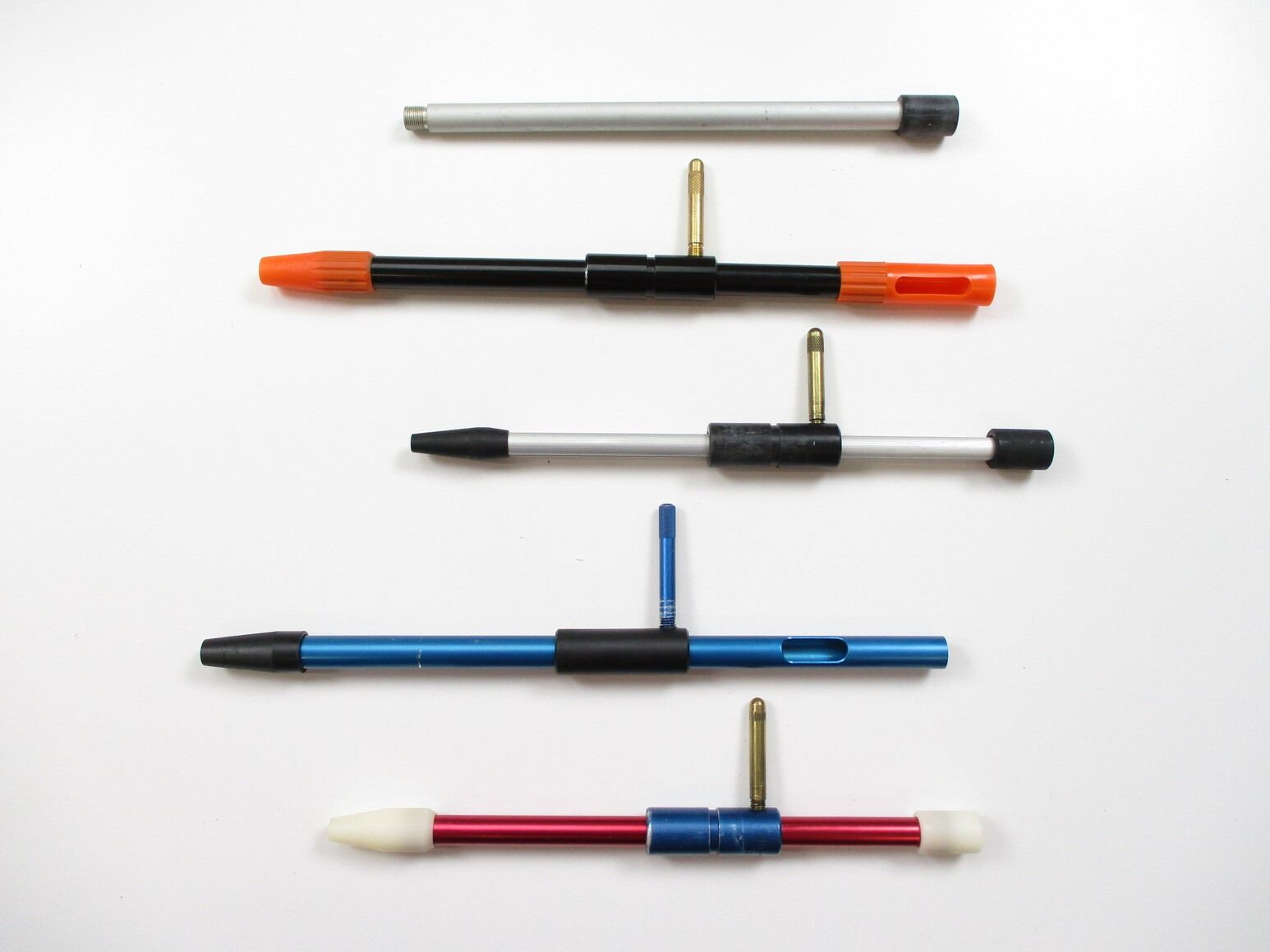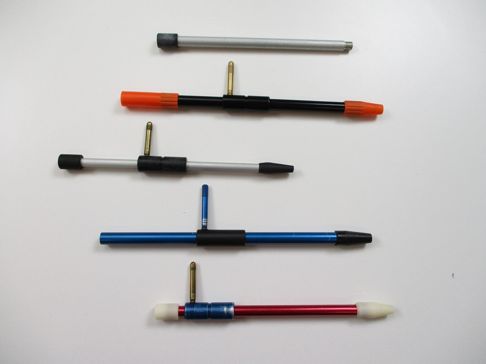ASSORTED BORE GUIDES , LOT OF 4, PLASTIC & ALUMINUM CONSTRUCTION, WITH PLASTIC TIP TO FIT IN CHAMBER, CALIBERS NOT MARKED, (1) BLUE ALUMINUM WITH APPROX. 0.53" DIAMETER TIP, APPROX. 0.50" DIAMETER TUBE, (1) BLACK & ORANGE PLASTIC GUIDE, APPROX. 0.52" TIP, APPROX. 0.50" TUBE, (1) ALUMINUM & BLACK, APPROX. 0.40" DIAMETER TIP, APPROX. 0.37" TUBE, (1) RED ALUMINUM, APPROX. 0.52" TIP & APPROX. 0.43" TUBE. SEE PHOTO.