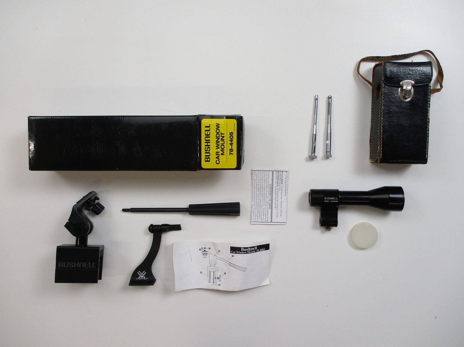 BORE SIGHT & WINDOW MOUNT , (1) BUSHNELL BORE-SIGHTER CLEAR OPTICS, INCLUDES .22 TO .270 & .35 RO 7MM ADAPTERS. (1) BUSHNELL WINDOW MOUNT FOR SPOTTING SCOPE, (1) VORTEX SPOTTING SCOPE ATTACHMENT.