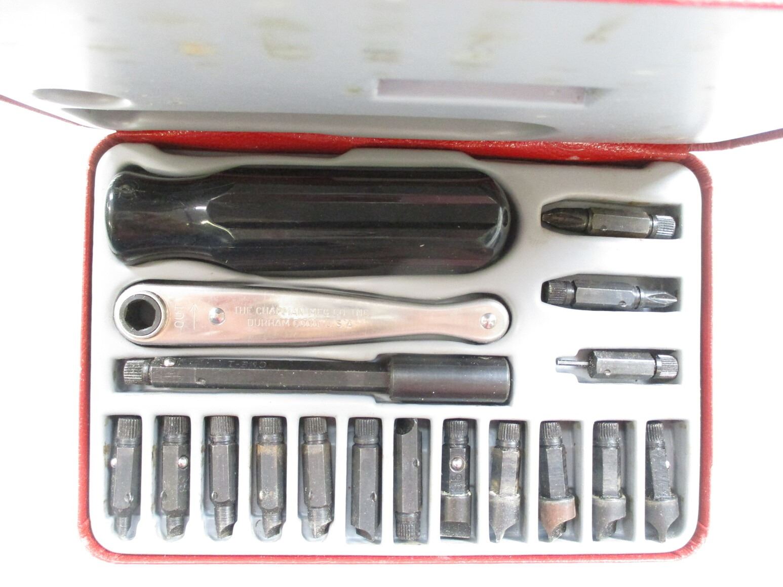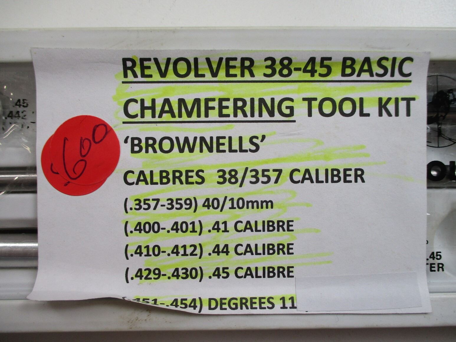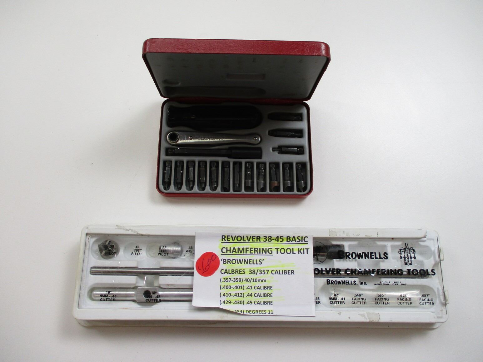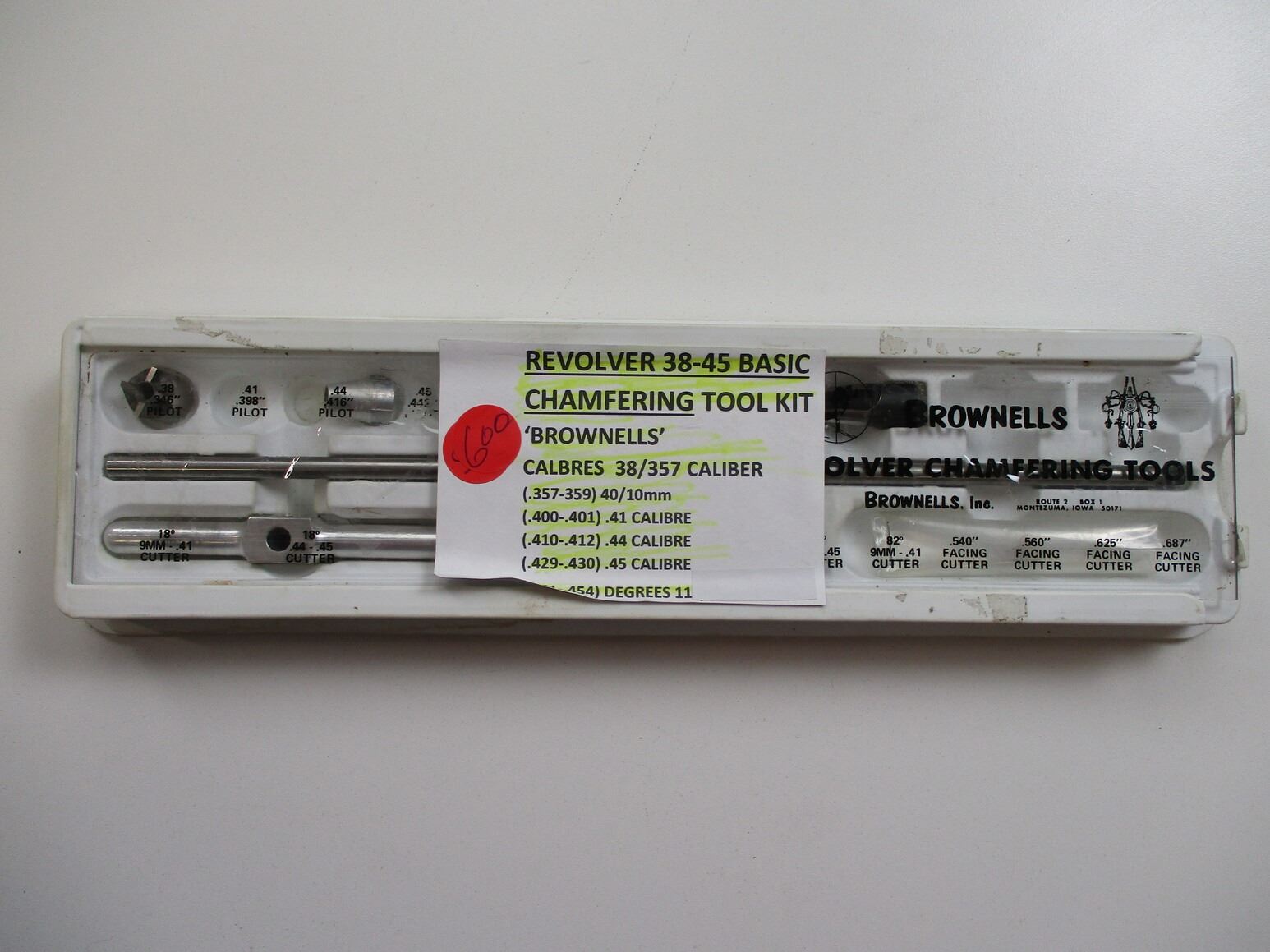 BROWNELLS REVOLVER .38-.45 BASIC CHAMBERING TOOL KIT ETC, INCLUDES PILOT, RIMIER, ETC. .38/.257 CALIBER, DIGRESS: 11, ETC. (1) GUN SCREW DRIVER KIT, MFG'D BY CHAPMAN, APPEARS COMPLETE.,