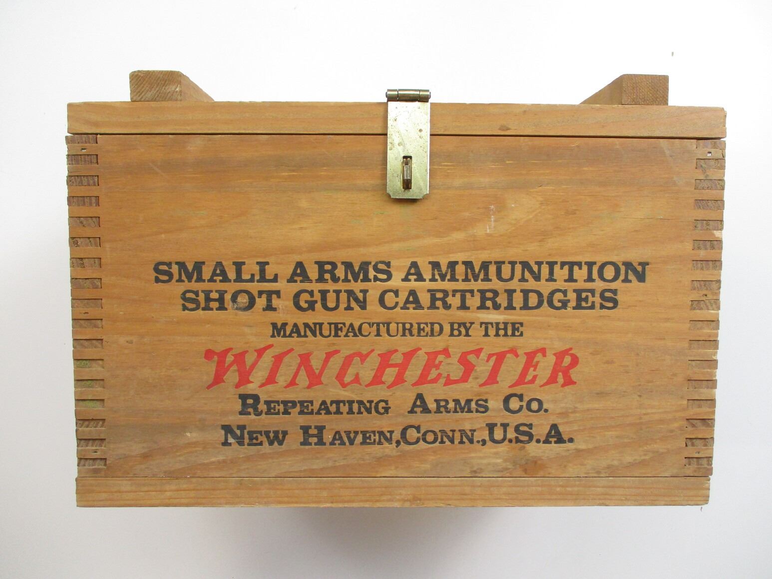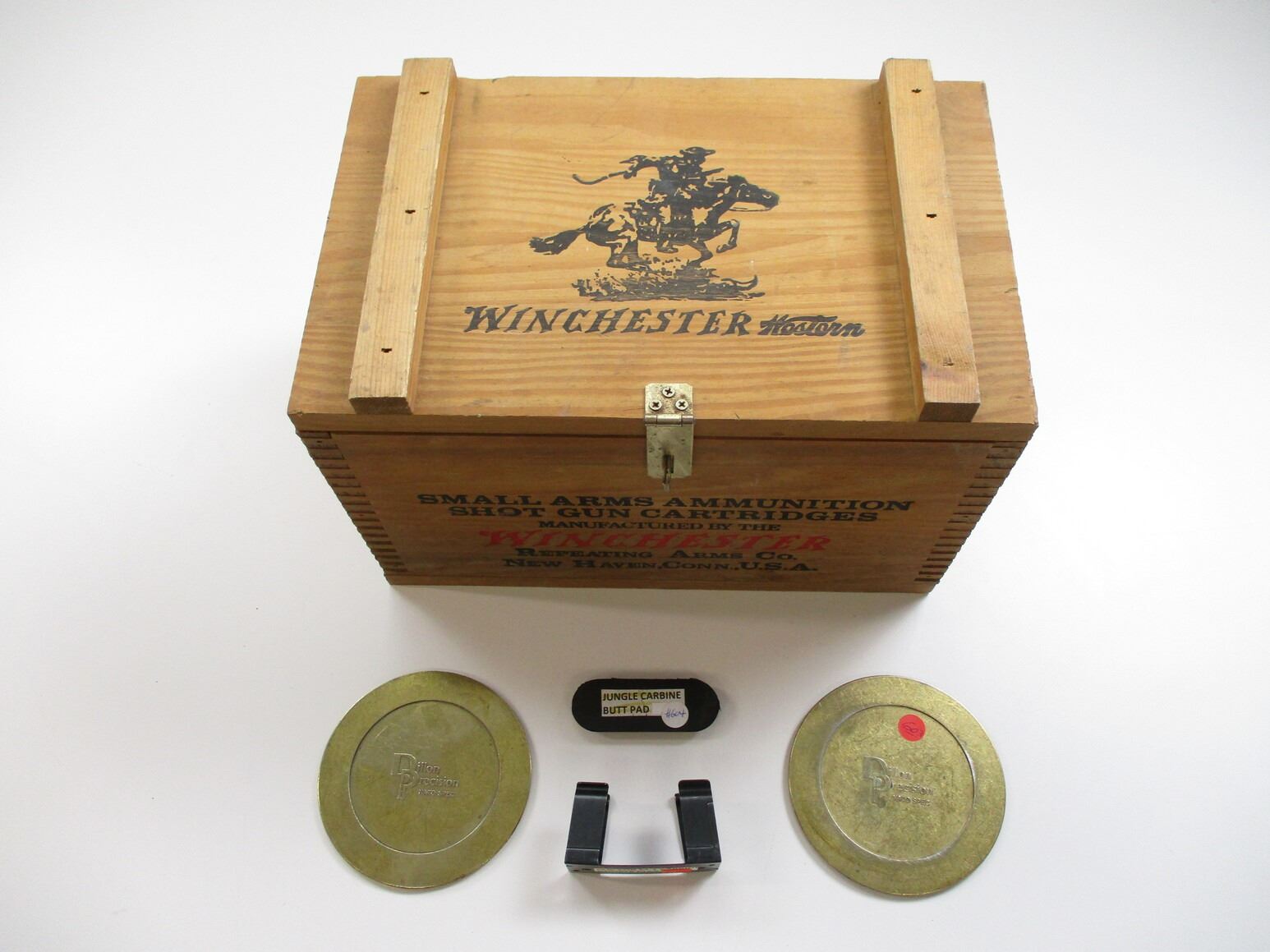 WINCHESTER AMMO CRATE ETC, (1) WINCHESTER SMALL ARMS AMMUNITION SHOTGUN CARTRIDGES, APPROX. 16 X 10 X 10", ALSO INCLUDES NO.5 JUNGLE CARBINE BUTT PAD, 1-M CARBINE MAG CLIP, (1) BRASS PRIMER TRAY.