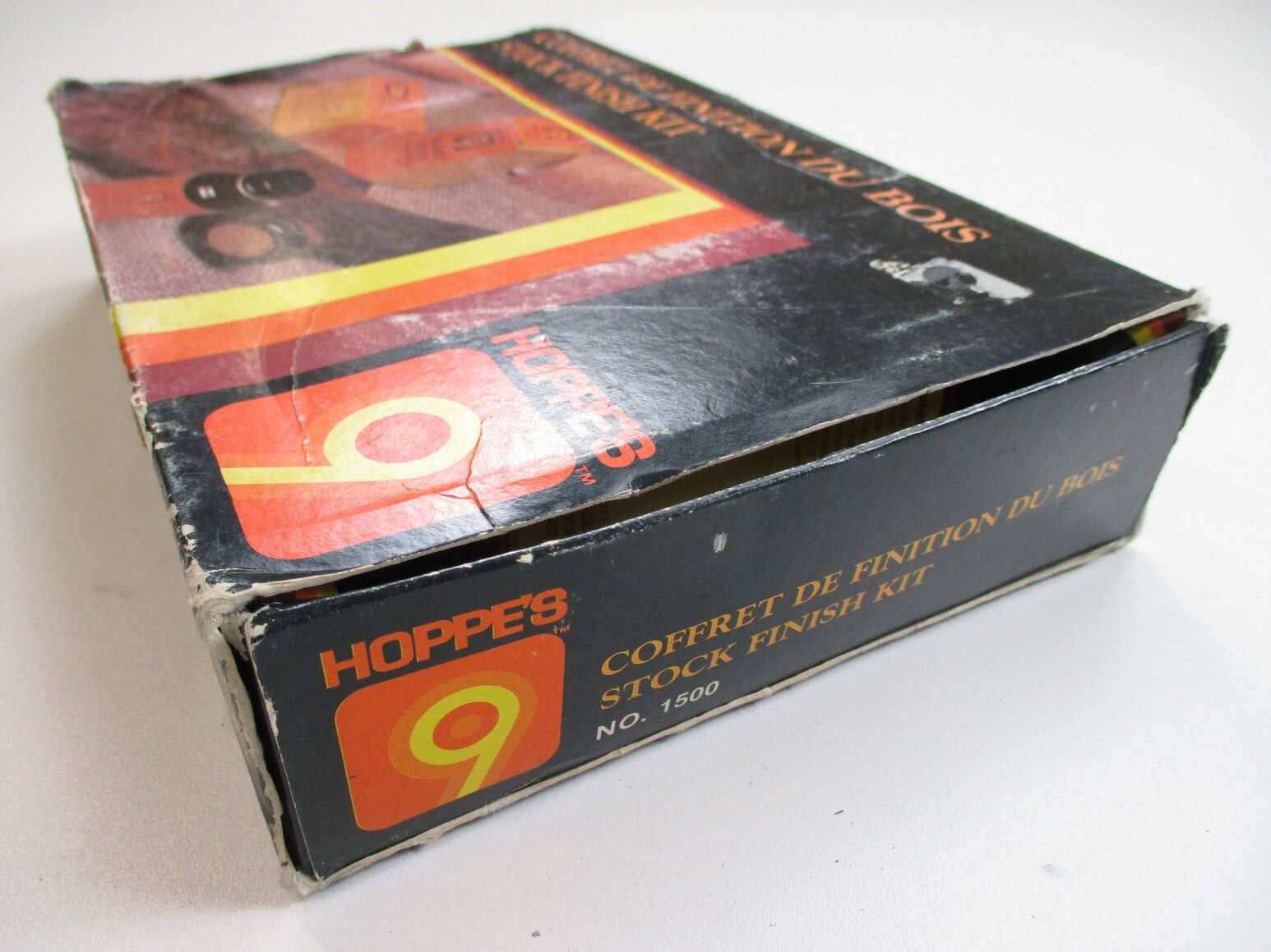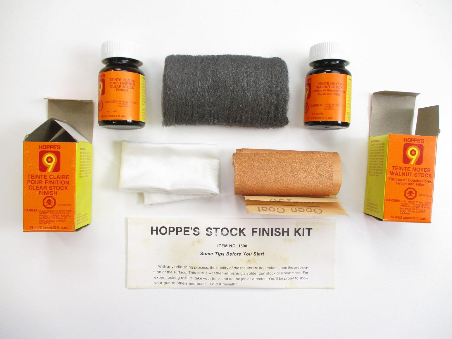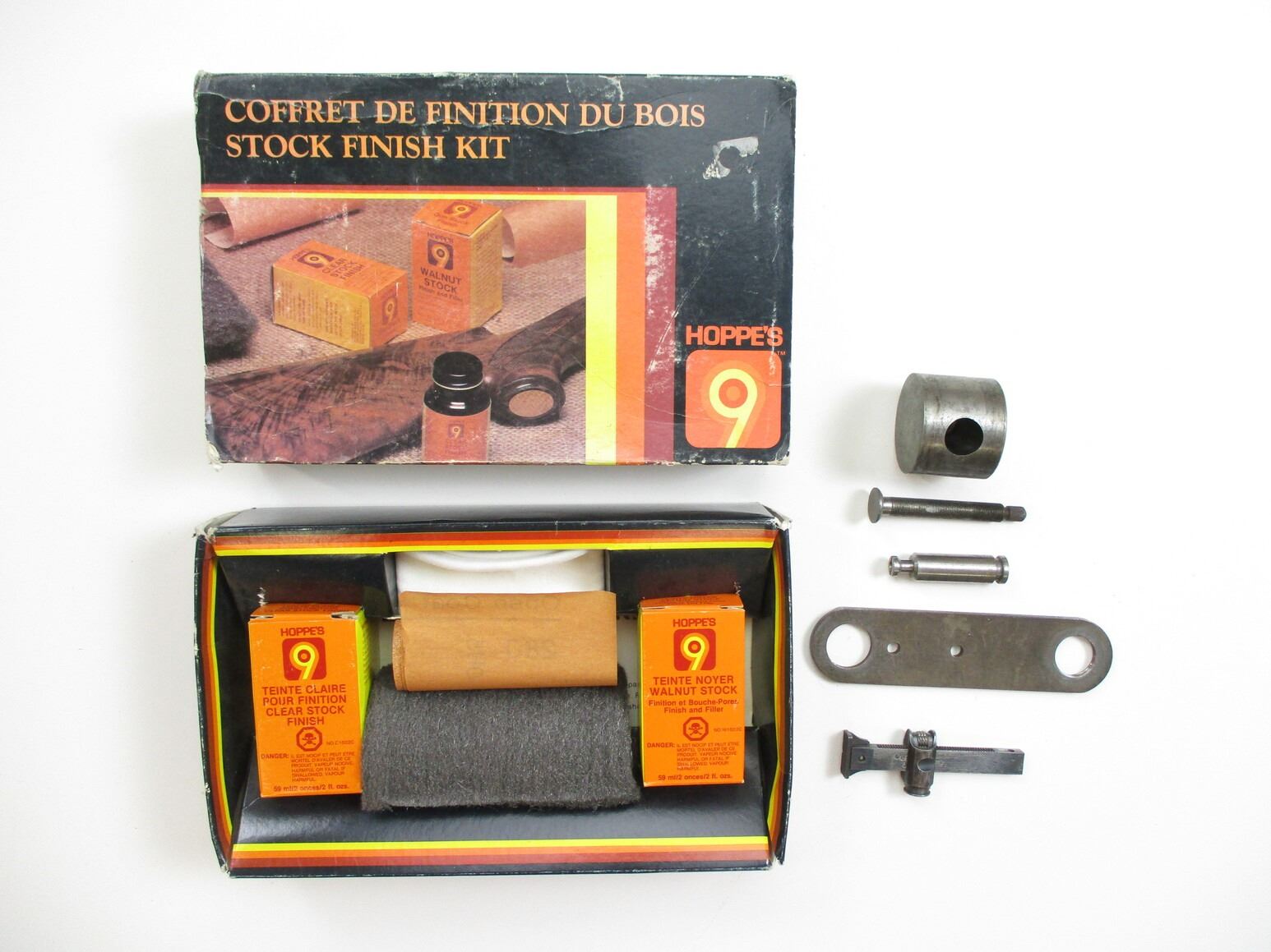 STOCK FINISH KIT ETC, (1) HOPPES 9 STOCK FINISH KIT, APPEARS USED, & POSSIBLY INCOMPLETE, ALSO INCLUDES UNKNOWN REAR ADJUSTABLE RIFLE SIGHT, ETC.