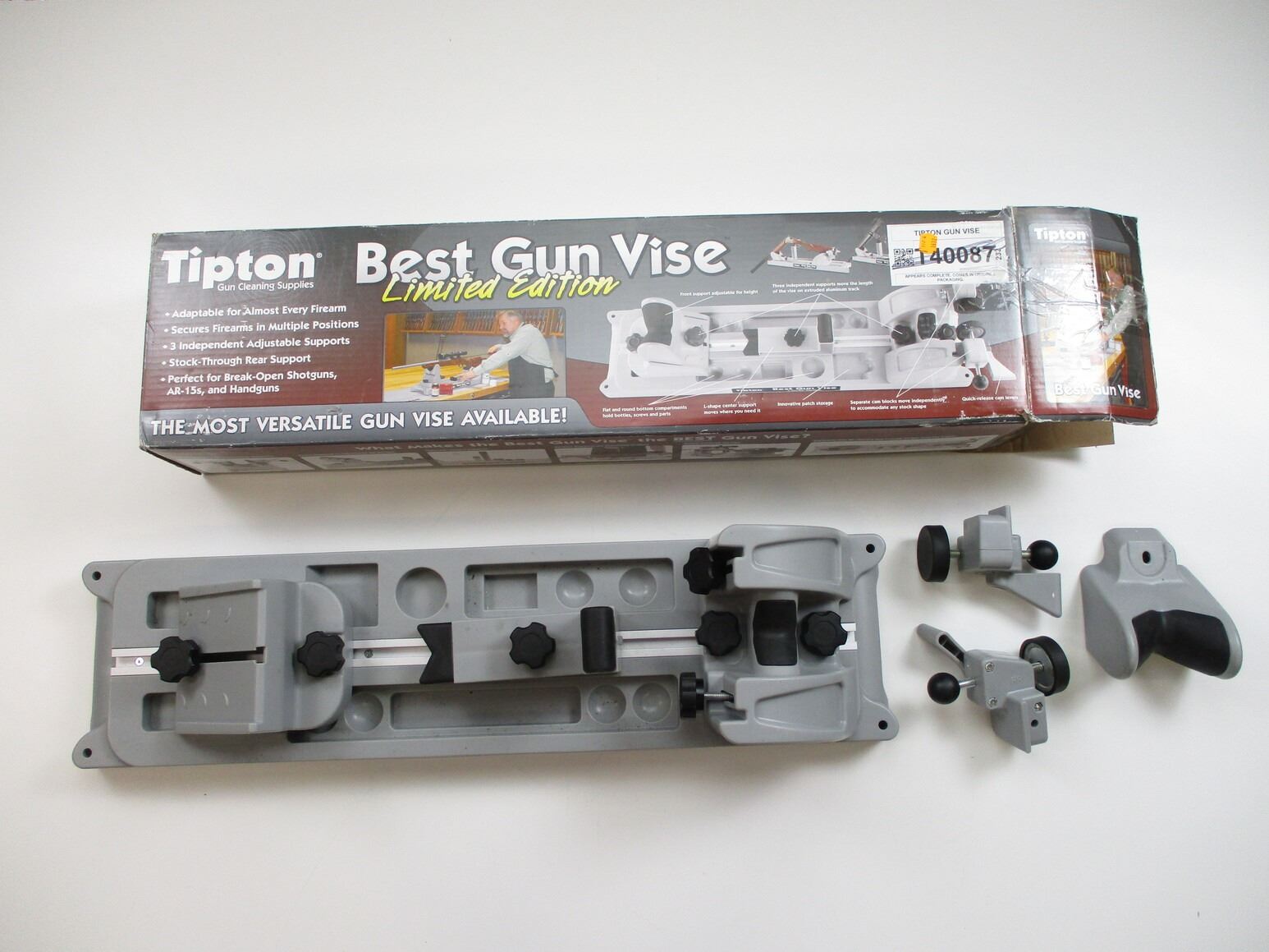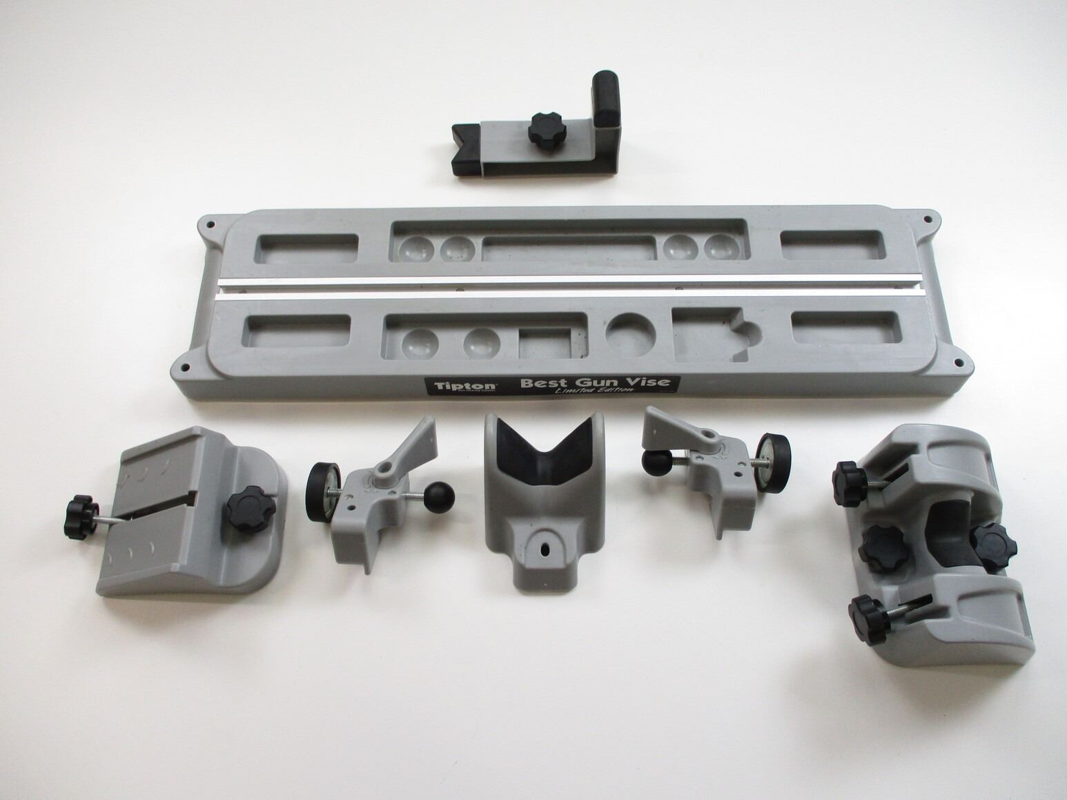 TIPTOP BEST GUN VISE, LIMITED EDITION, APPEARS COMPLETE WITH ALL PARTS, APPROX. 31.25 X 8" BASE, COMES IN ORIGINAL PACKAGE, ALSO INCLUDES BORE LIGHT ATTACHMENTS.