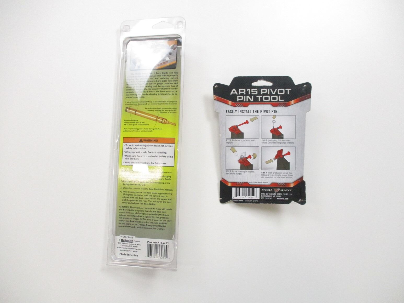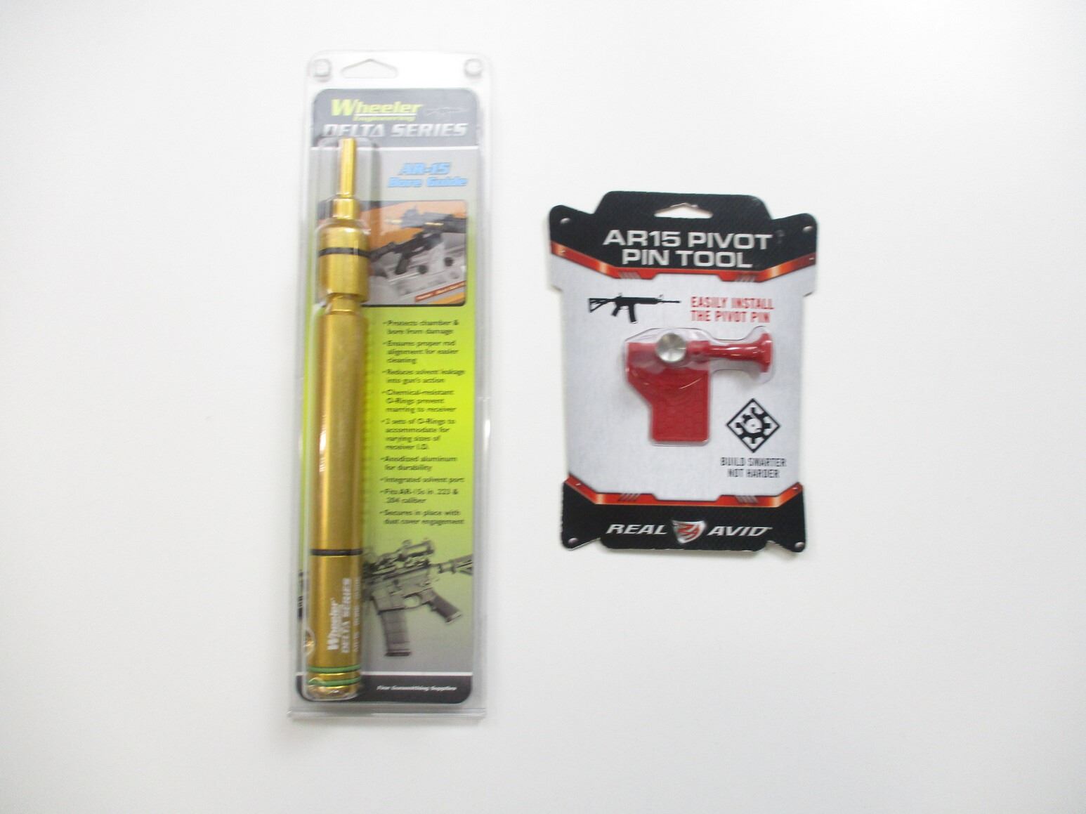 AR-15 ACCESSORIES , INCLUDES: (1) WHEELER ENGINEERING DELTA SERIES AR-15 BORE GUIDE, APPEARS NOS IN ORIGINAL PACKAGE, (1) AR-15 PIVOT PIN TOOL, NOS, IN ORIGINAL PACKAGE.