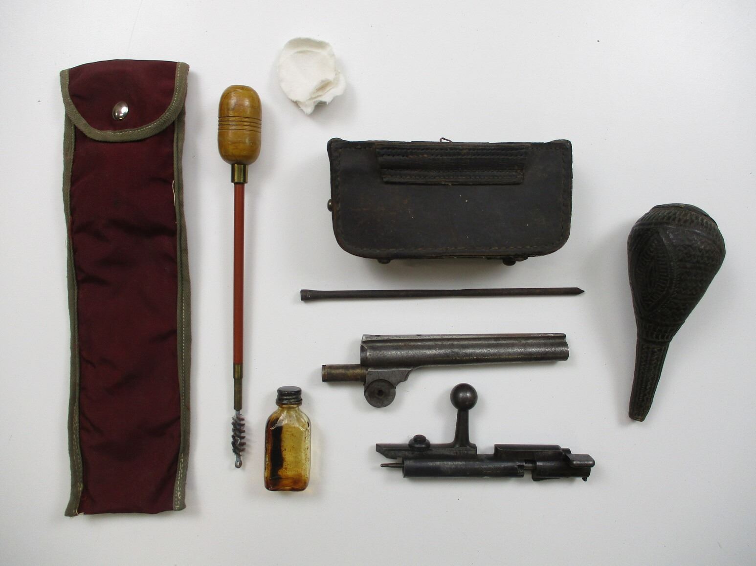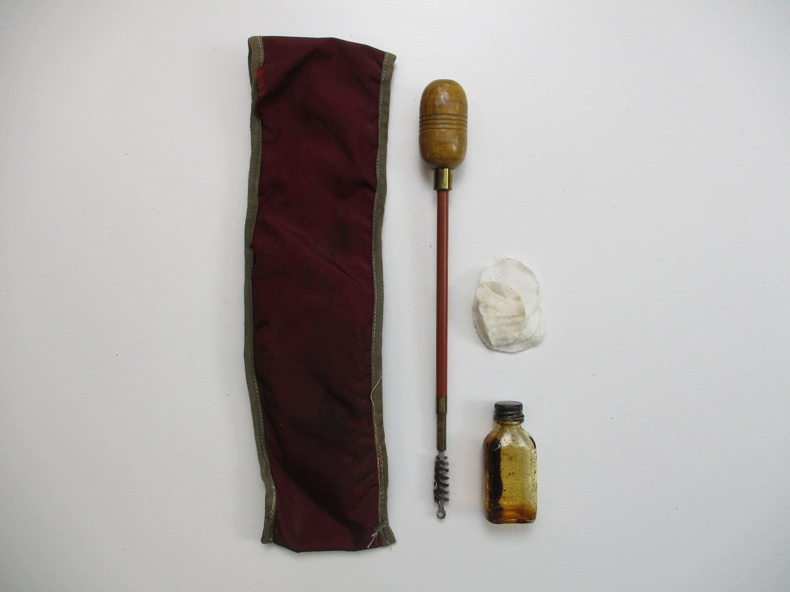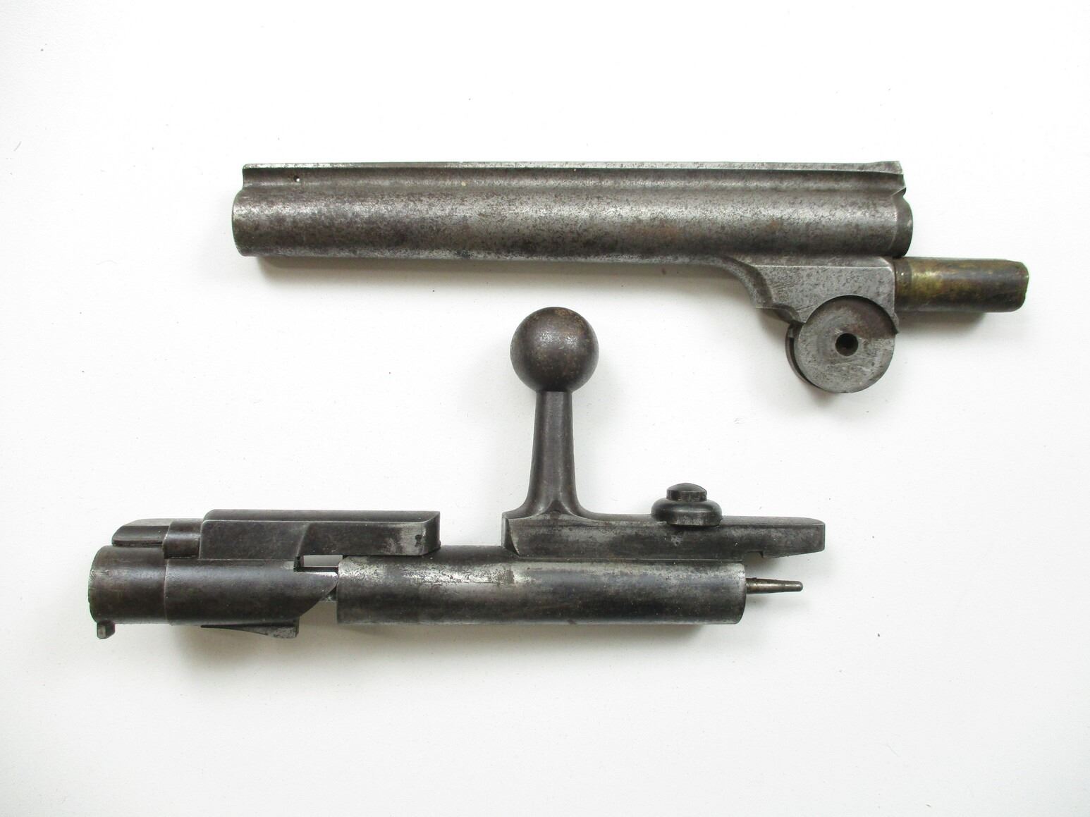 ASSORTED ACCESSORIES , INCLUDES: UNKNOWN REVOLVER BARREL, 6.5" OAL, POOR BORE, DRILLED & TAPPED ON TOP, WITH BRASS CYLINDER FITTING, MAY REQUIRE FITTING, (1) SHOTGUN TYPE CLEANING ROD, WITH APPROX. 0.30" DIAMETER, (1) 71 MAUSER BOLT, INCOMPLETE, MISSING BOLT HEAD, MARKED "1306", ETC.