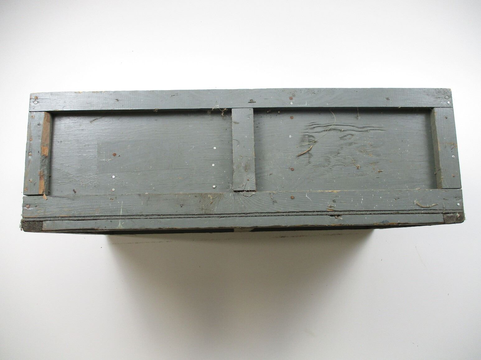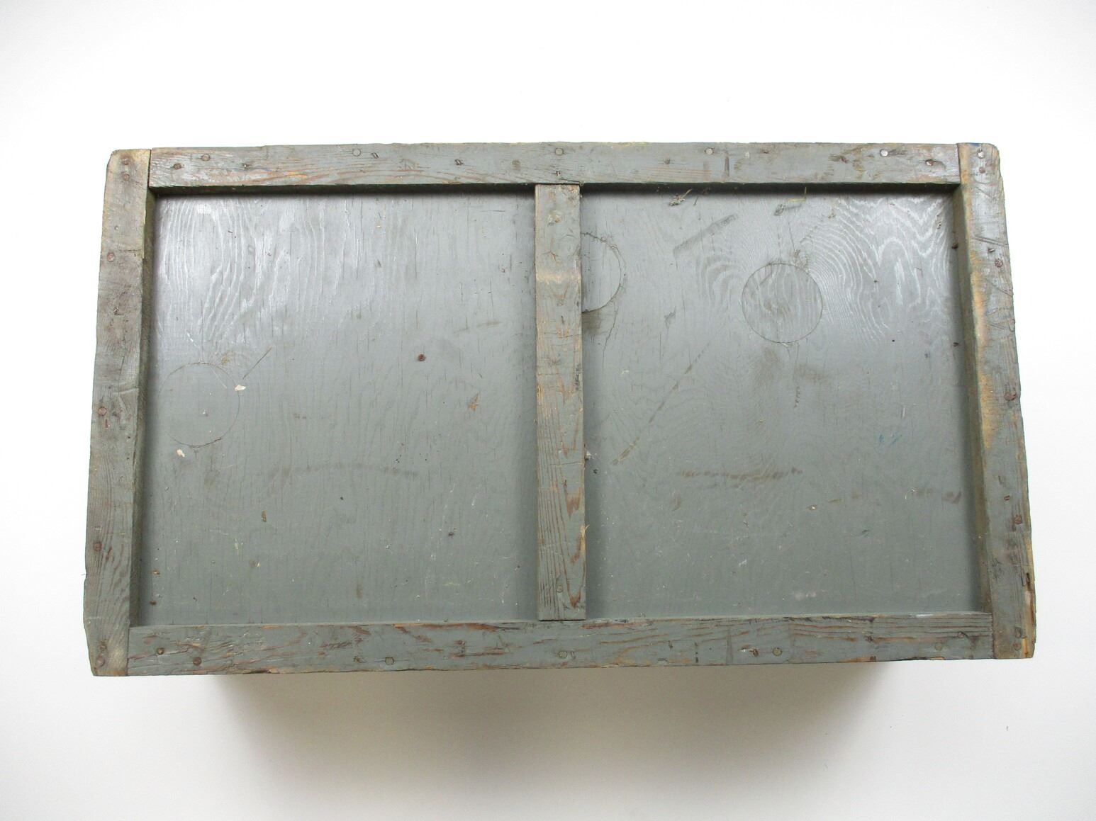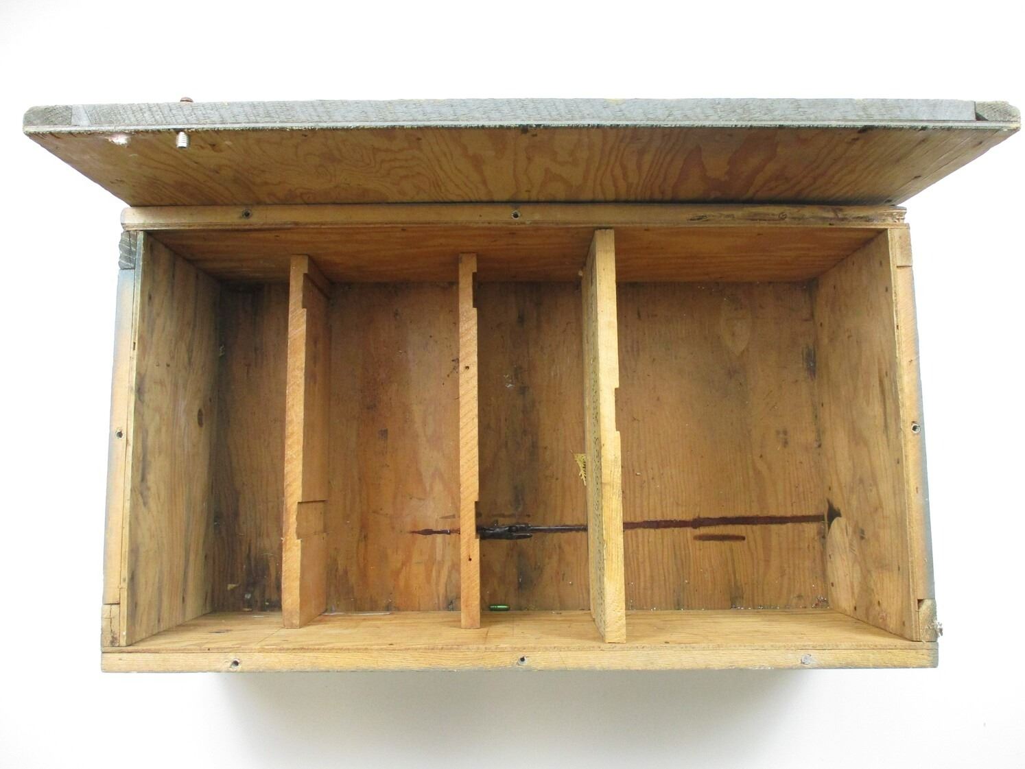 WOODEN STORAGE CRATE , WITH DIVIDERS, & LID, APPROX. 32.5" X 18.5" X 11.5", WITH VARIOUS MARKINGS INSIDE.