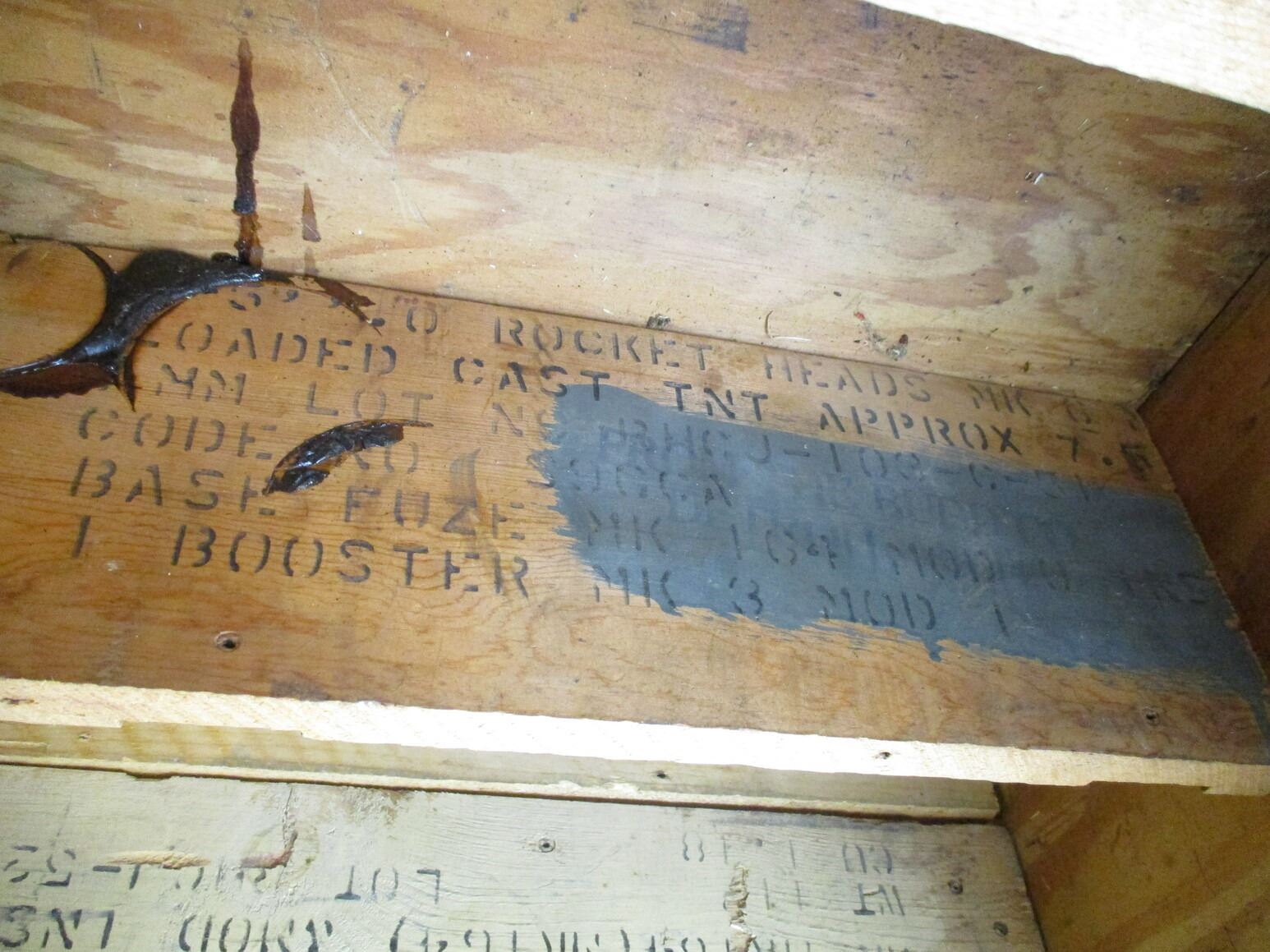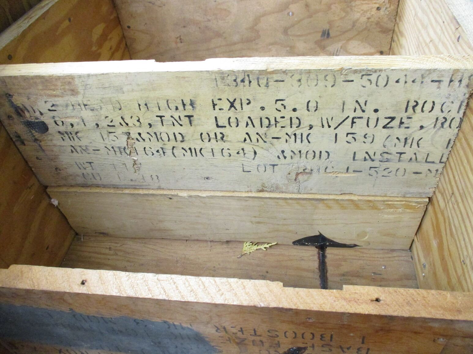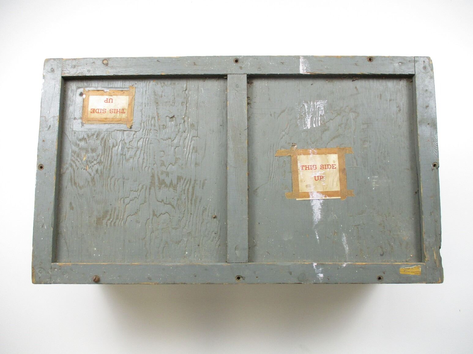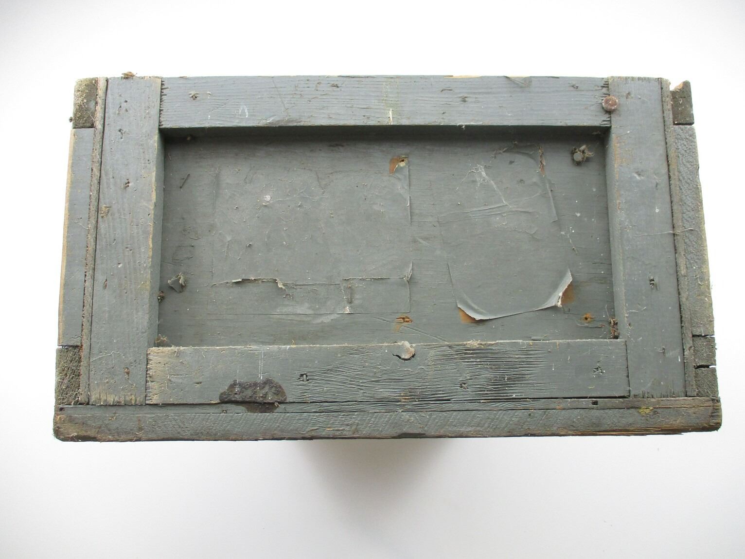 WOODEN STORAGE CRATE , WITH DIVIDERS, & LID, APPROX. 32.5" X 18.5" X 11.5", WITH VARIOUS MARKINGS INSIDE.