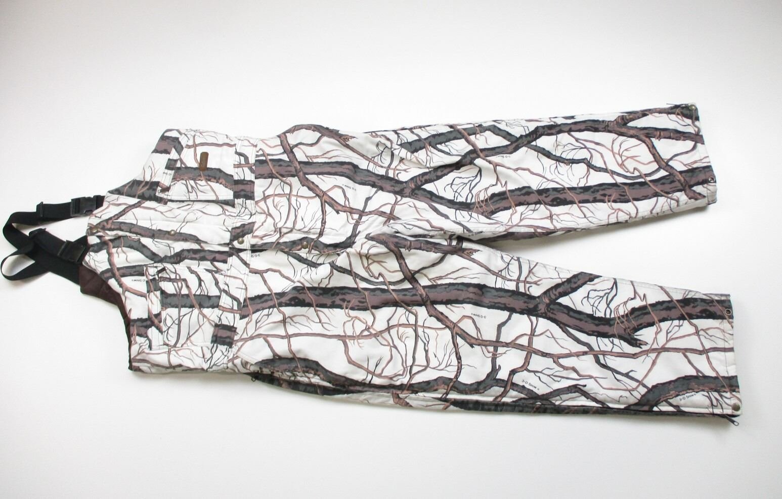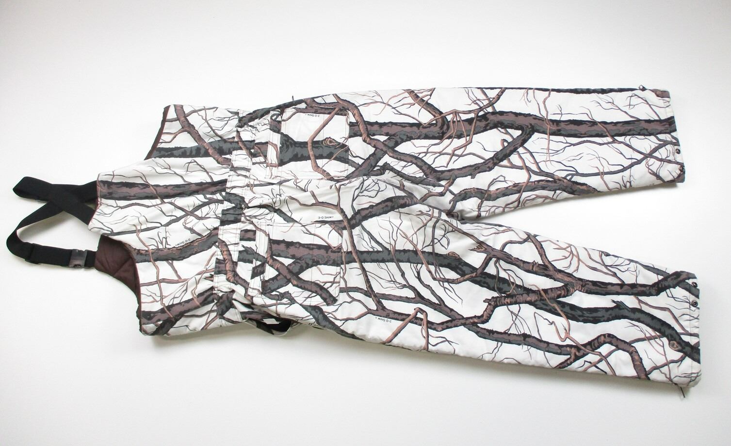 CABELAS HUNTING TYPE OVER ALLS , SIZE: X- LARGE TALL, WITH ADJUSTABLE SUSPENDERS & VARIOUS POCKETS, "3-D SNOW" CAMO, APPEARS NOS OR SLIGHTLY USED.