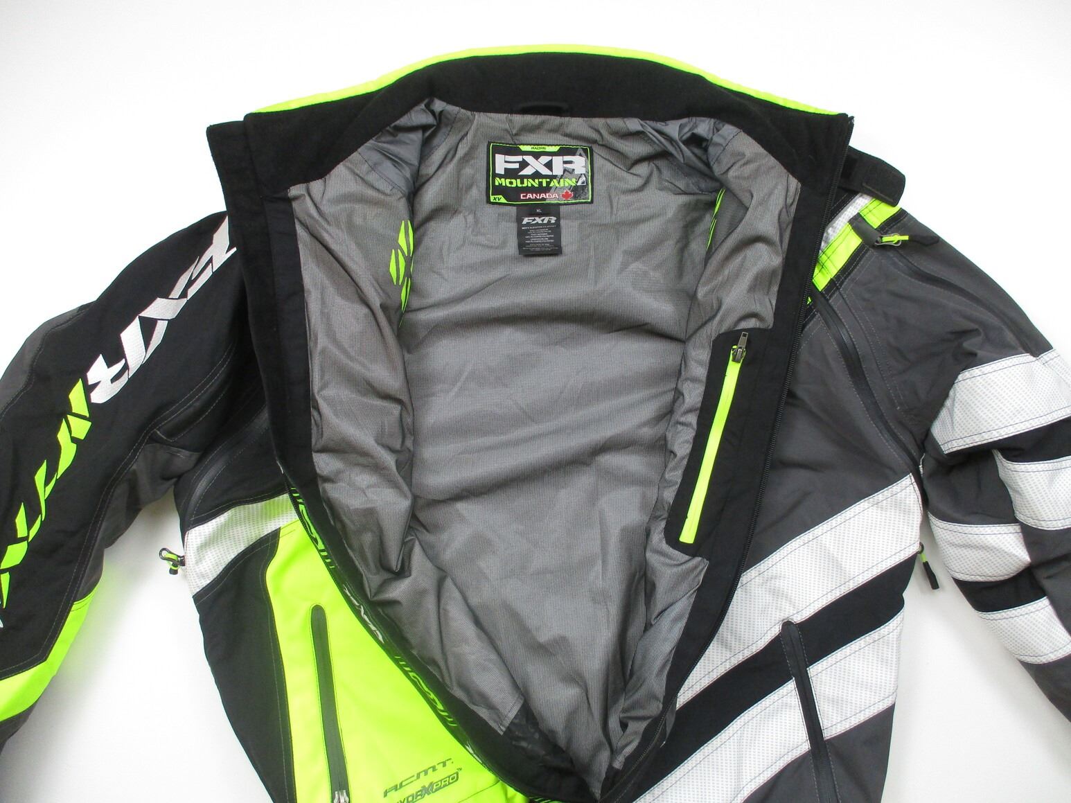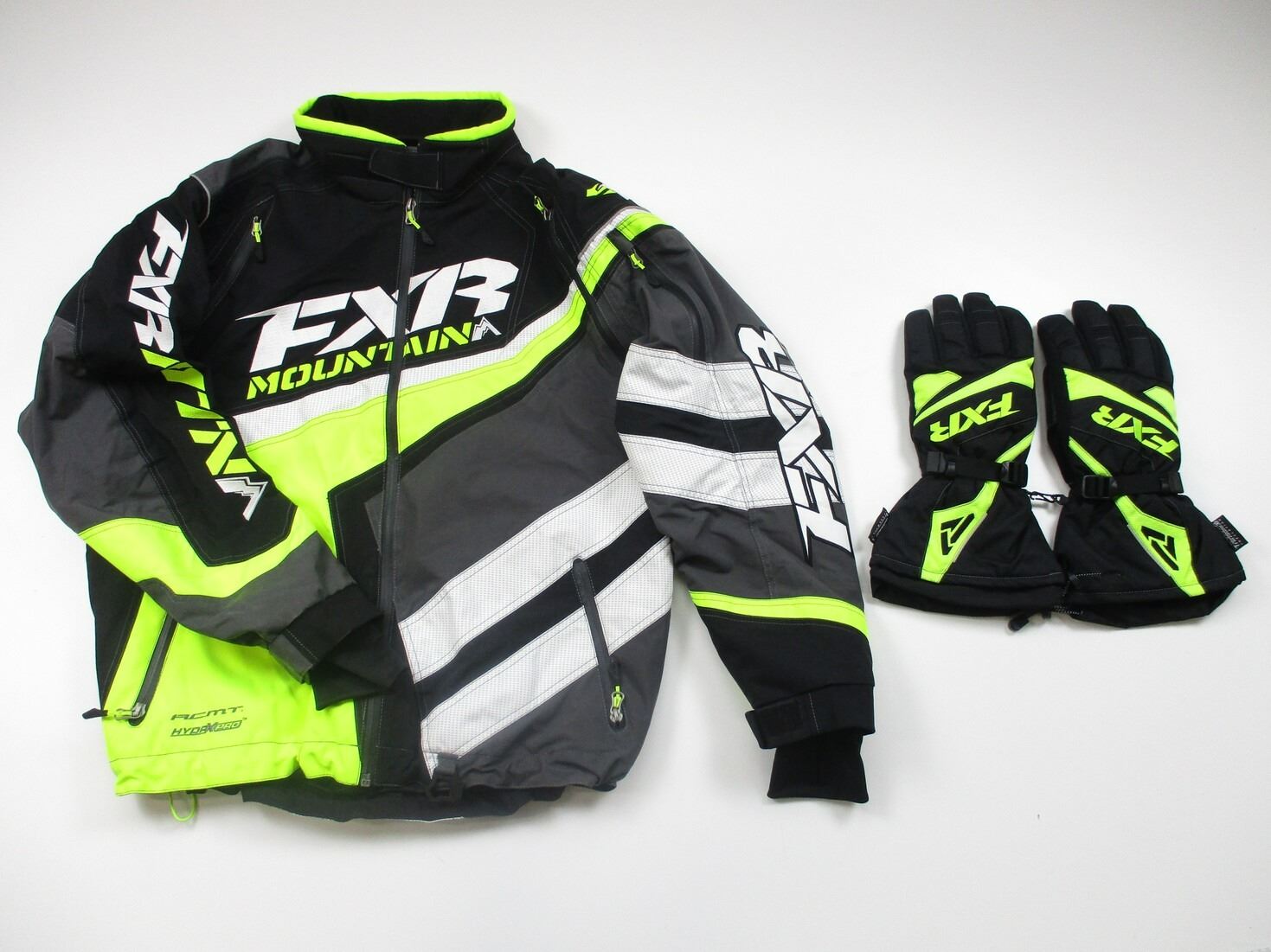 FXR MOUNTAIN RACING COAT ETC , HYDR X PRO, SIZE: XL, LIME GREEN, BLACK, GREY & WHITE, WITH FRONT & ARM ZIP UP POCKETS, APPEARS NOS OR SLIGHTLY USED. INCLUDES MATCHING WINTER / RIDING GLOVES. SEE PHOTOS.