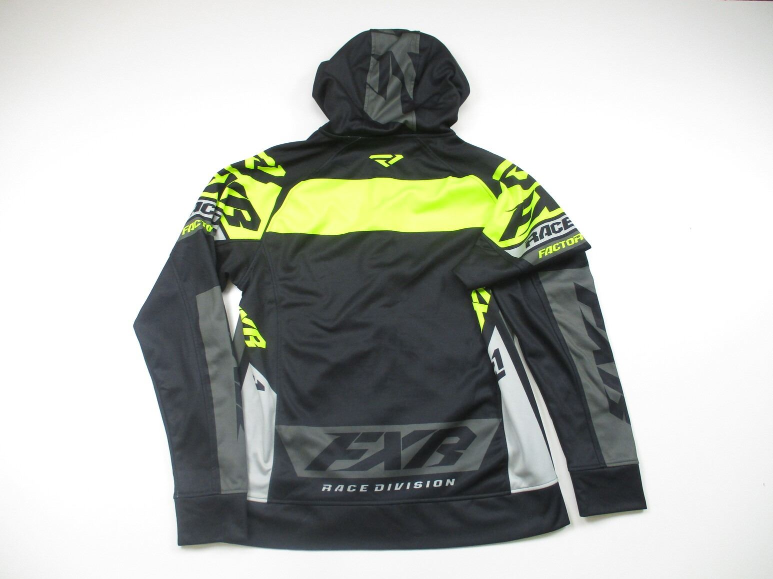 FXR RACE DIVISION ZIP UP HOODIE , SIZE: XL, LIME GREEN, BLACK & GREY, WITH FRONT HOODIE STYLE POCKETS, APPEARS NOS OR SLIGHTLY USED, NOTE: SLIGHT MARK ON RIGHT SIDE POCKET. SEE PHOTO.