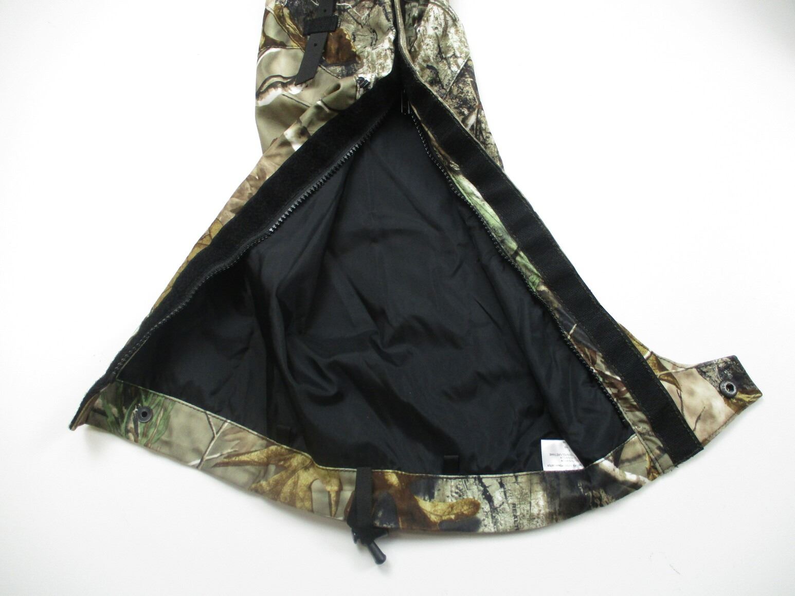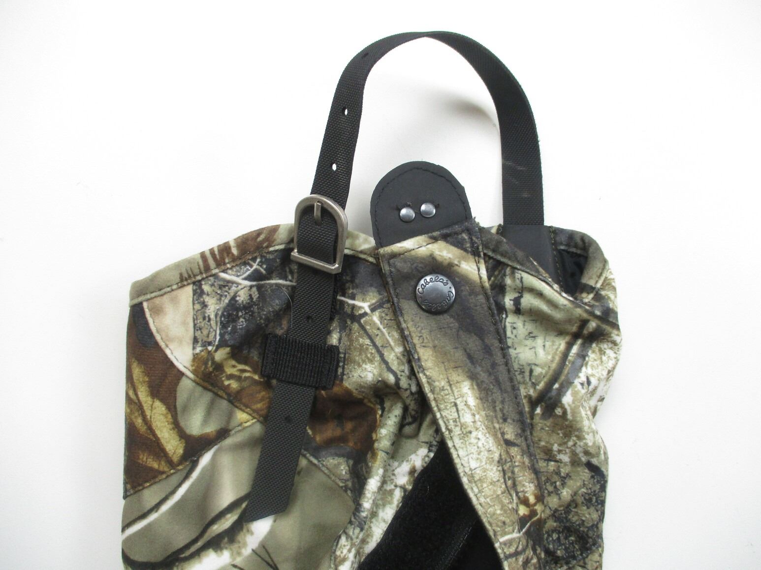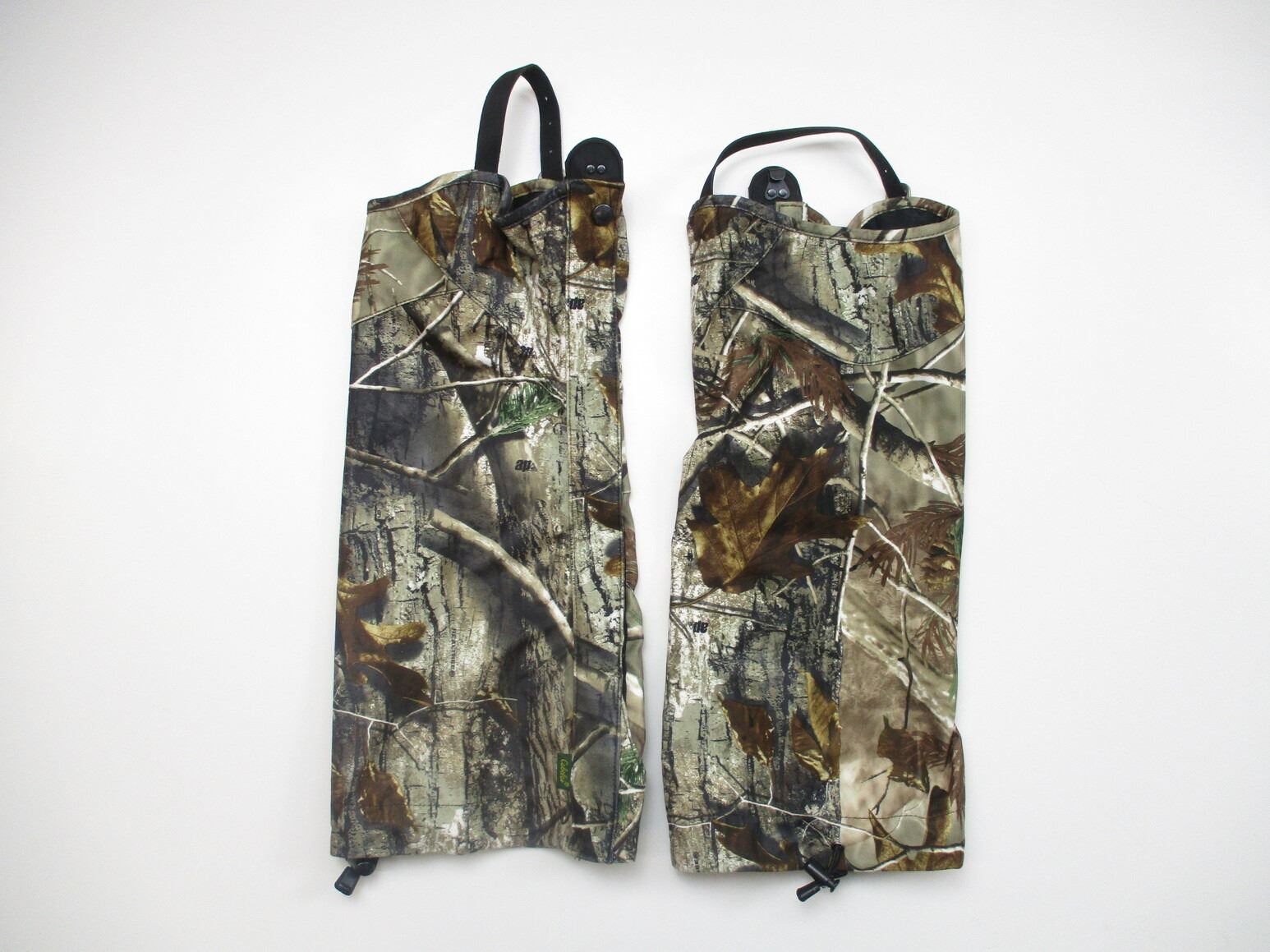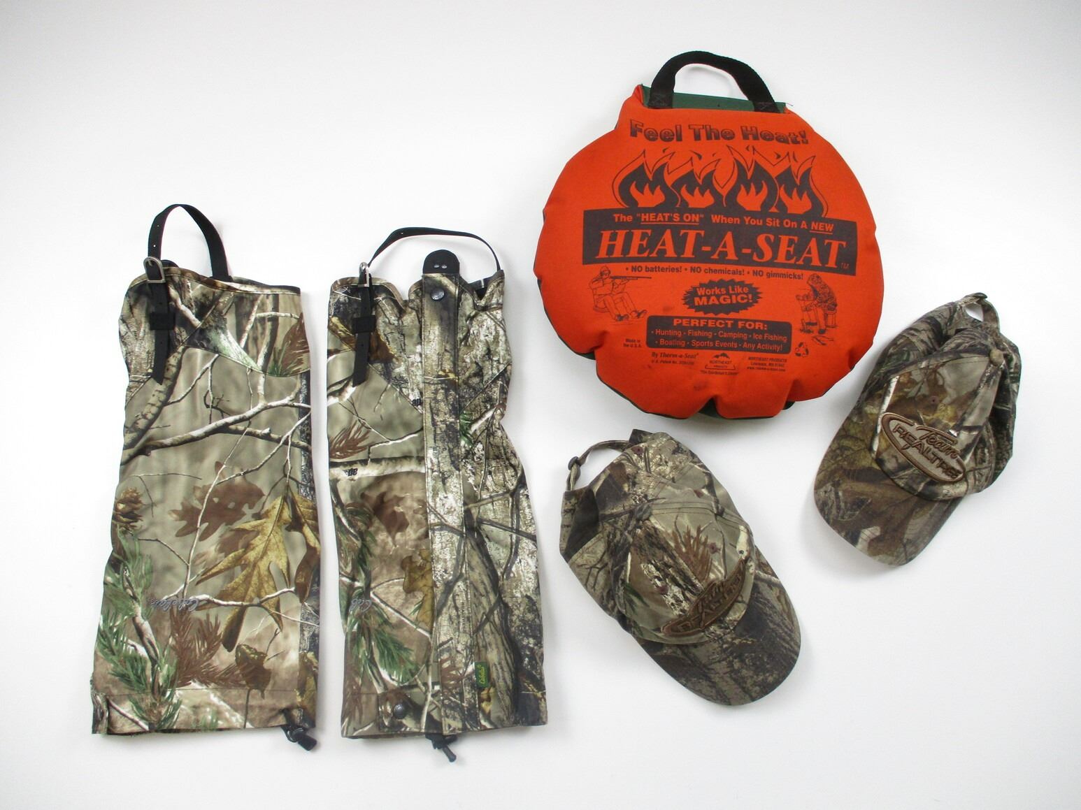 CABELA'S OUTDOORSMAN GAITERS & HATS ETC, (1) PAIR OF OUTDOORS GAITERS, WITH ADJUSTABLE STRAPS, (2) TEAM REAL TREE HUNTING CAMO HATS, WITH ADJUSTABLE BACK STRAPS, (1) HEAT -A-SEAT APPROX. 14" X 14"
