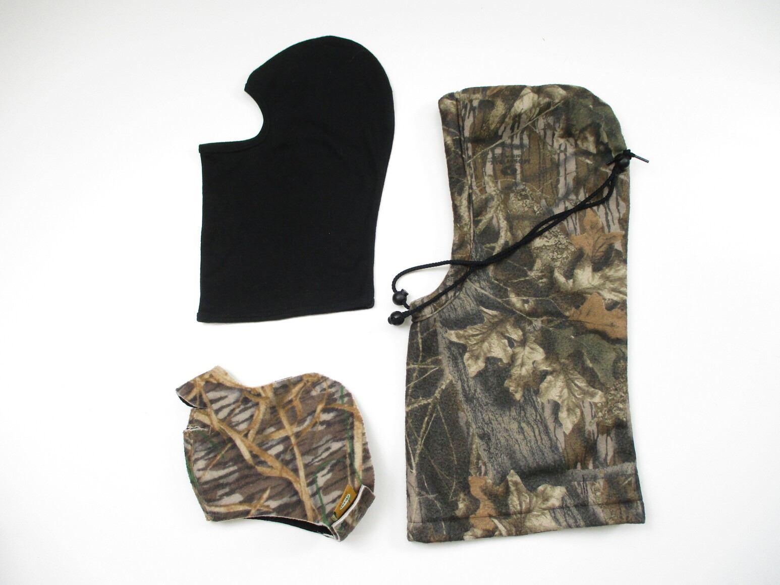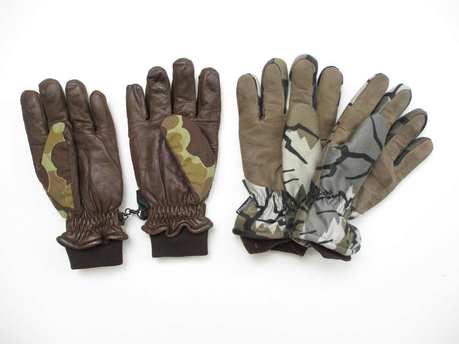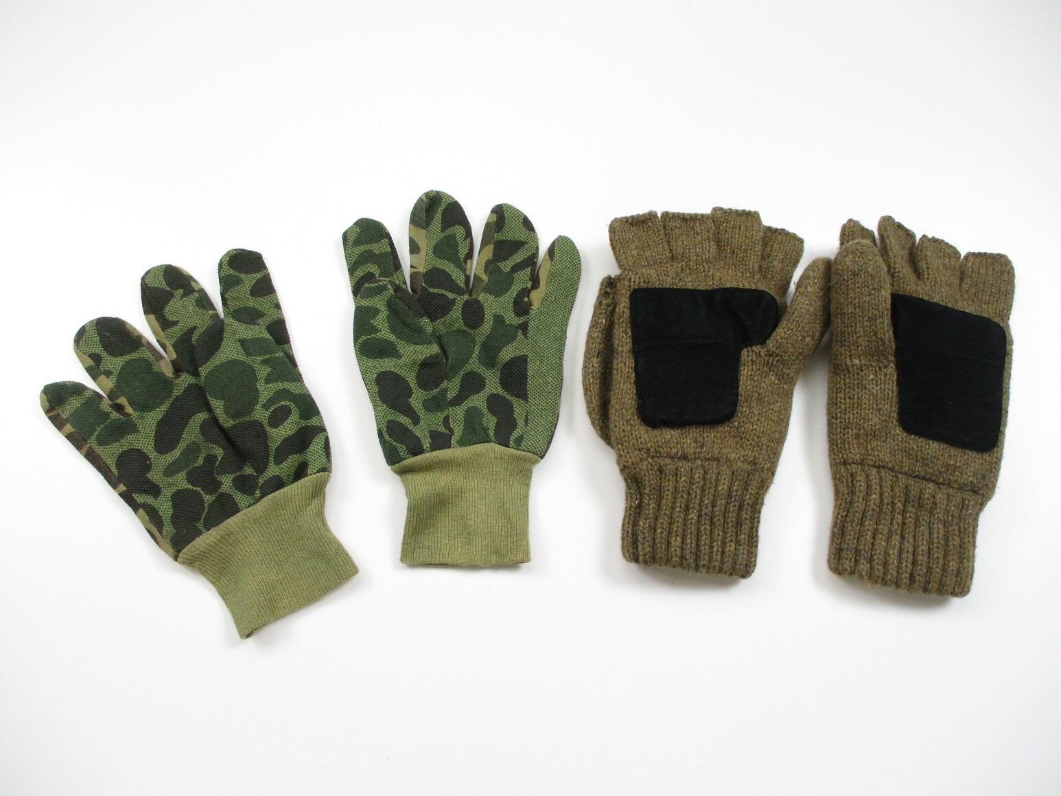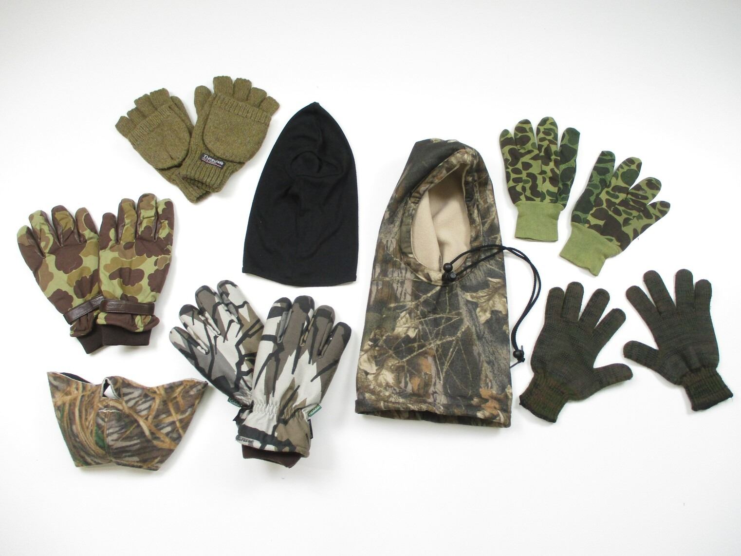 ASSORTED WINTER WEAR , INCLUDES: (2) PAIRS OF WORKER / MOVING GLOVES, BALACLAVAS, CAMO FACE MASK, (3) PAIRS OF HUNTING CAMO WINTER GLOVES. SIZES LARGE. SEE PHOTOS.