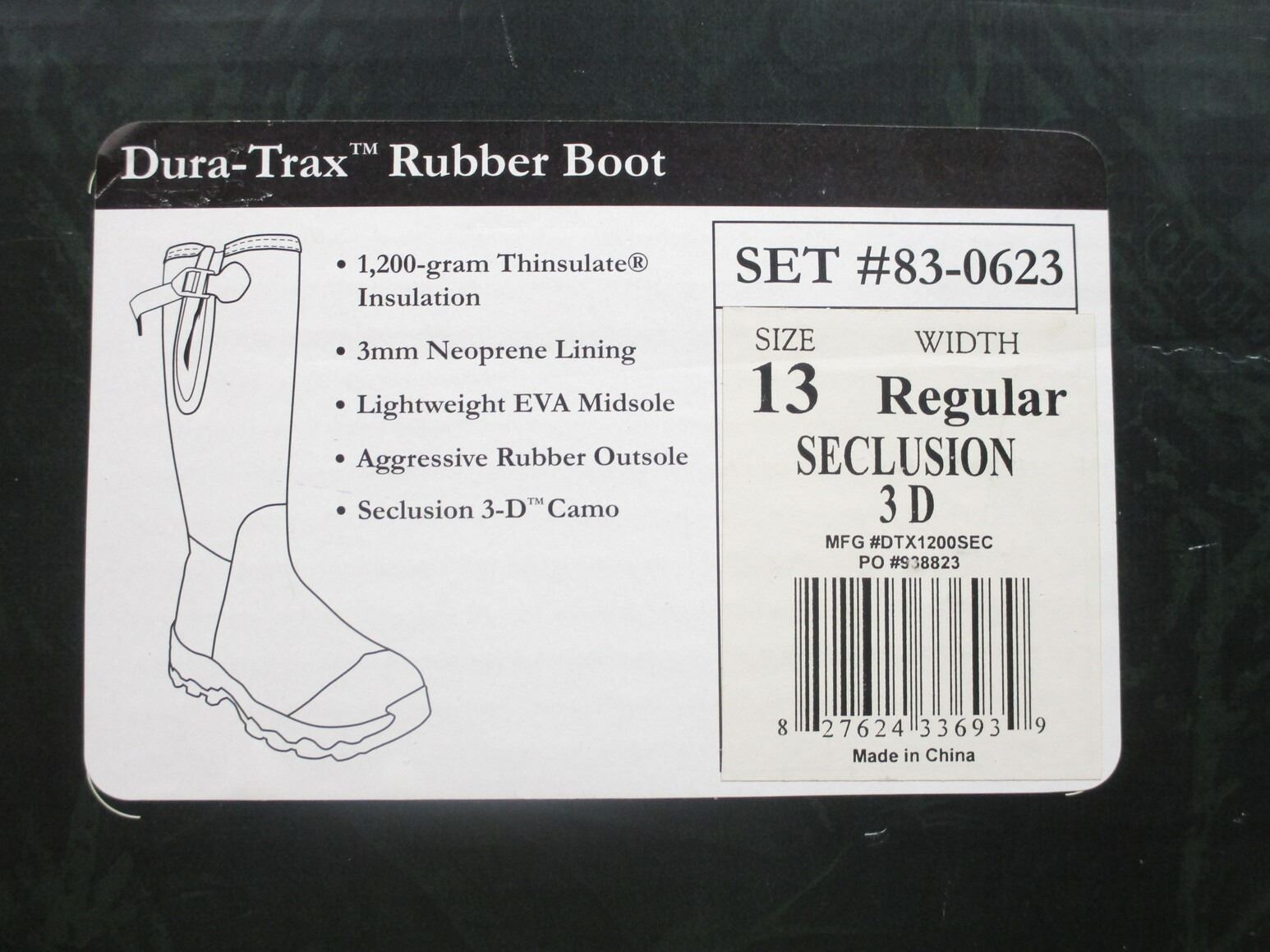 CABELA'S DURA-TRAX RUBBER BOOTS , SIZE: MENS 13, REGULAR WIDTH, BOOT APPEAR SLIGHTLY USED, NON STEEL TOE. COMES IN ORIGINAL PACKAGE.